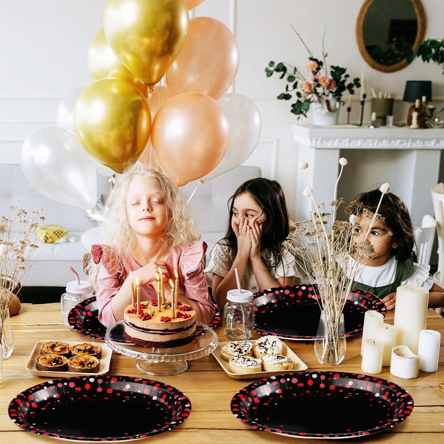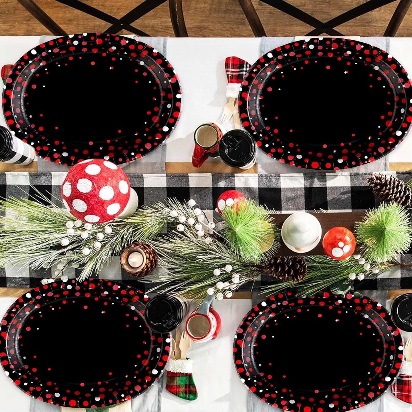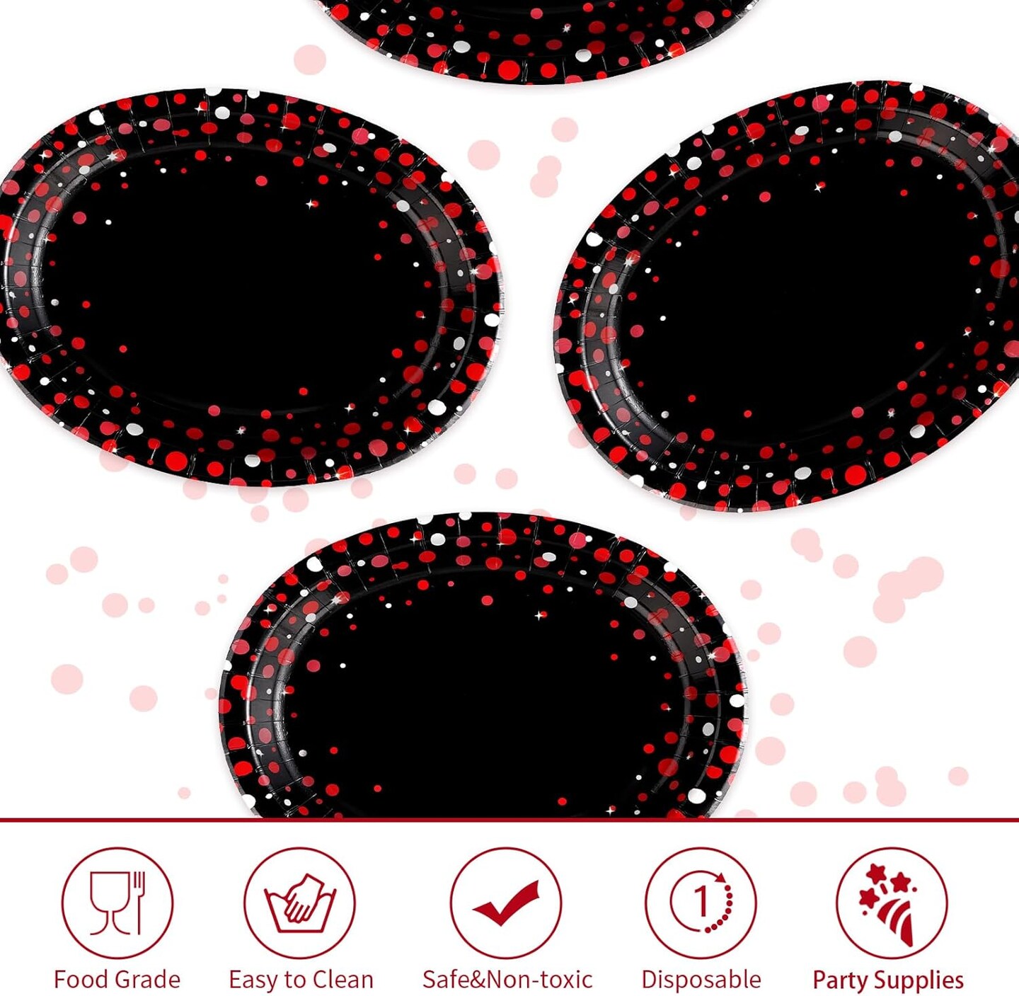 50 Pcs Large Red Dot on Black Party Plates - 10"x12" Disposable, Heavy Duty, 400 GSM, Perfect for Black & Red Birthday Decorations