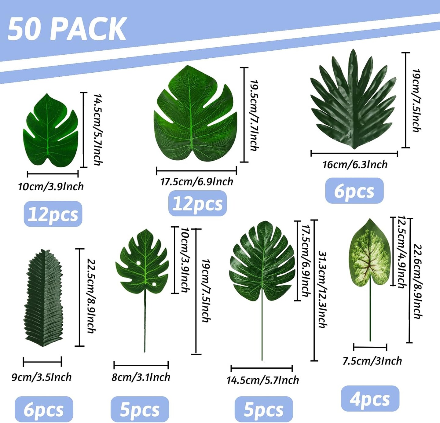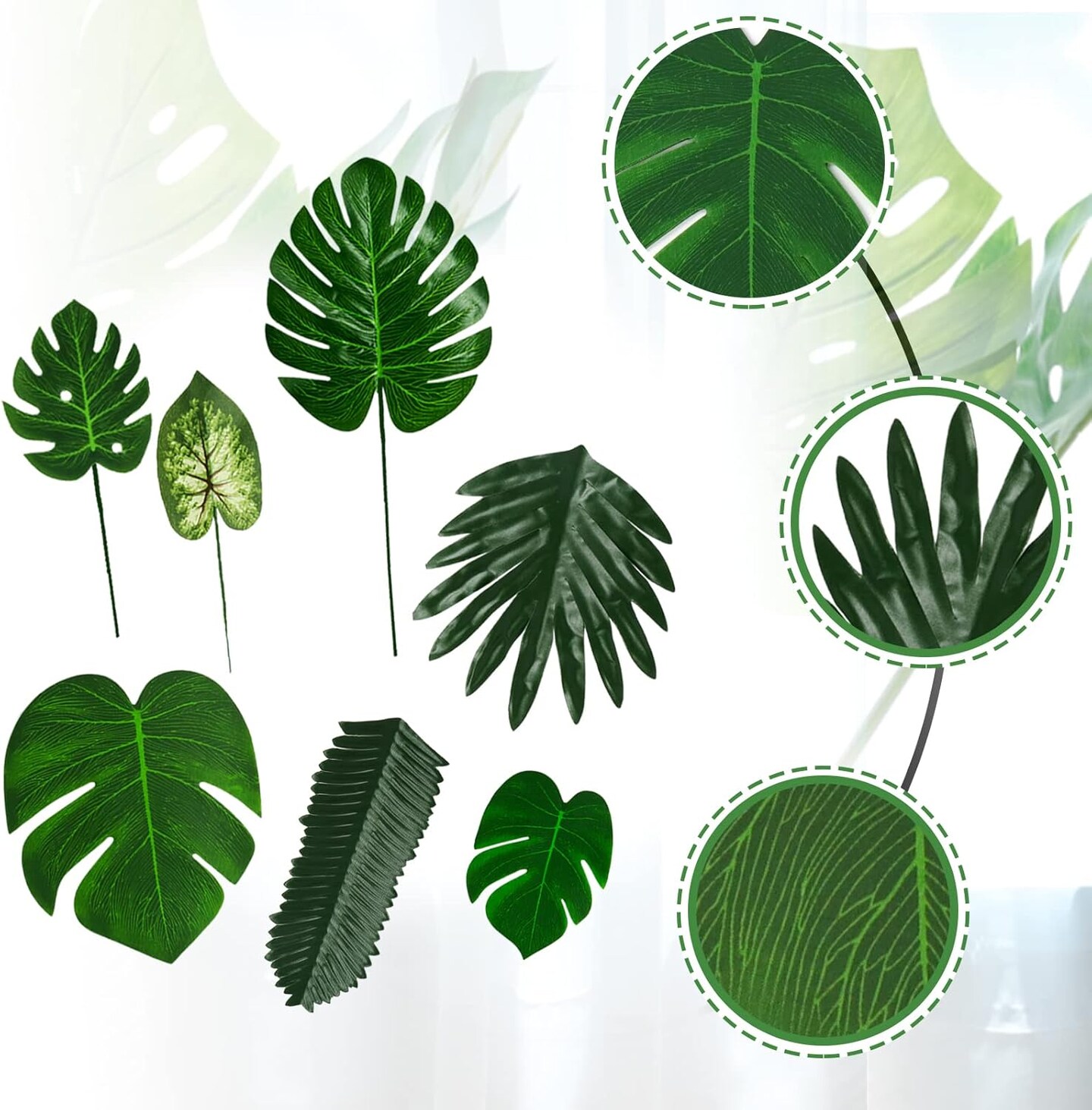 50 Pieces 7 Kinds Tropical Party Decorations Jungle Monstera Leaves Safari Leaves, Artificial Palm Leaves with Faux Stem for Hawaiian Luau Party Jungle Beach Table Leave Decorations