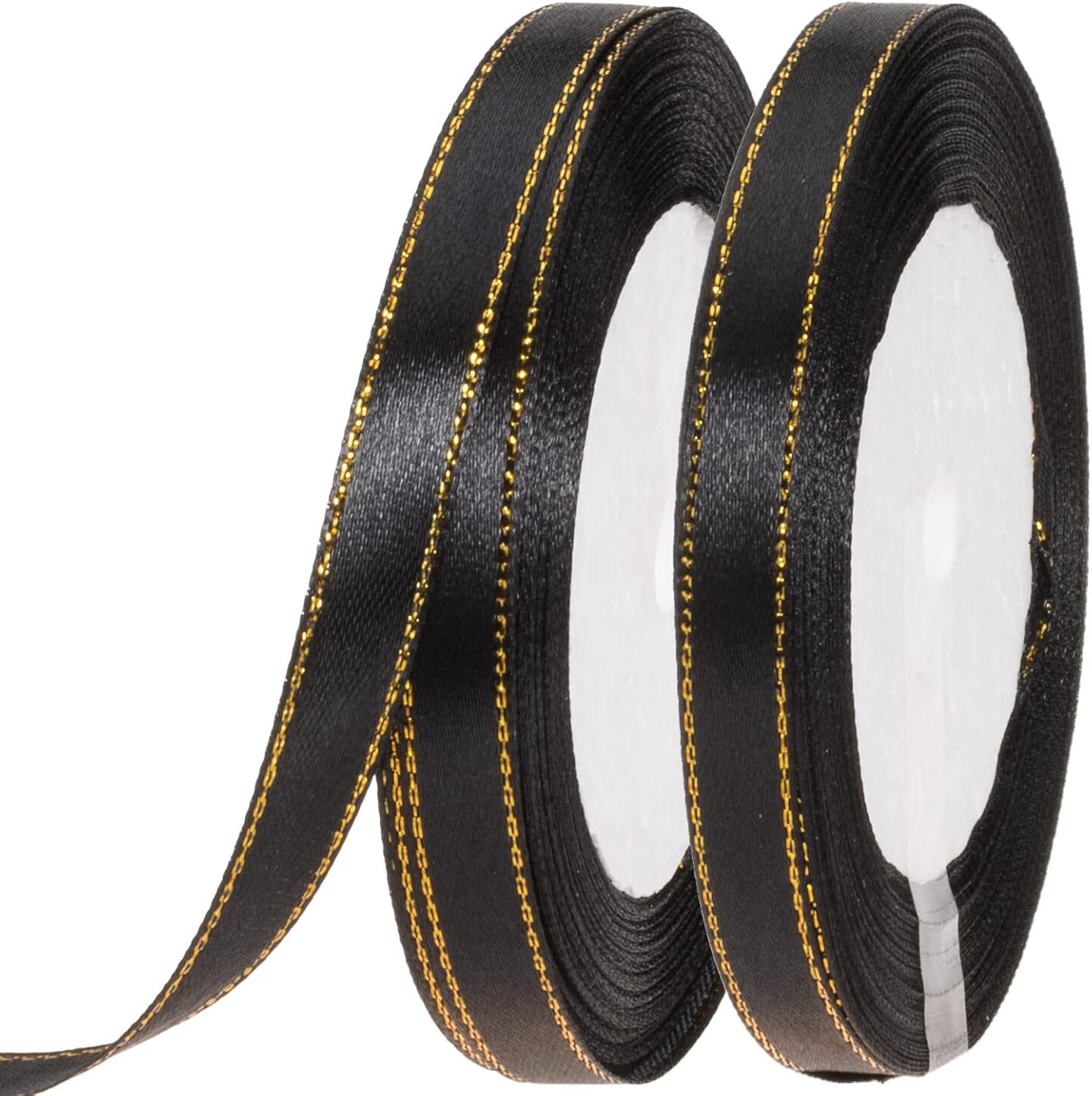 50 Yards 3/8 Inch Black Satin Ribbon with Gold Edges (Black) 900"L x 0.38"W