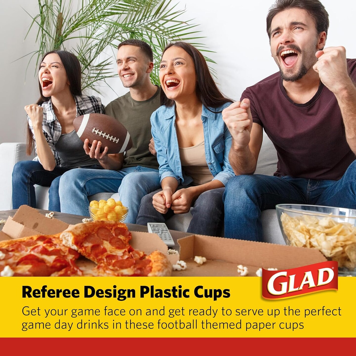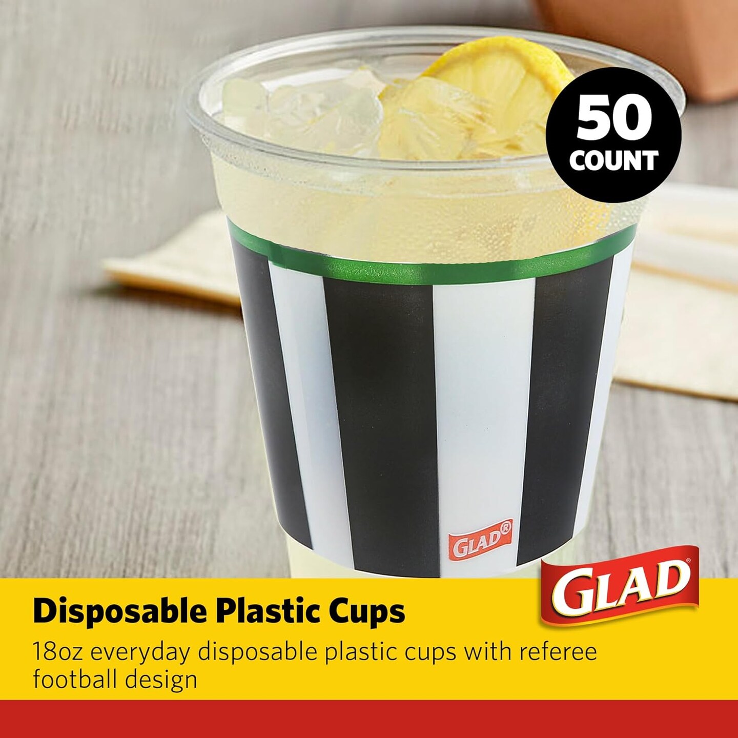 50-count of 18 oz clear plastic cups with a referee football print. Durable and sturdy, perfect for any occasion or event.