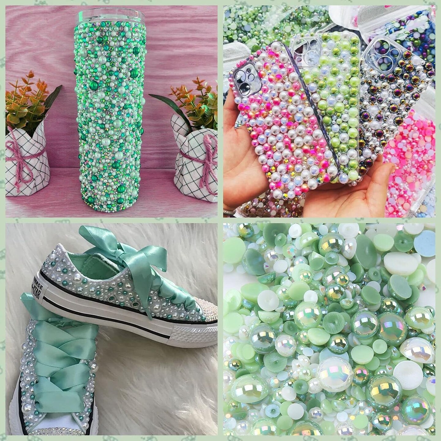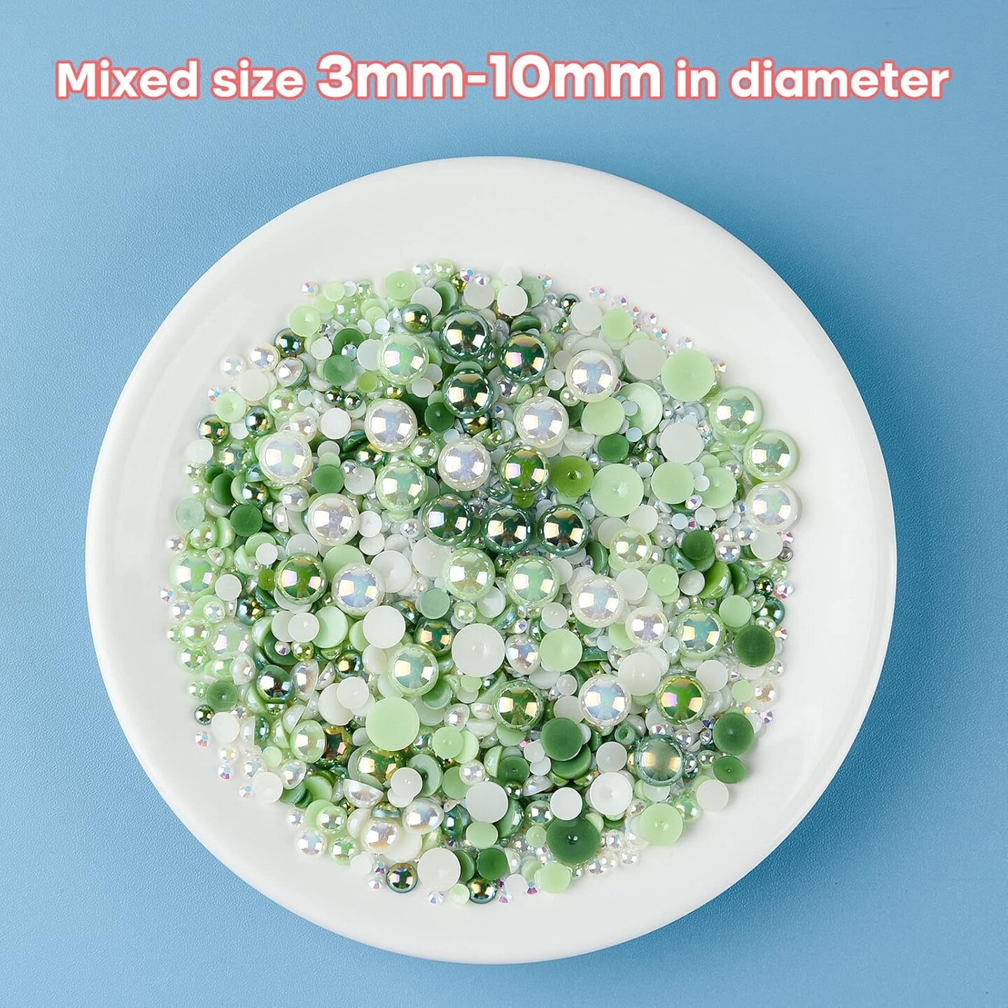 50g Mix Flatback Rhinestones Half Pearls for Crafts Mixed Size 3mm-10mm Flat Back Rhinestones for Crafts Flatback Pearls for DIY Tumblers Mugs Nail Art Shoes Clothes (Fresh Green Series)