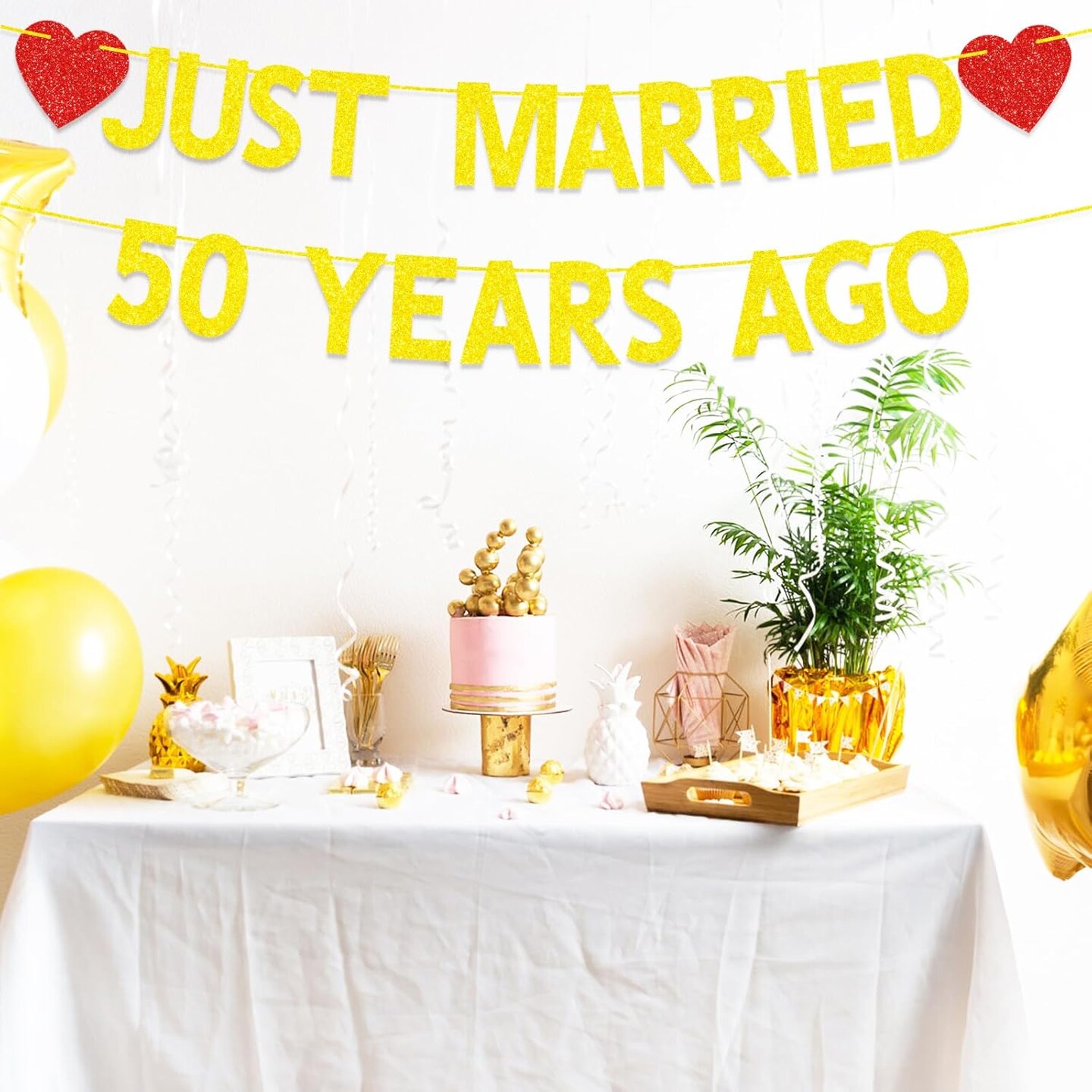 50th Wedding Anniversary Party Banner Decorations, Gold Red Glitter (Gold)