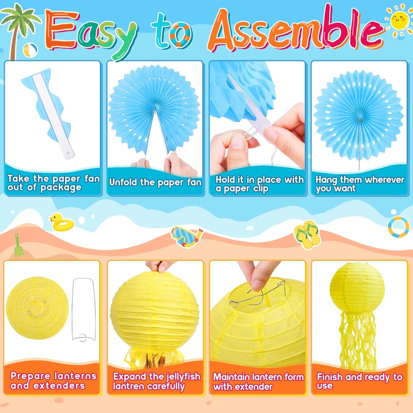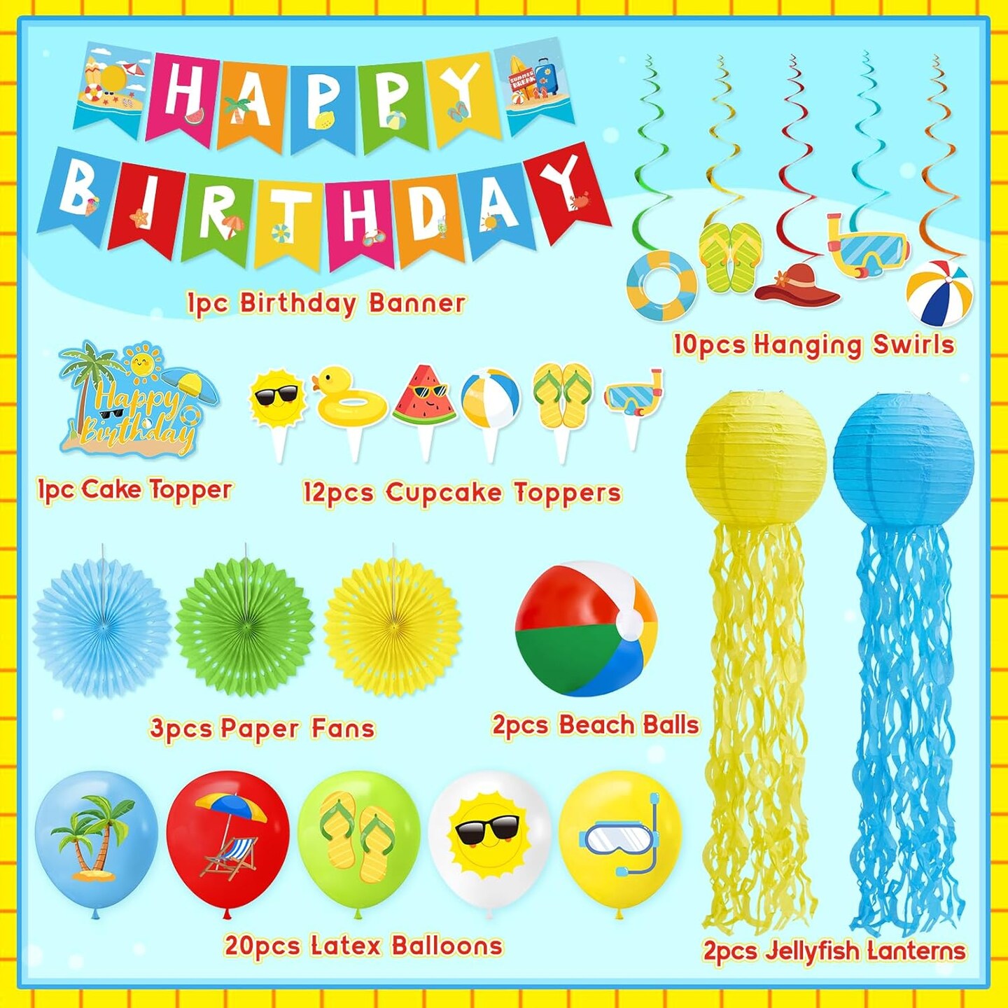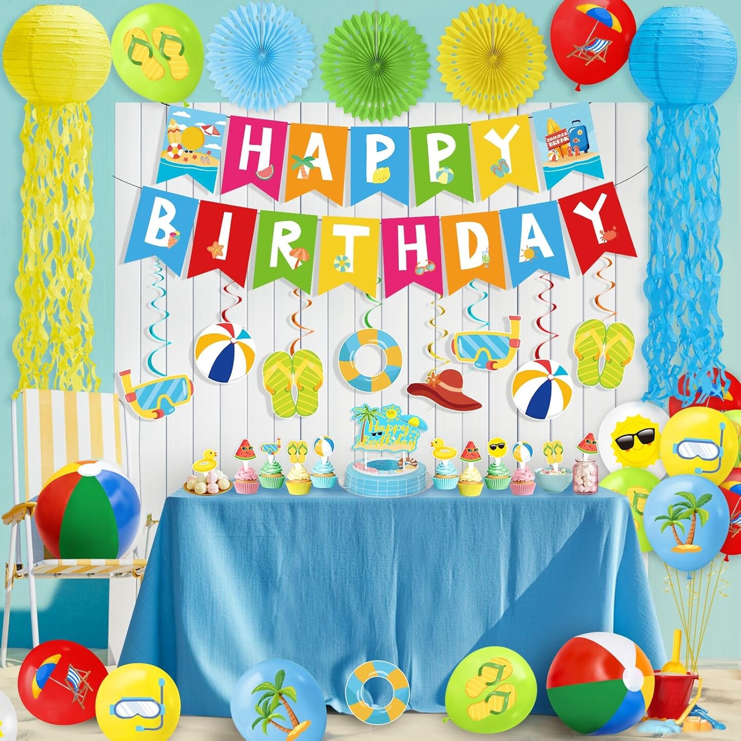51 Pcs Summer Beach Party Decorations with Balloons, Banner, Beach Balls, Cupcak Toppers, and Jelly Fish Lanterns