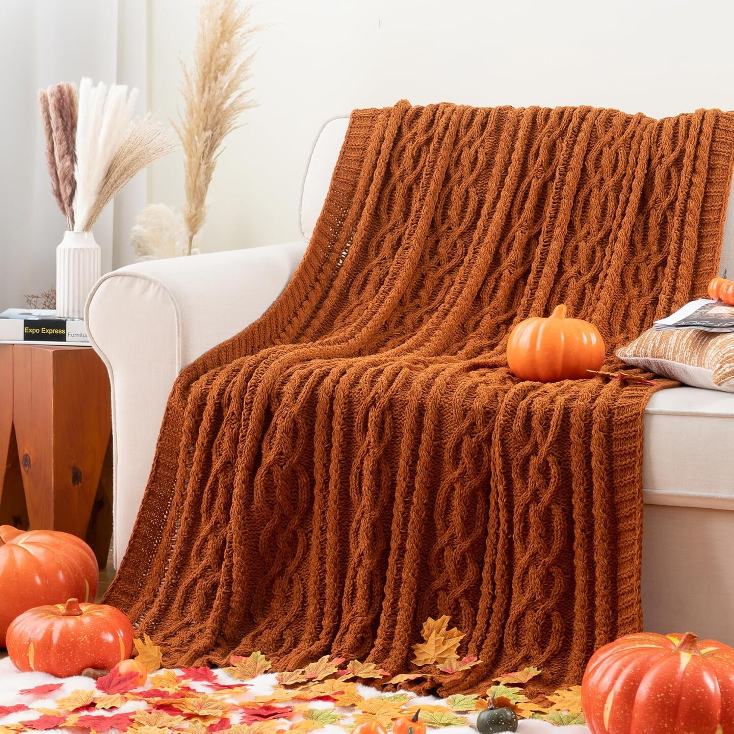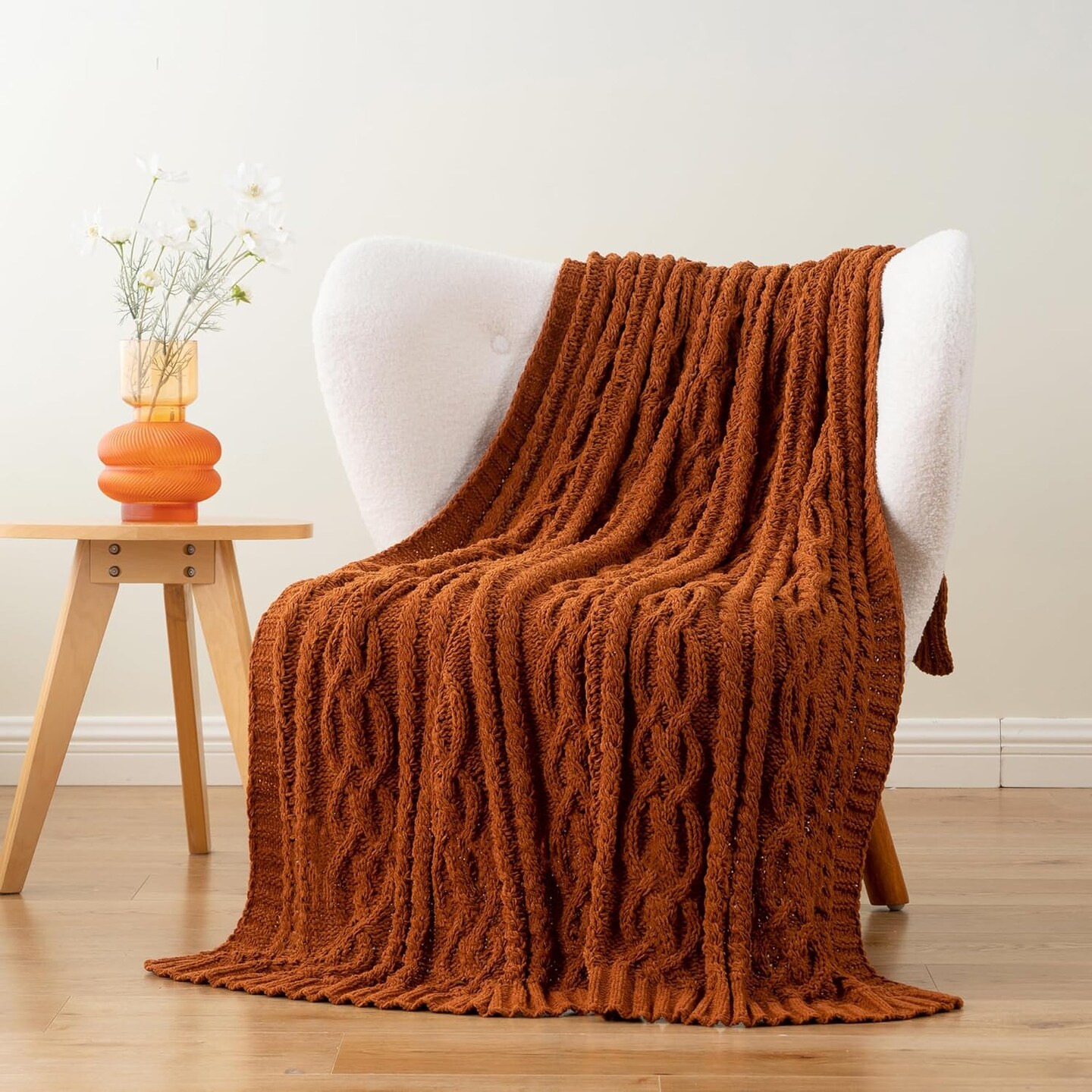 51x67 Rust Chenille Cable Knit Throw Blanket Soft Warm Boho Decor for Couch Bed