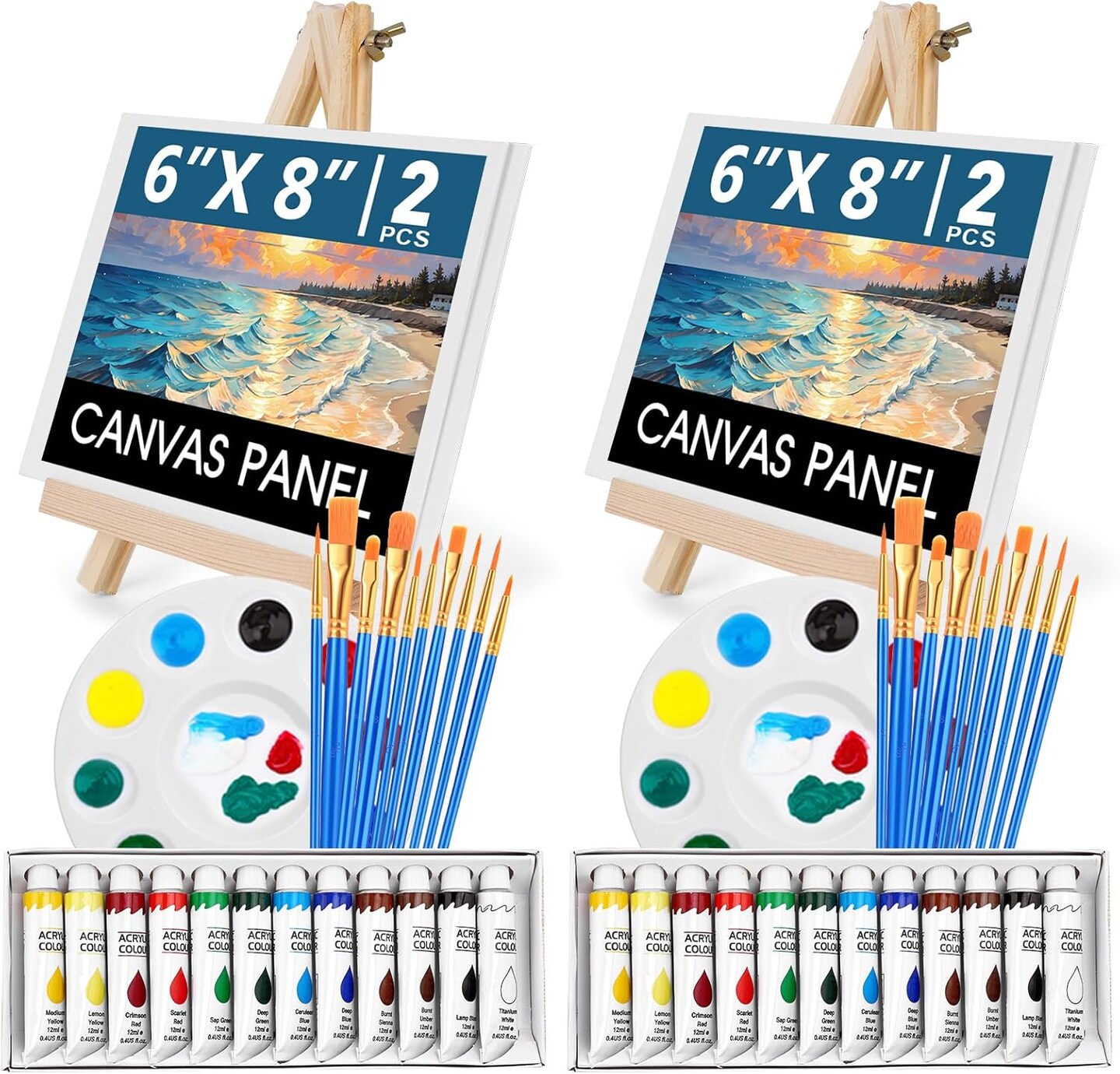 52PCS Acrylic Paint Canvas Set, Acrylic Painting Kit with 2 Set of 12 Colors Acrylic Paint,Paint Brushes,Canvas, Wooden Easels, Art Plates, Art Painting Supplies for Kids Adults