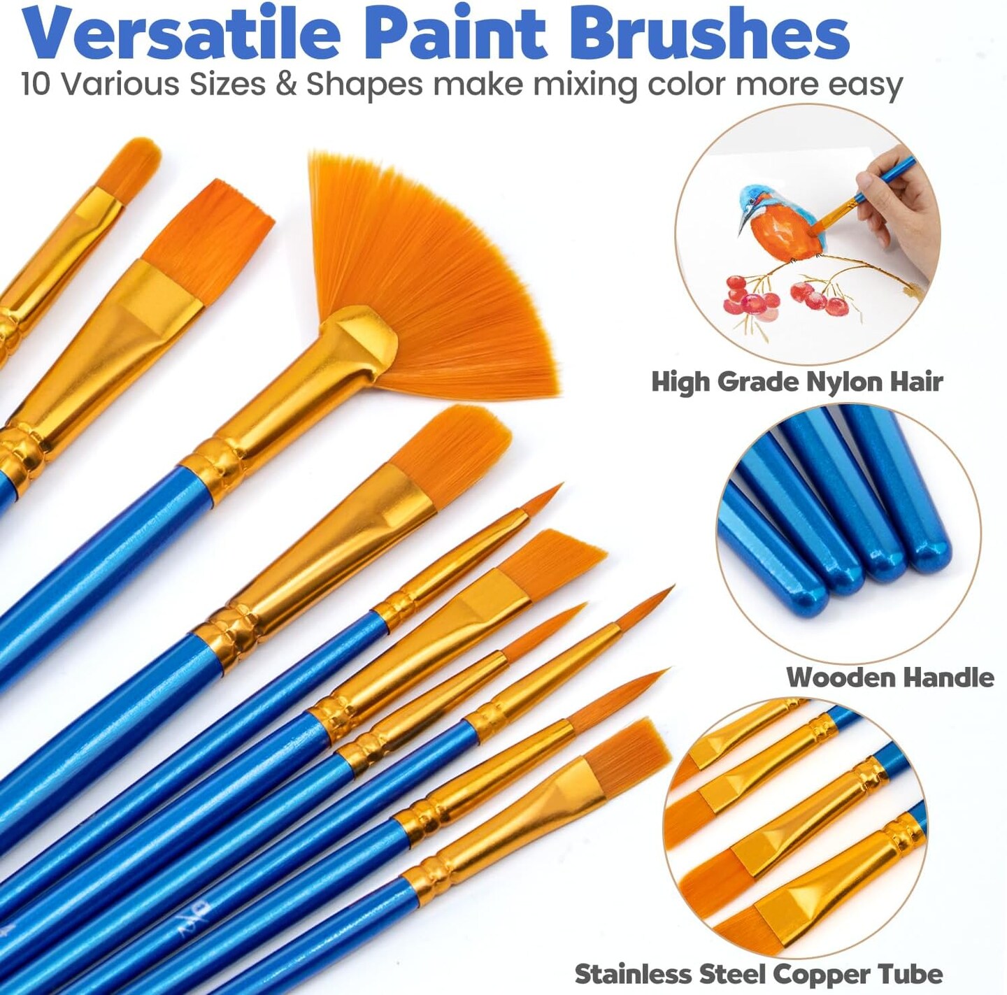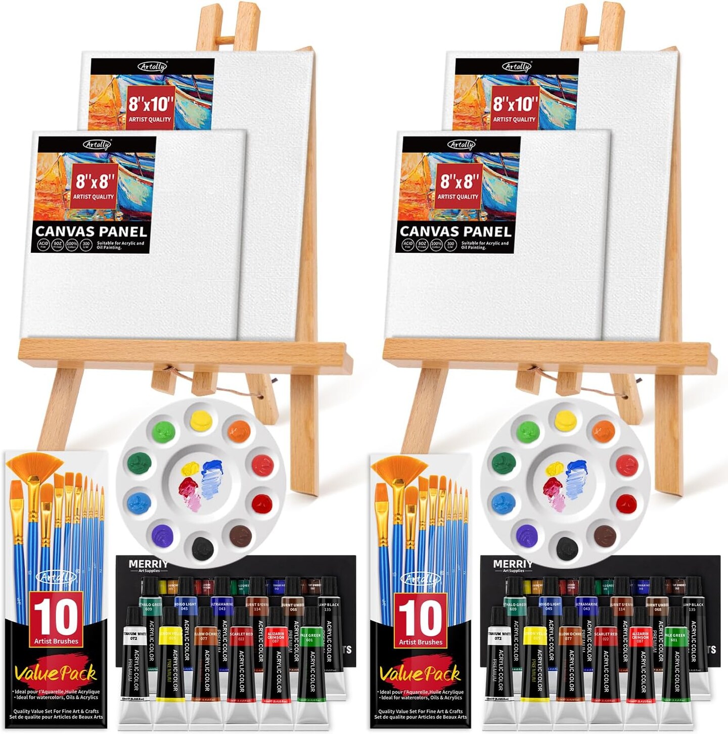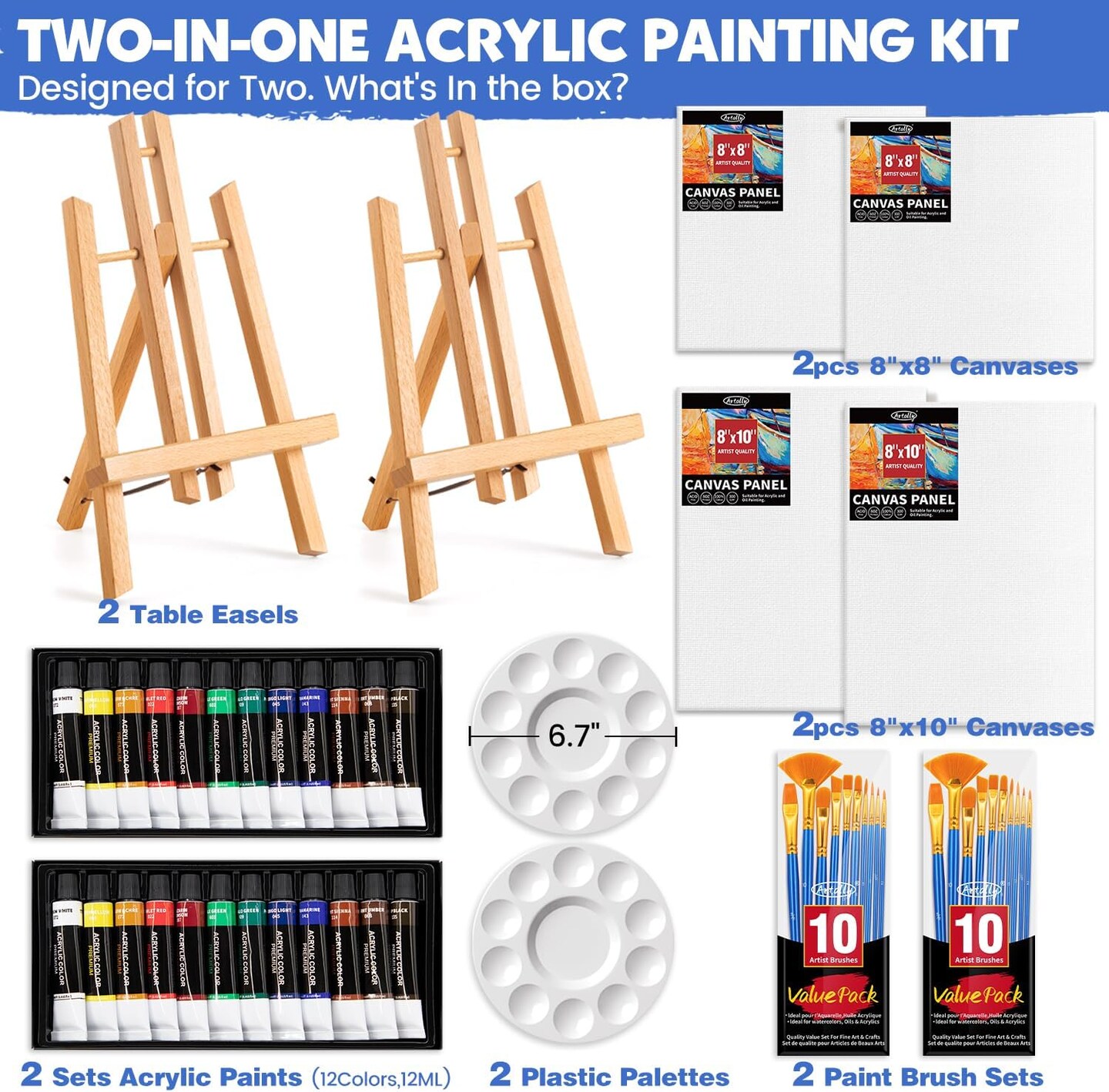 52Pcs Painting Supplies Kit with 2 Beechwood Easel, 2 Set 12 Acrylic Paints, 20 Brushes, 4 Canvases