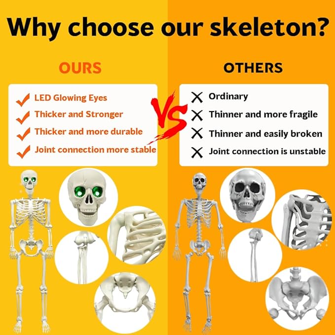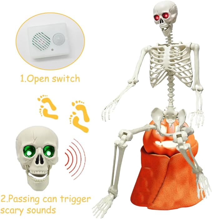 5.4FT Full Size Halloween Skeleton, Life Size Posable Skeleton with Glowing Eyes Scary Sound, Plastic Skeleton with Movable Joints for Halloween Decoration