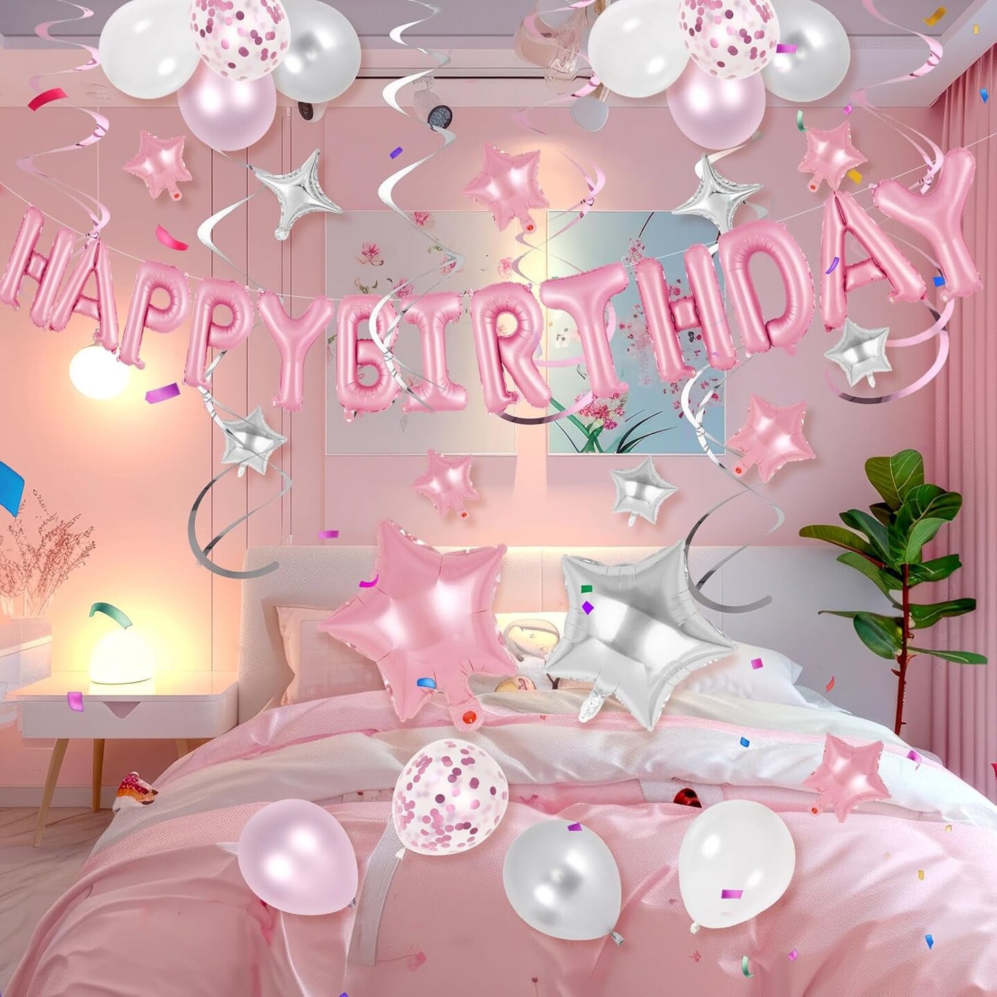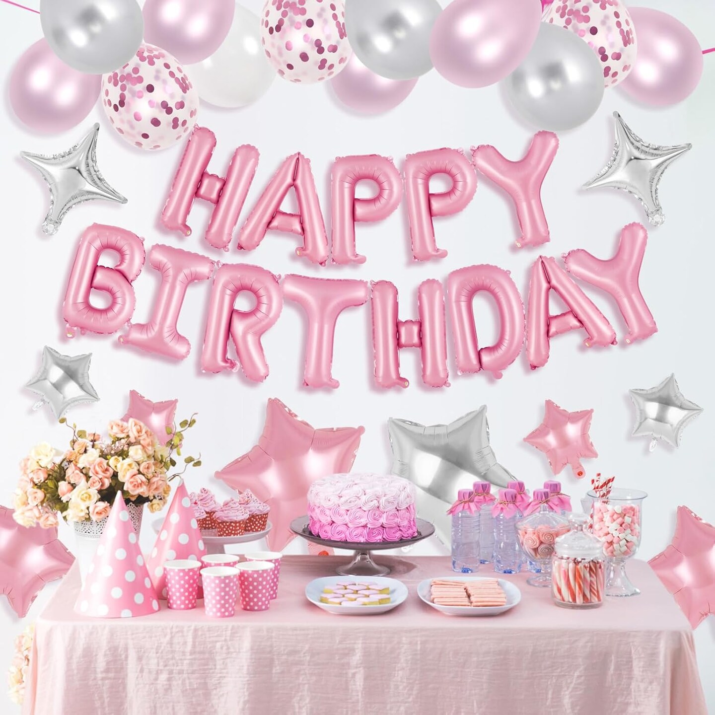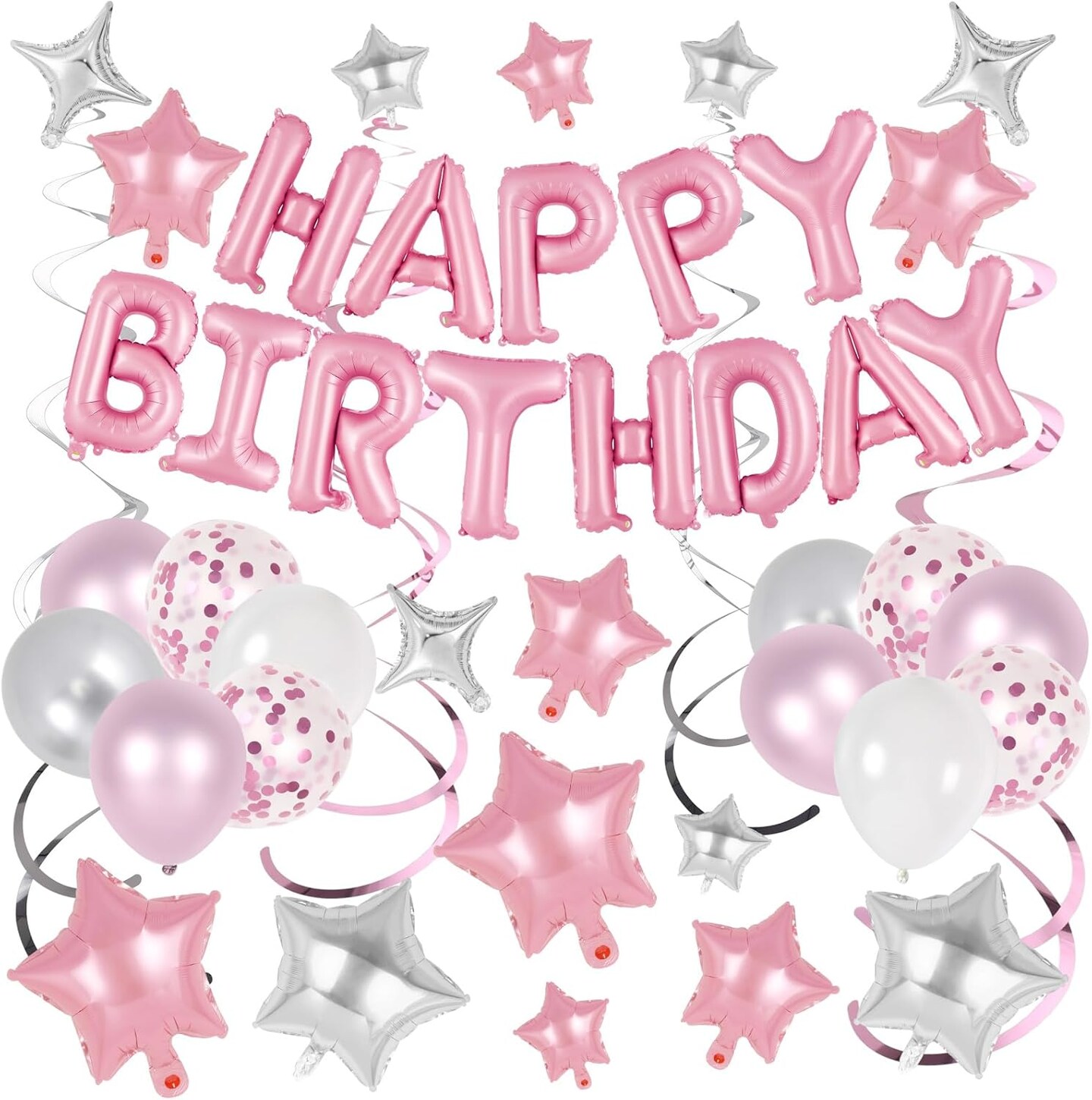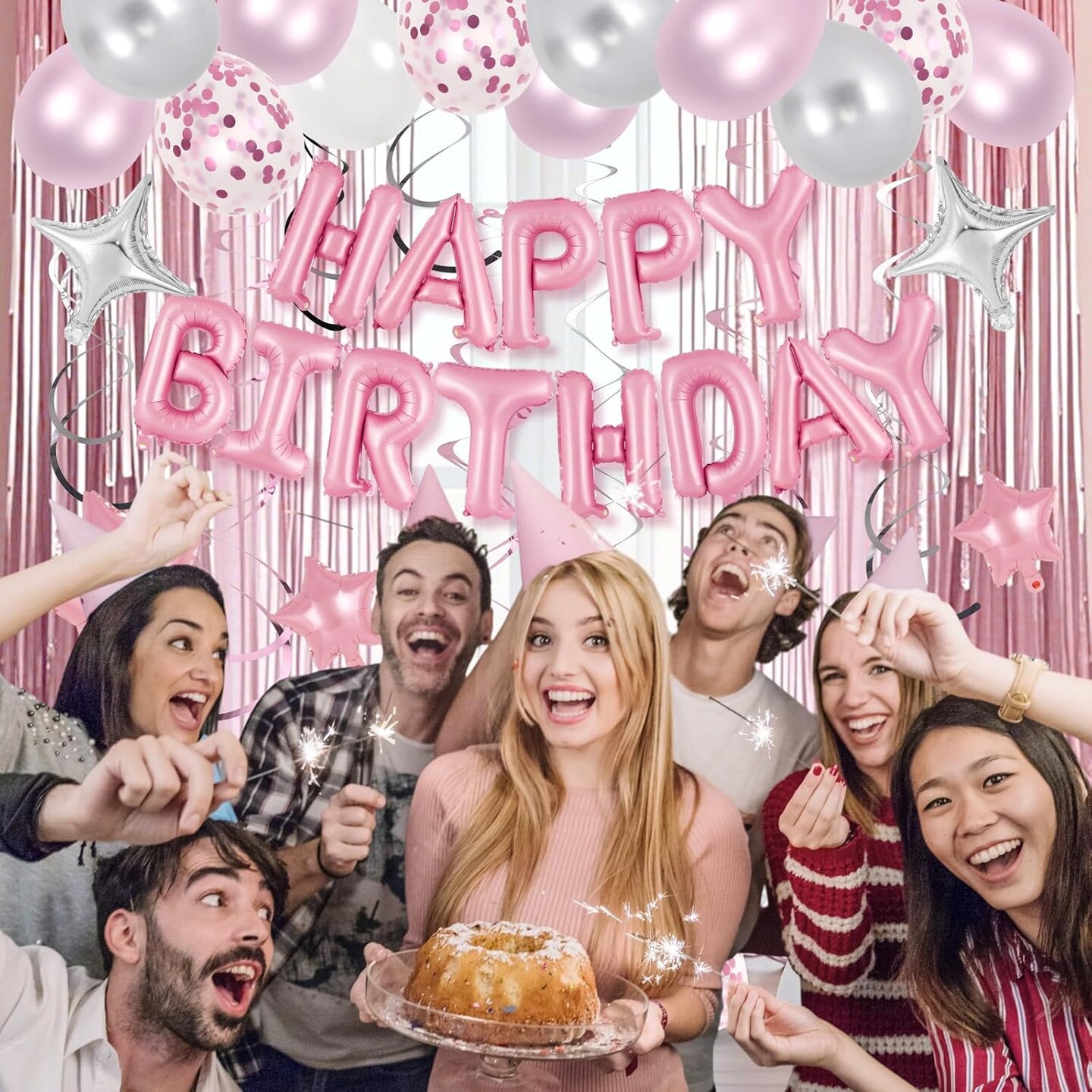55 Pcs Happy Birthday Balloon Set – Pink Foil Letters, Star Foil Balloons, Latex Balloons & Hanging Swirls – Party Decorations for Women, Men, Boys & Girls (Pink)