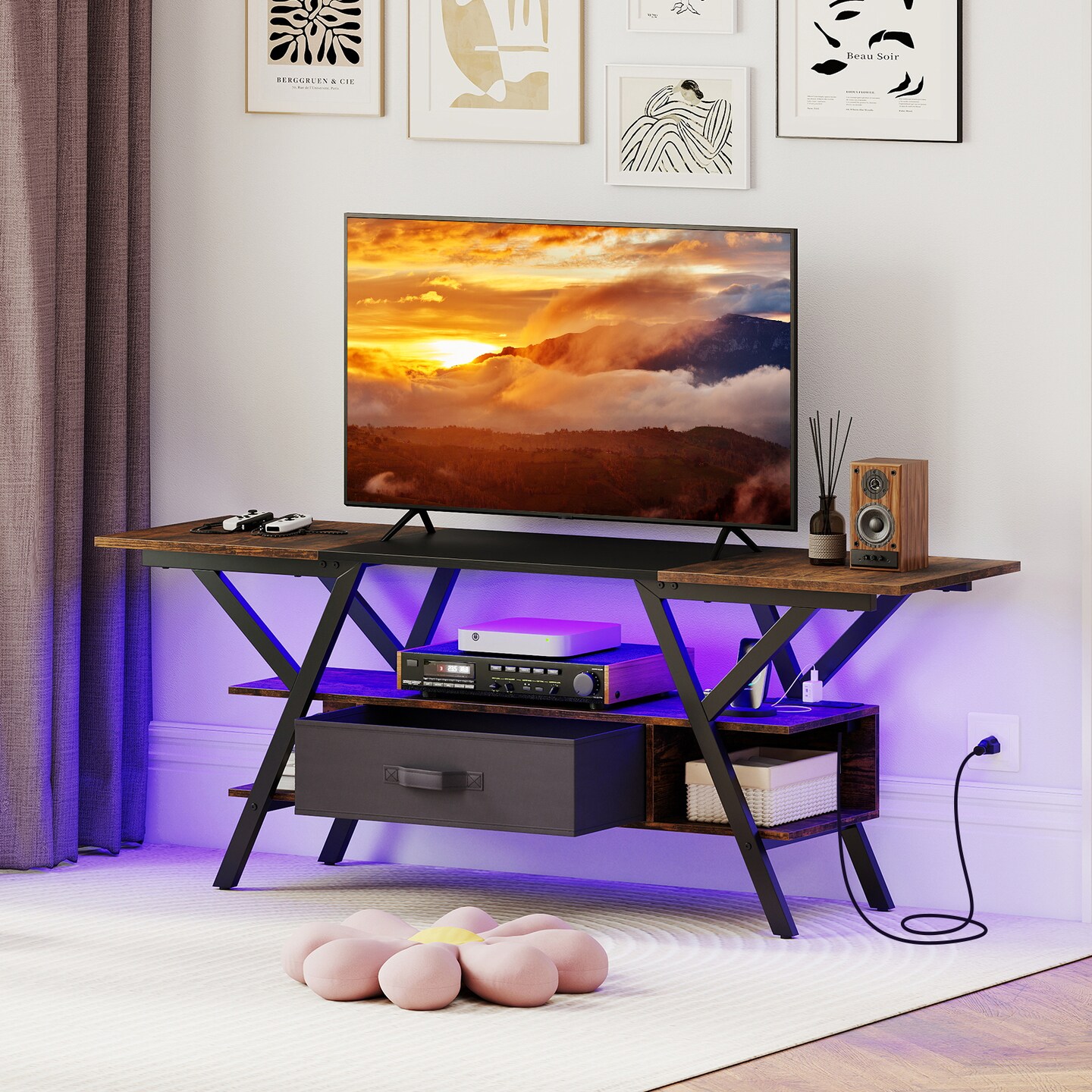 55-Inch Entertainment Center with LED Light Show, USB Charging Station and Metal Legs Storage Drawer