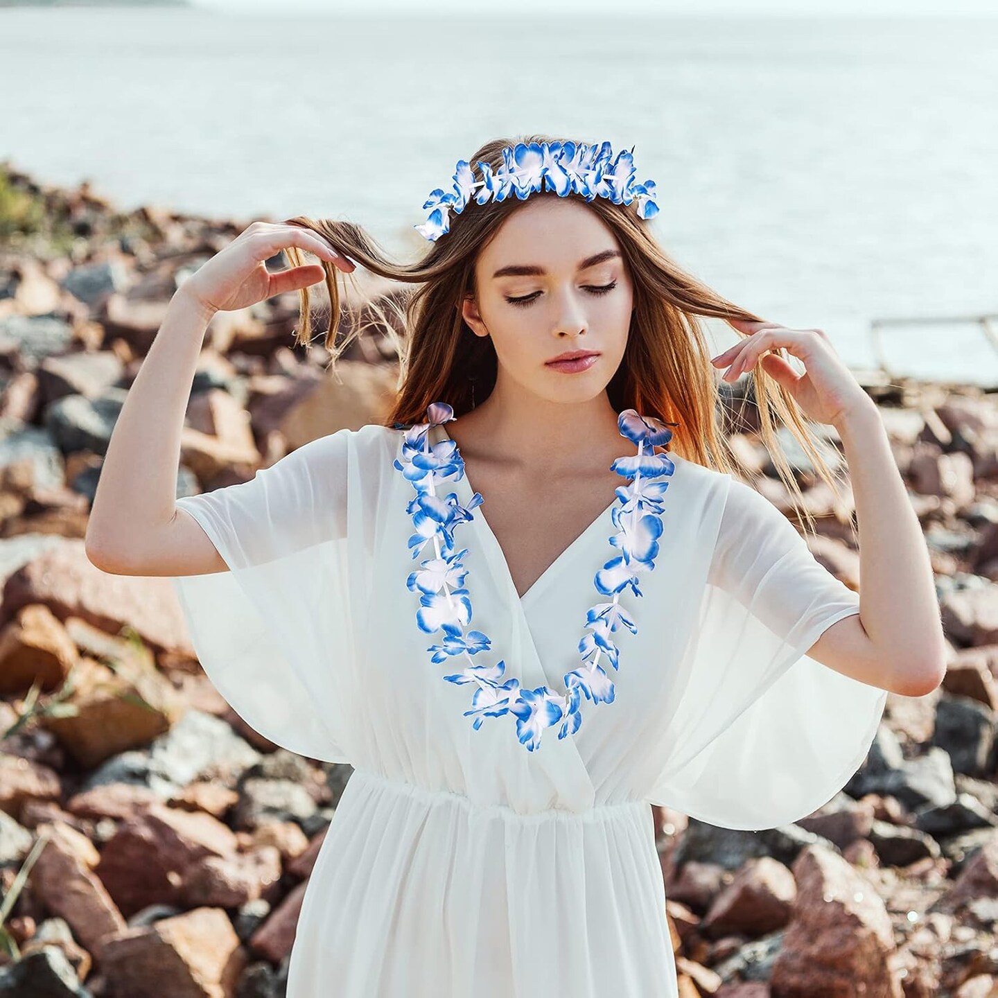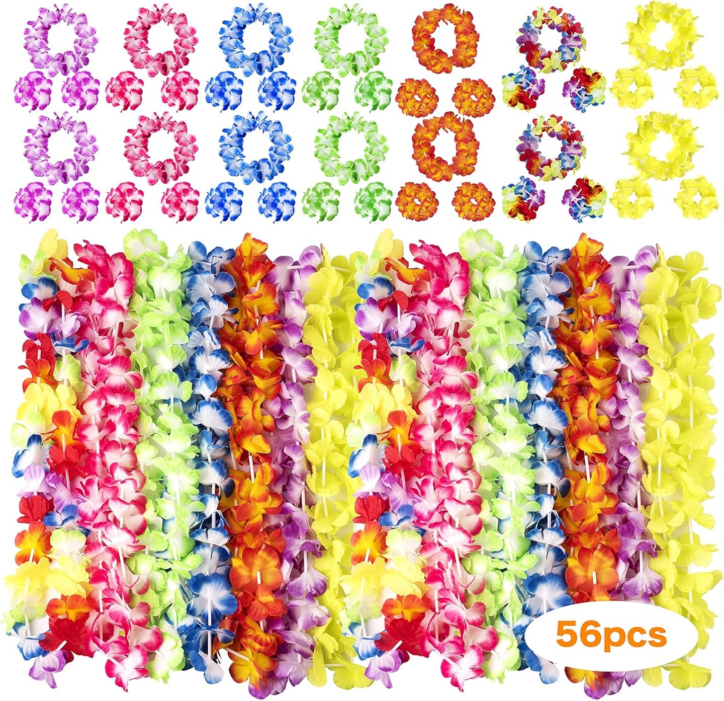56 Counts Hawaiian Leis, Luau Party Supplies of Elastic Flowers Necklaces, Headbands and Wristbands - Tropical Hawaiian Decorations, Beach Party Decorations, Birthday Party Favors