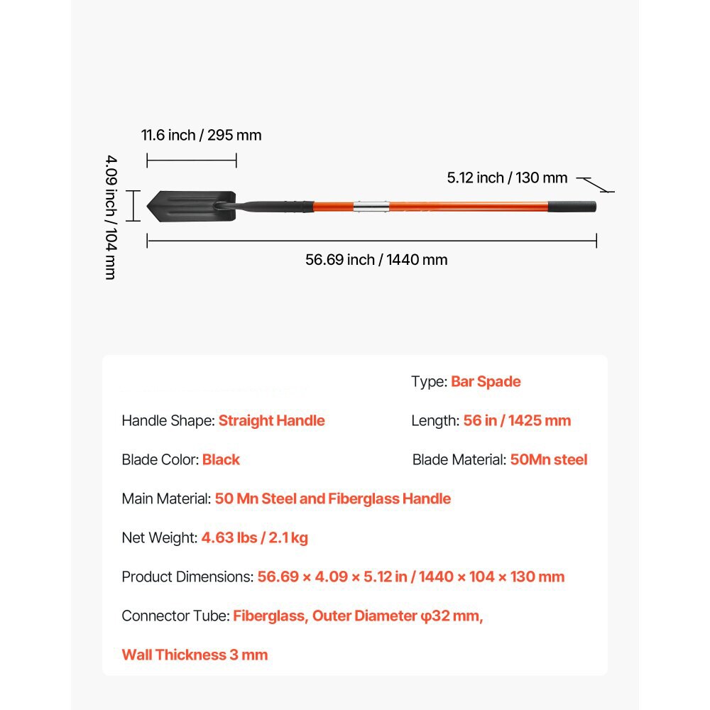 56-Inch Bar Spade with Black Alloy Steel Blade and Fiberglass Handle for Digging and Trenching