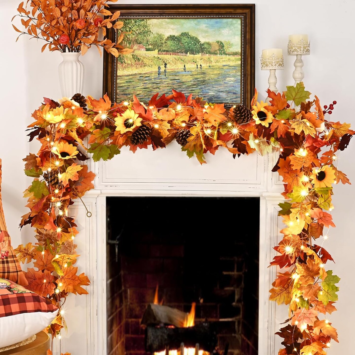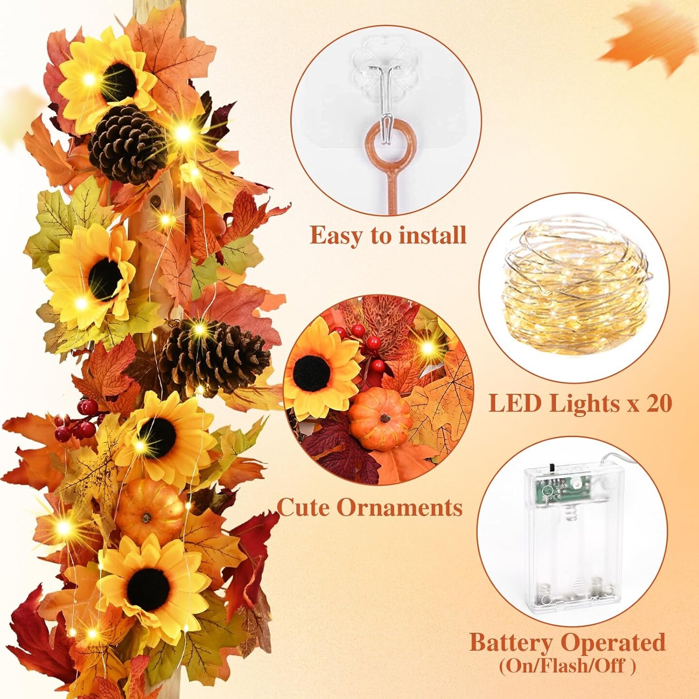 5.7 Ft/Piece Lighted Sunflower Autumn Leaves Garland with Berry Pumpkin Decoration, Fall Flower Garland for Wedding Outdoor Mantle Thanksgiving Decor (1Pcs)