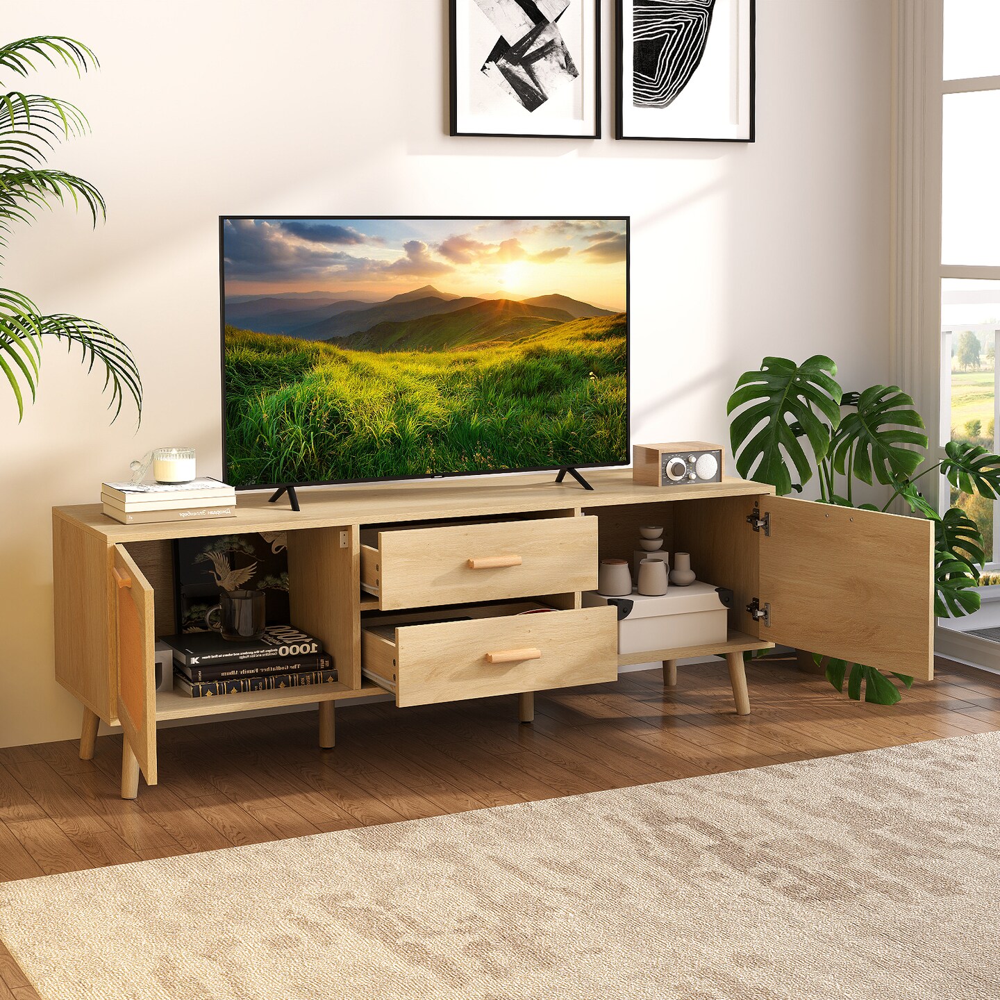 59" TV Console Table with Rattan Doors 2 Drawers and Cabinets Wood Media Stand for Living Room
