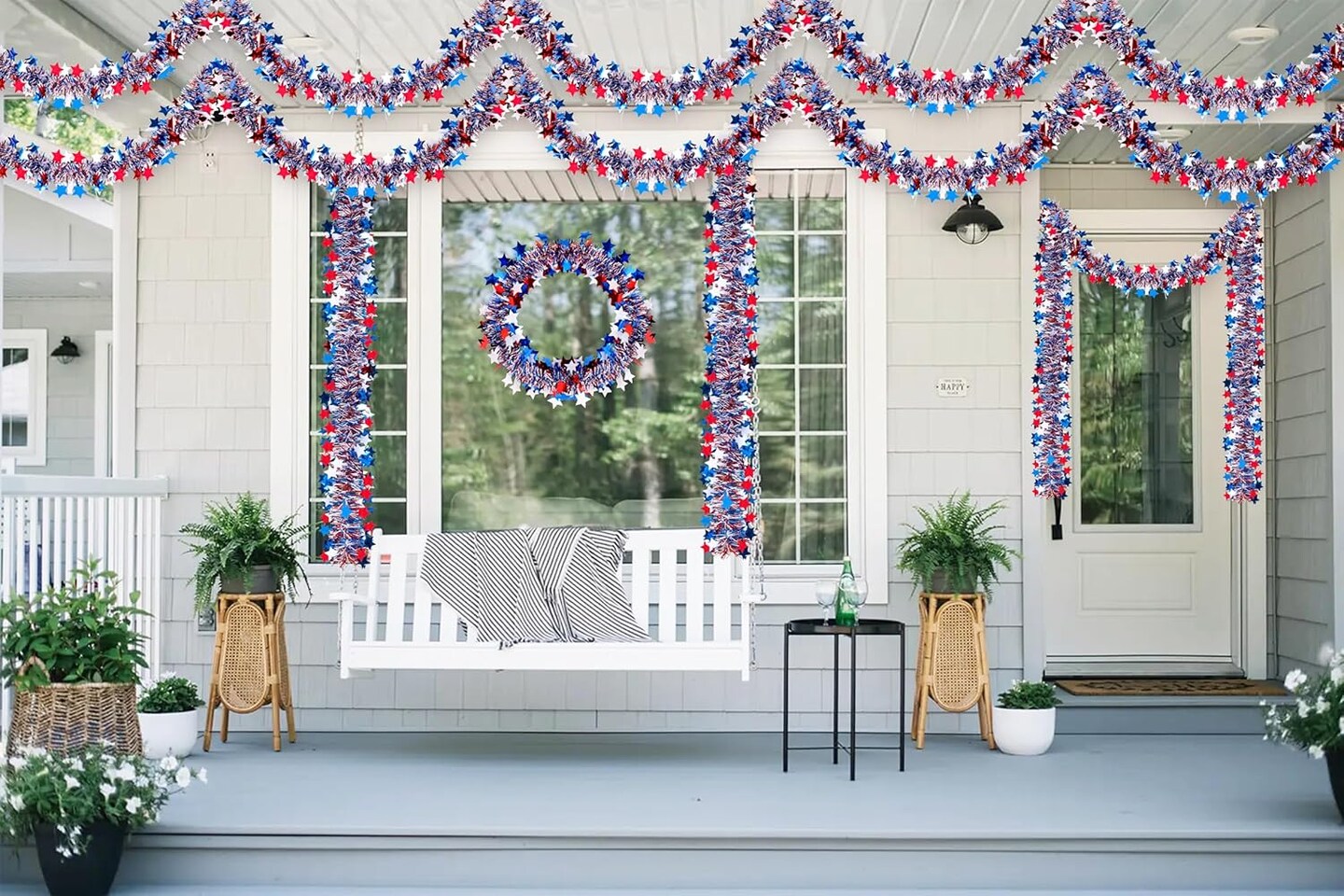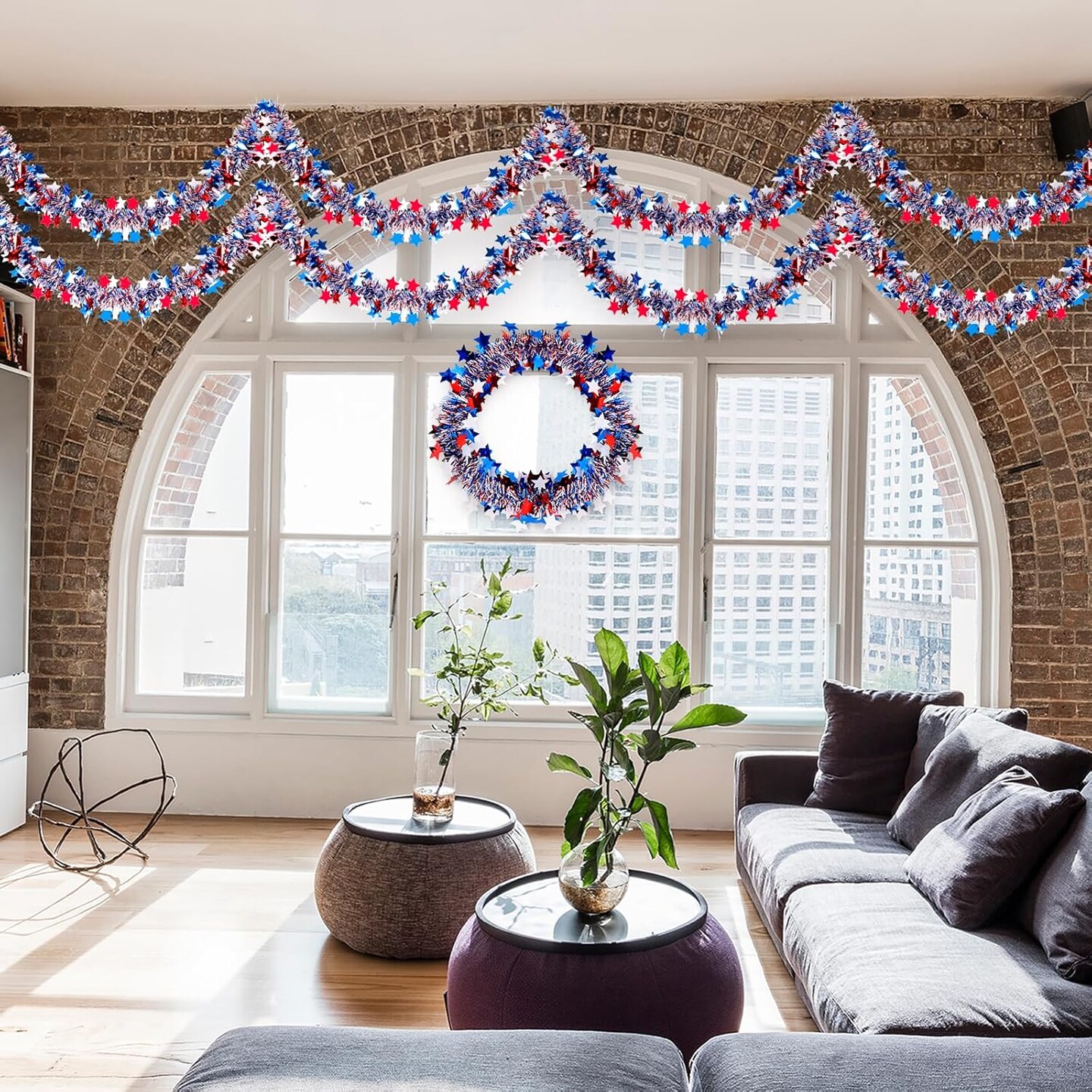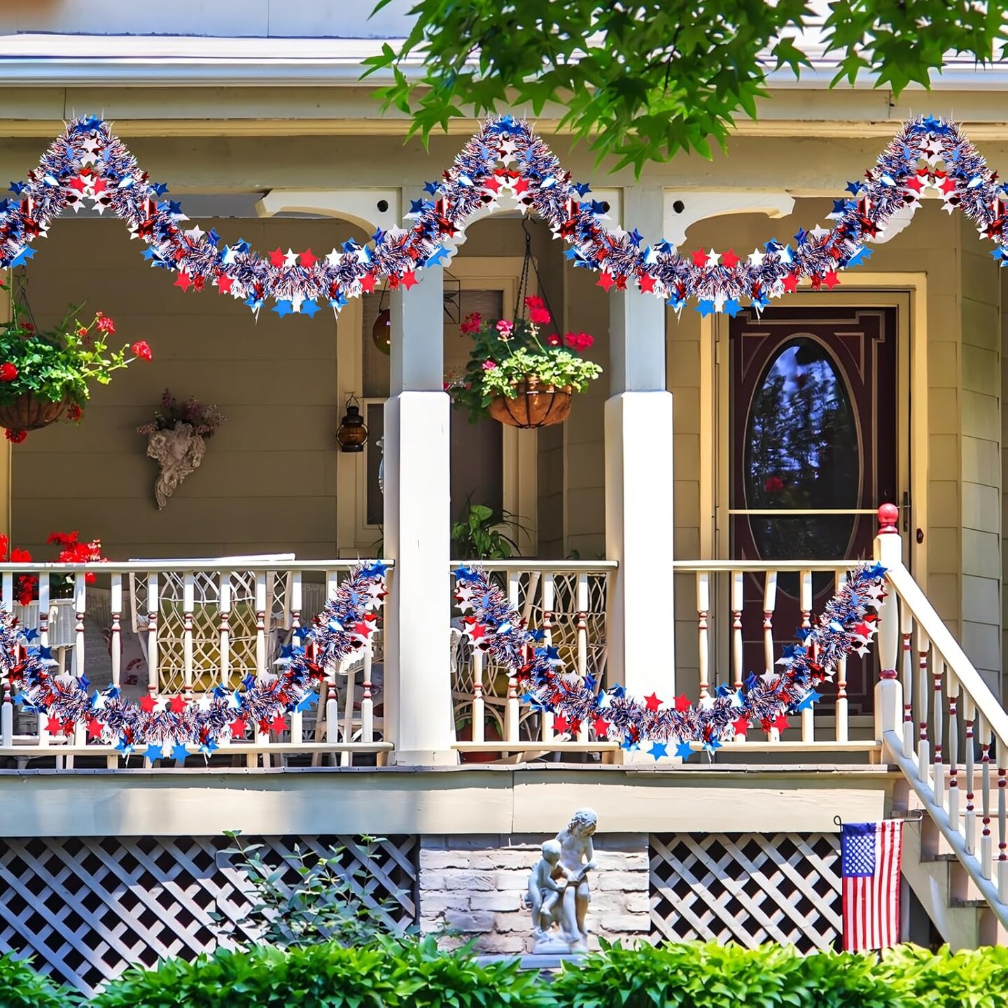 59.06 ft (9-Piece) 4th of July Tinsel Garland Decorations, Red White & Blue Patriotic Fringe Decor for Independence Day, Memorial Day, and Party Supplies