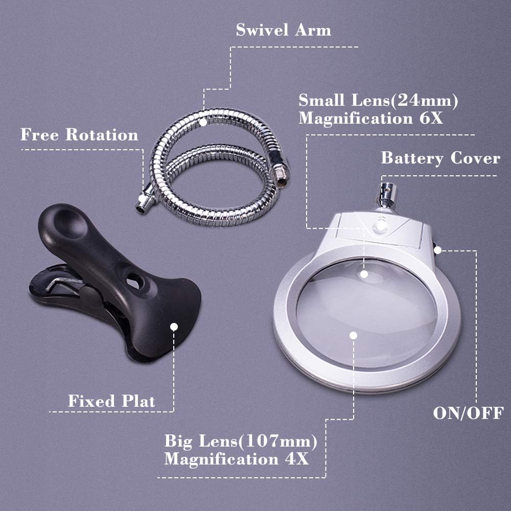 5D Diamond Painting Tools Magnifier LED Light with Clamp, Folding Design with 1 Glass Lens 4X & 6X Magnifier