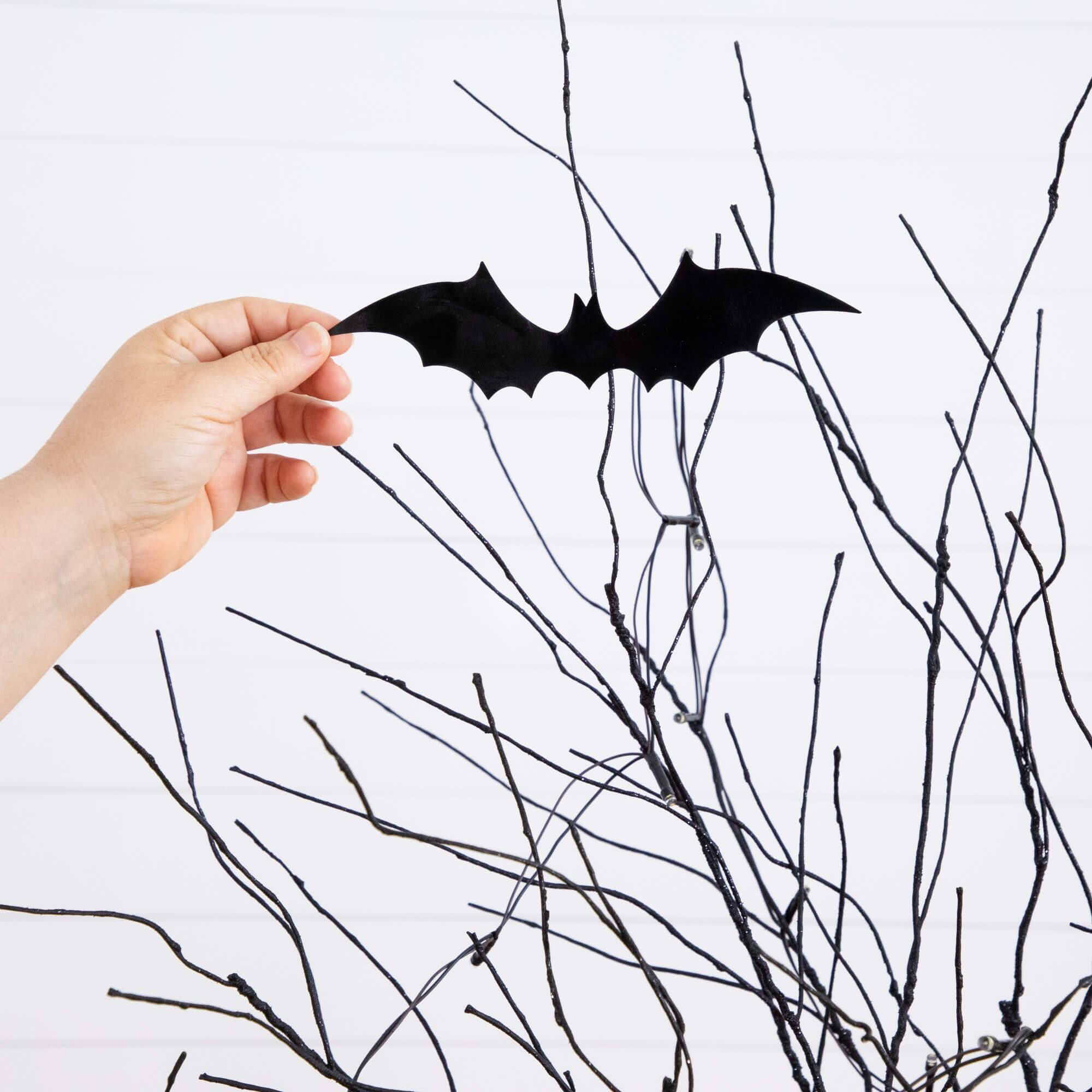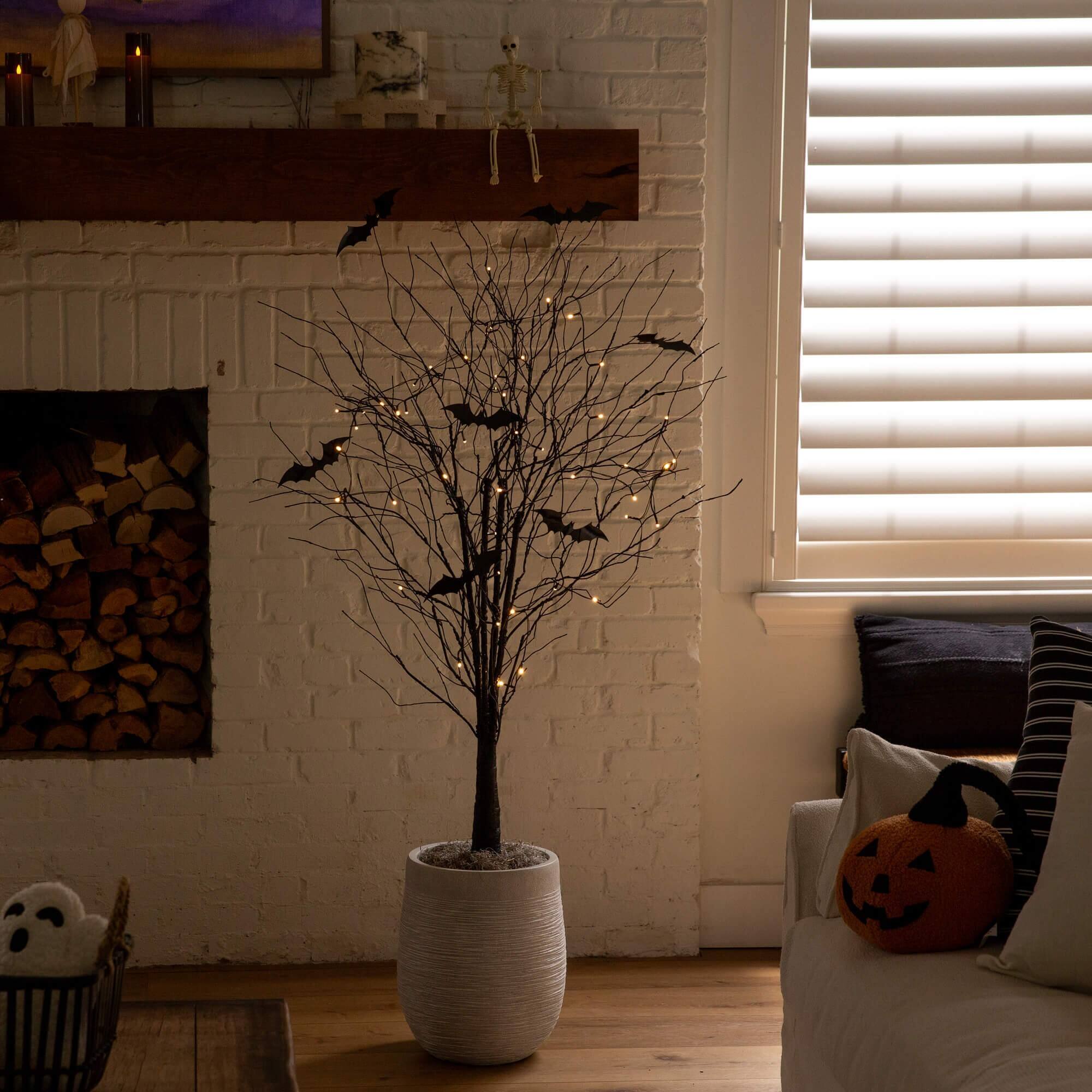 5ft. Pre-Lit Artificial Halloween Black Twig Tree with Bats and 50 Warm White LED Lights