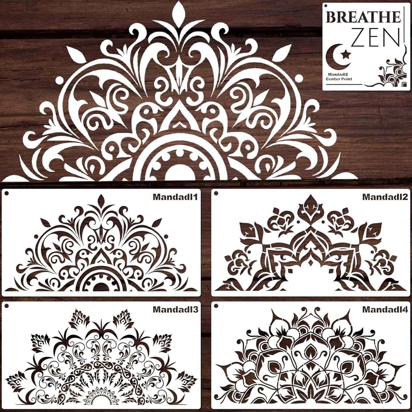 5-Pack Large Mandala Stencils – Half Mandala & Breathe Zen Reusable PET Painting Templates for DIY Crafts on Walls, Wood, Fabric, Rocks & Home Decor