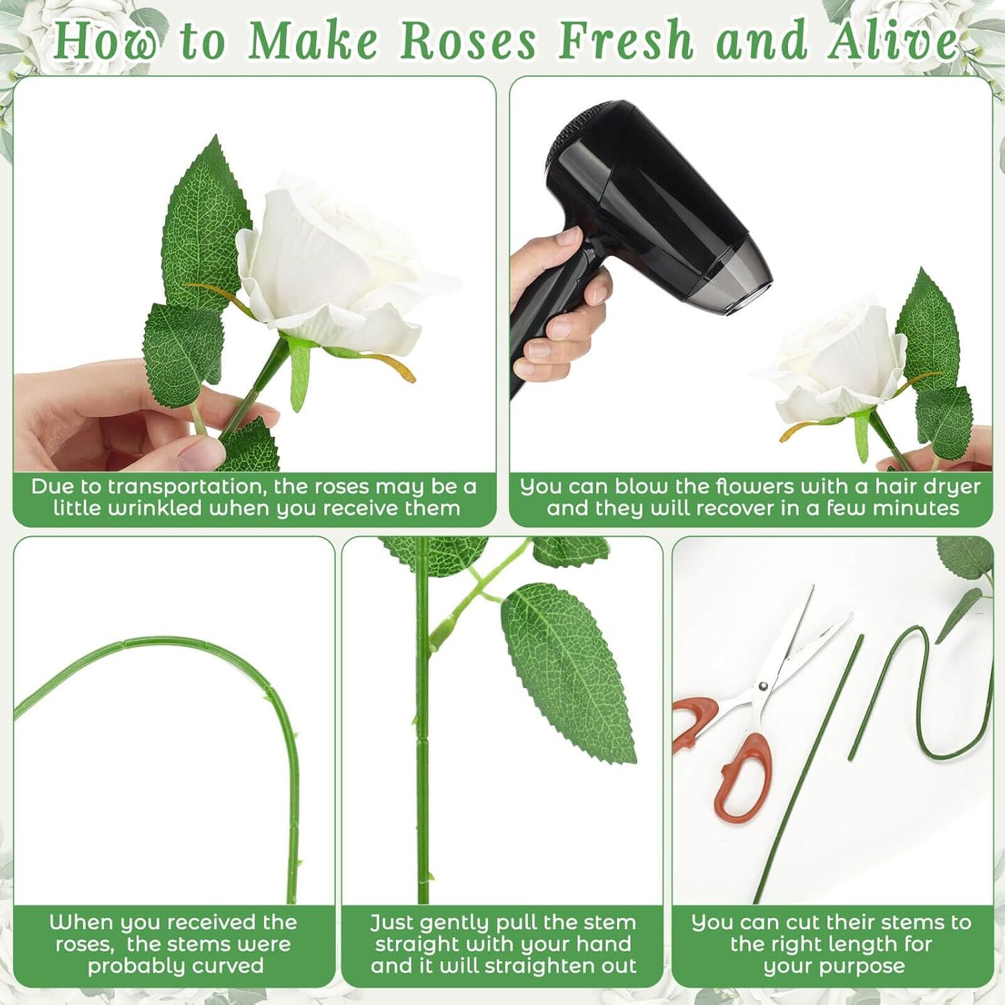 5PCS White Rose Artificial Flowers with 15PCS Diamond Pins for Bouquets