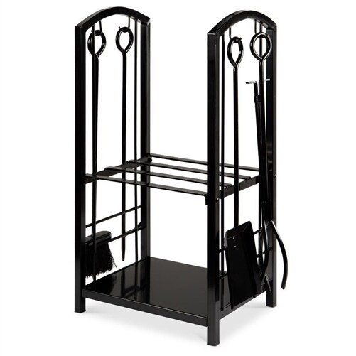 5-Piece Black Wrought Iron Firewood Log Rack with 4 Tools Set and 2 Shelves Fireplace Storage