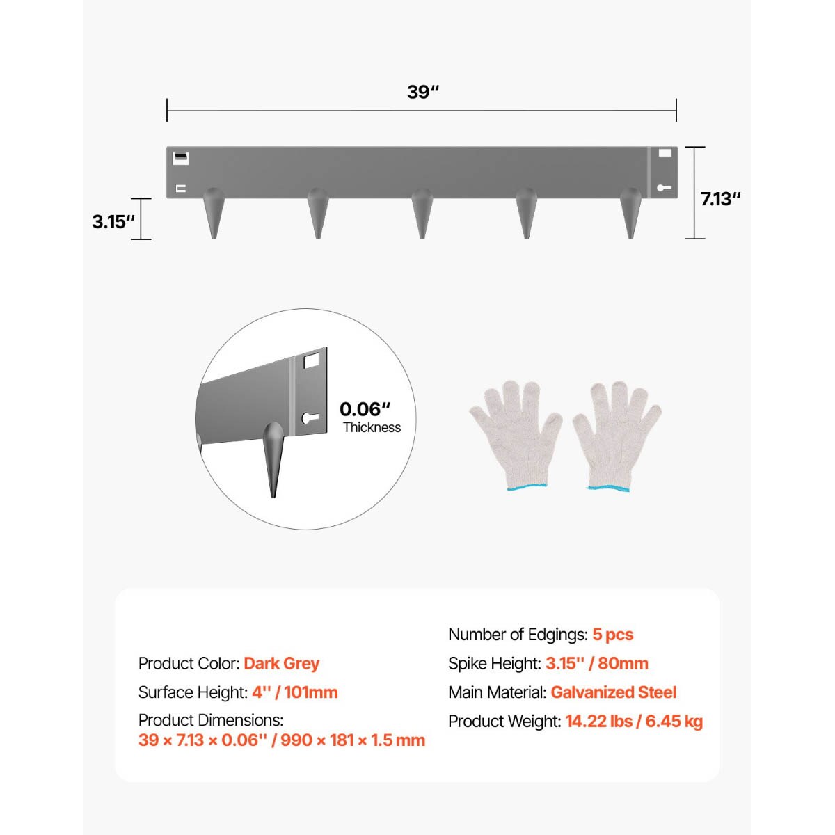5-Piece Dark Grey Galvanized Steel Flower Bed Border Garden Edging with Spikes Anchors
