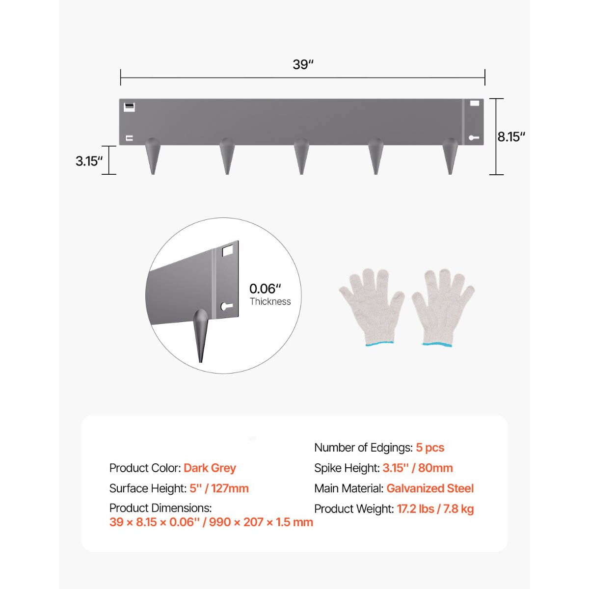 5-Piece Dark Grey Galvanized Steel Garden Edging Yard Border for Lawn Flowerbeds and Paths