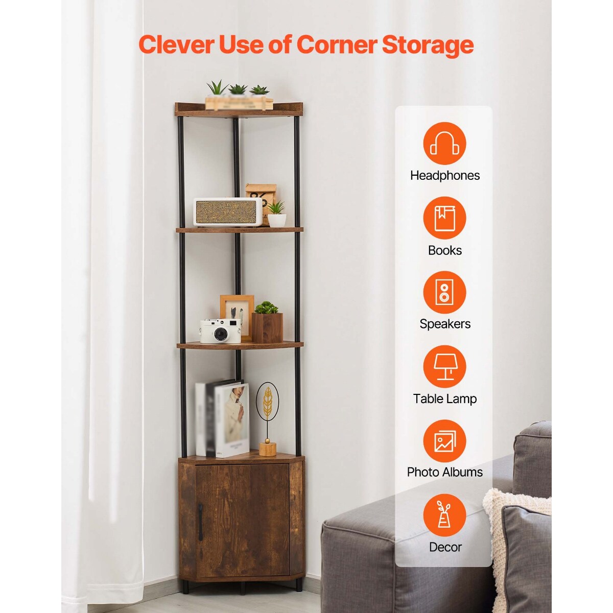 5-Tier Black Brown Wooden Adjustable LED Lights Corner Shelf with Doors and Metal Frame for Living Room