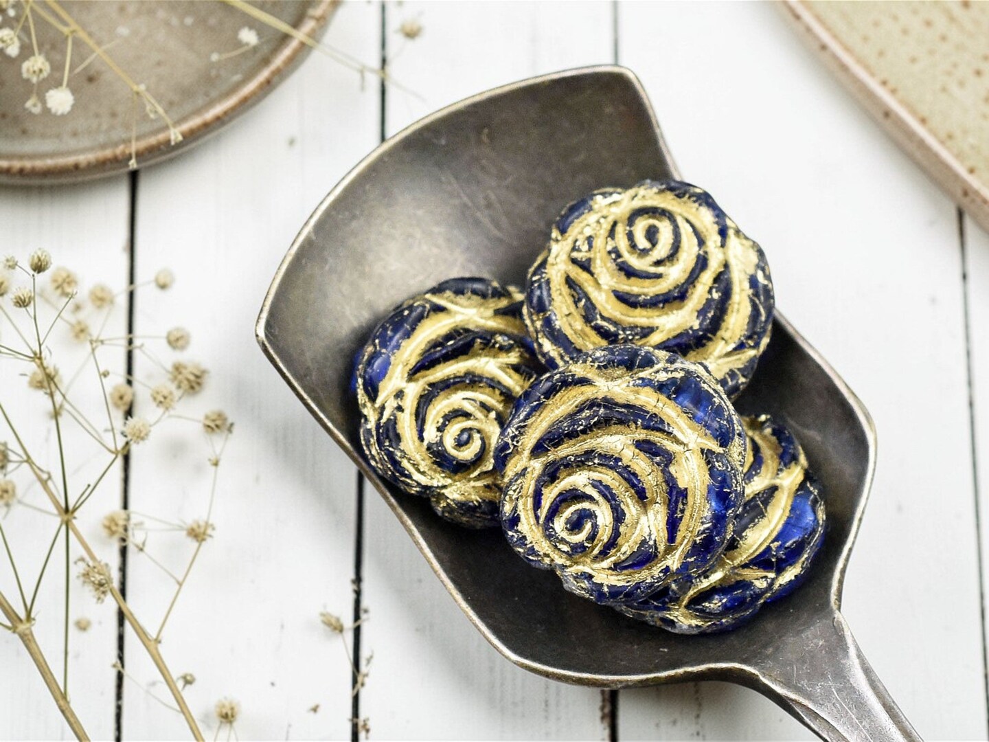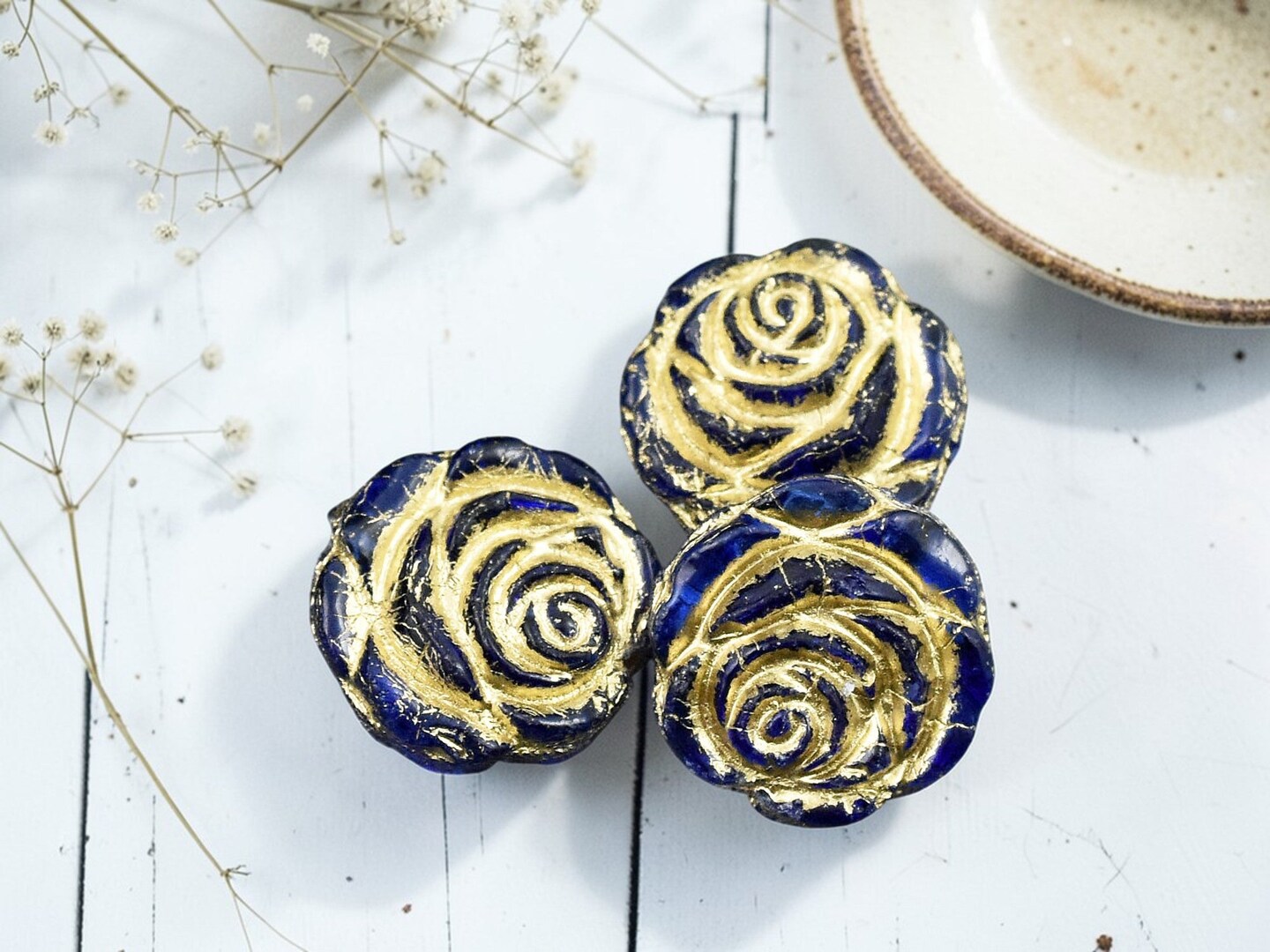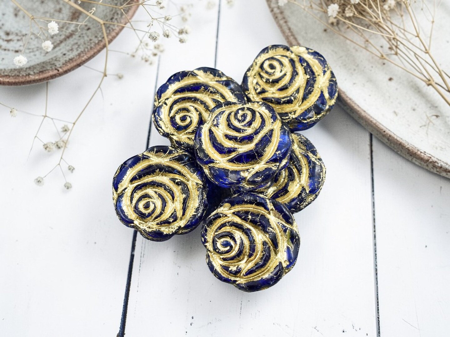 *6* 14mm Bronze Washed Cobalt Rose Flower Beads