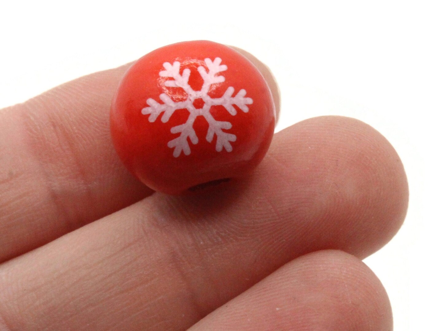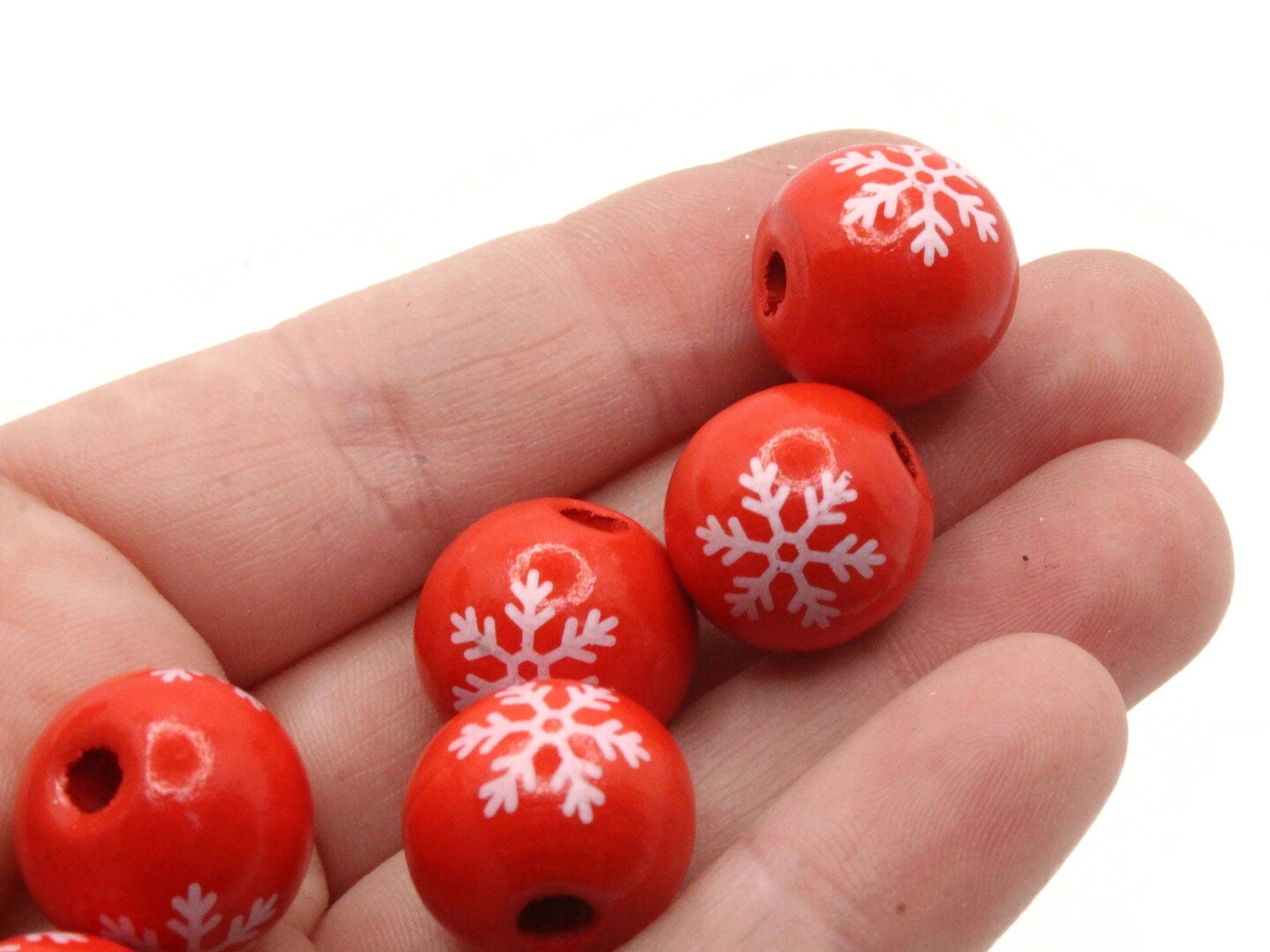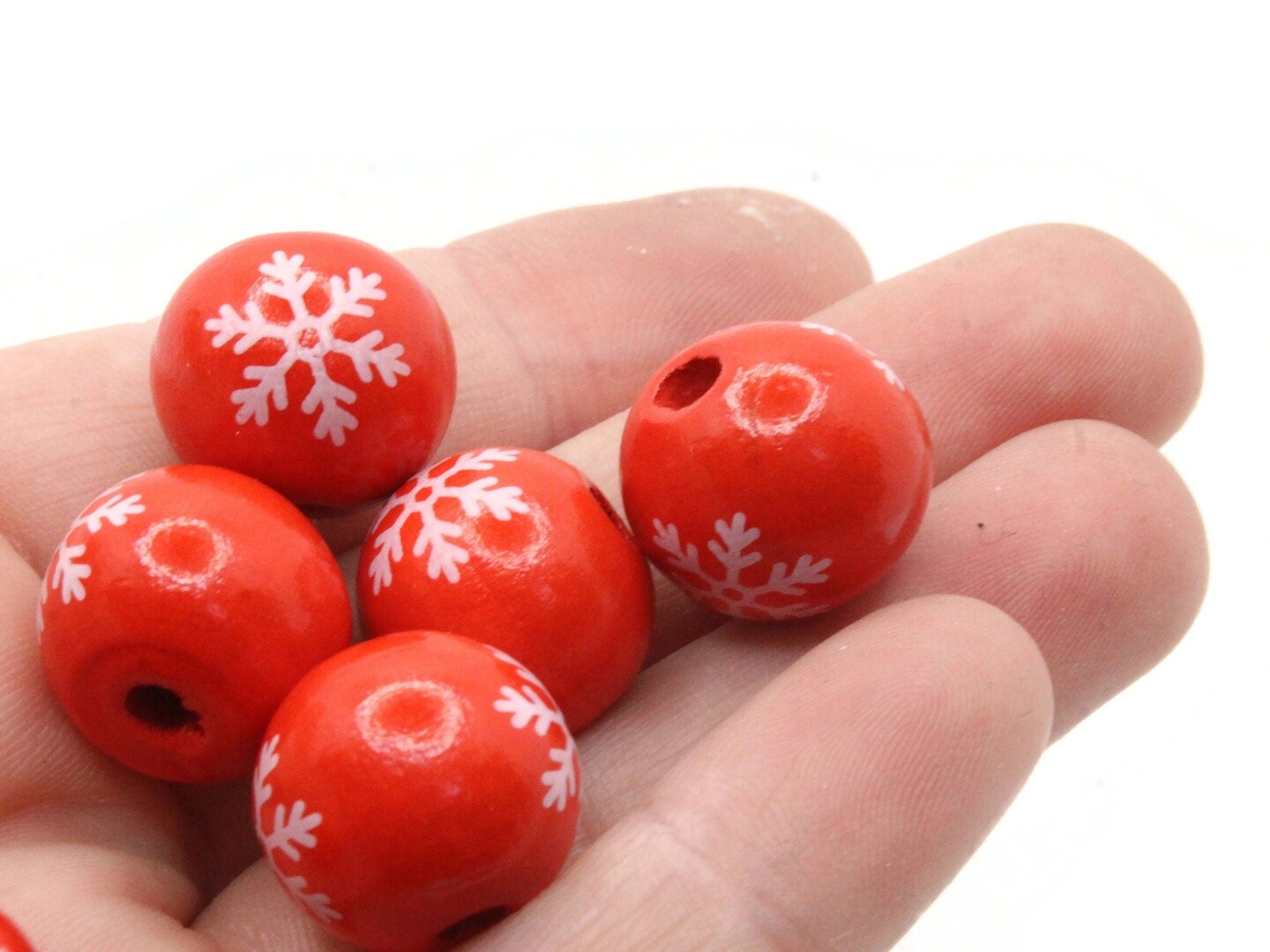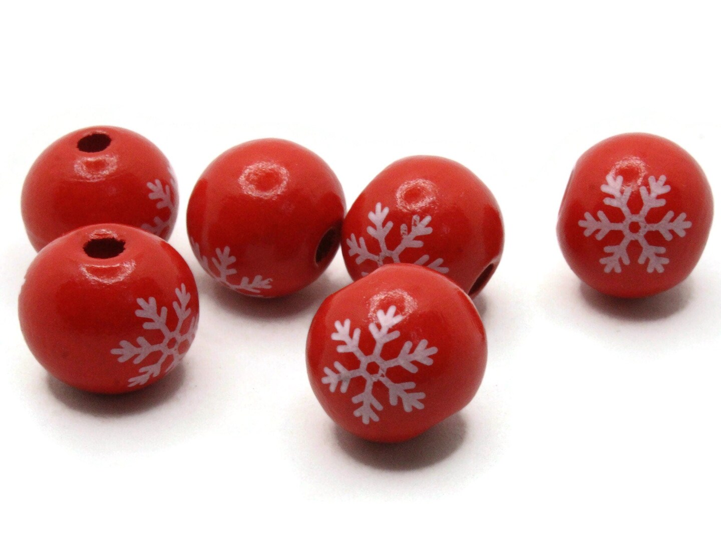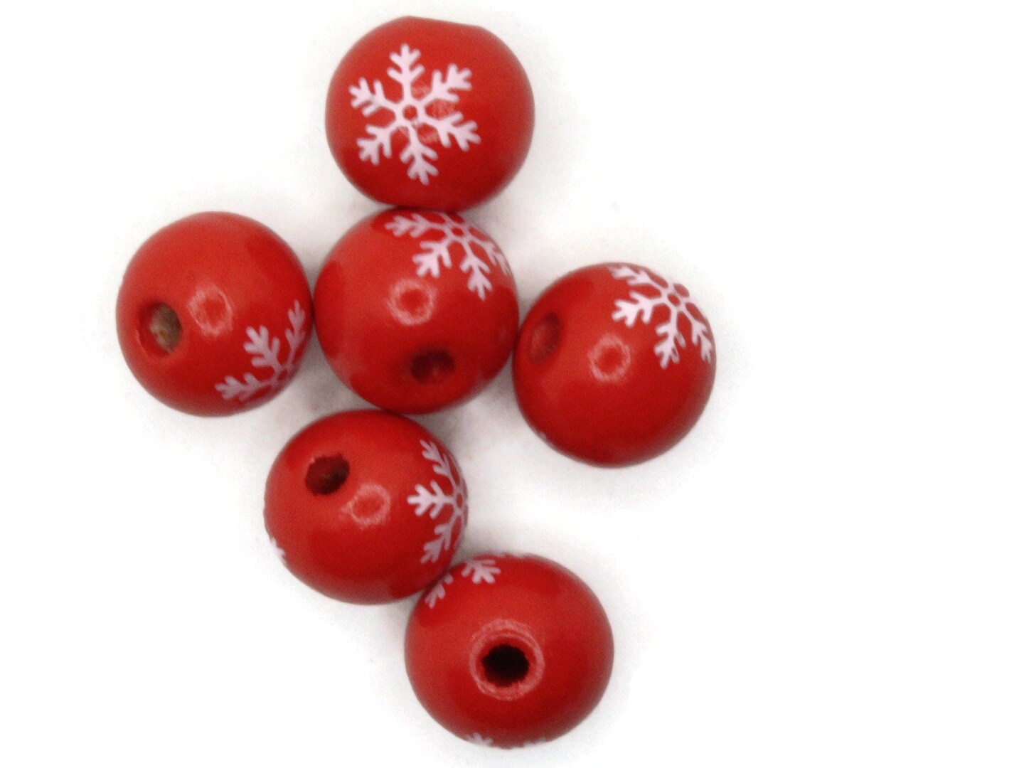 6 16mm Red and White Snowflake Round Wooden Beads