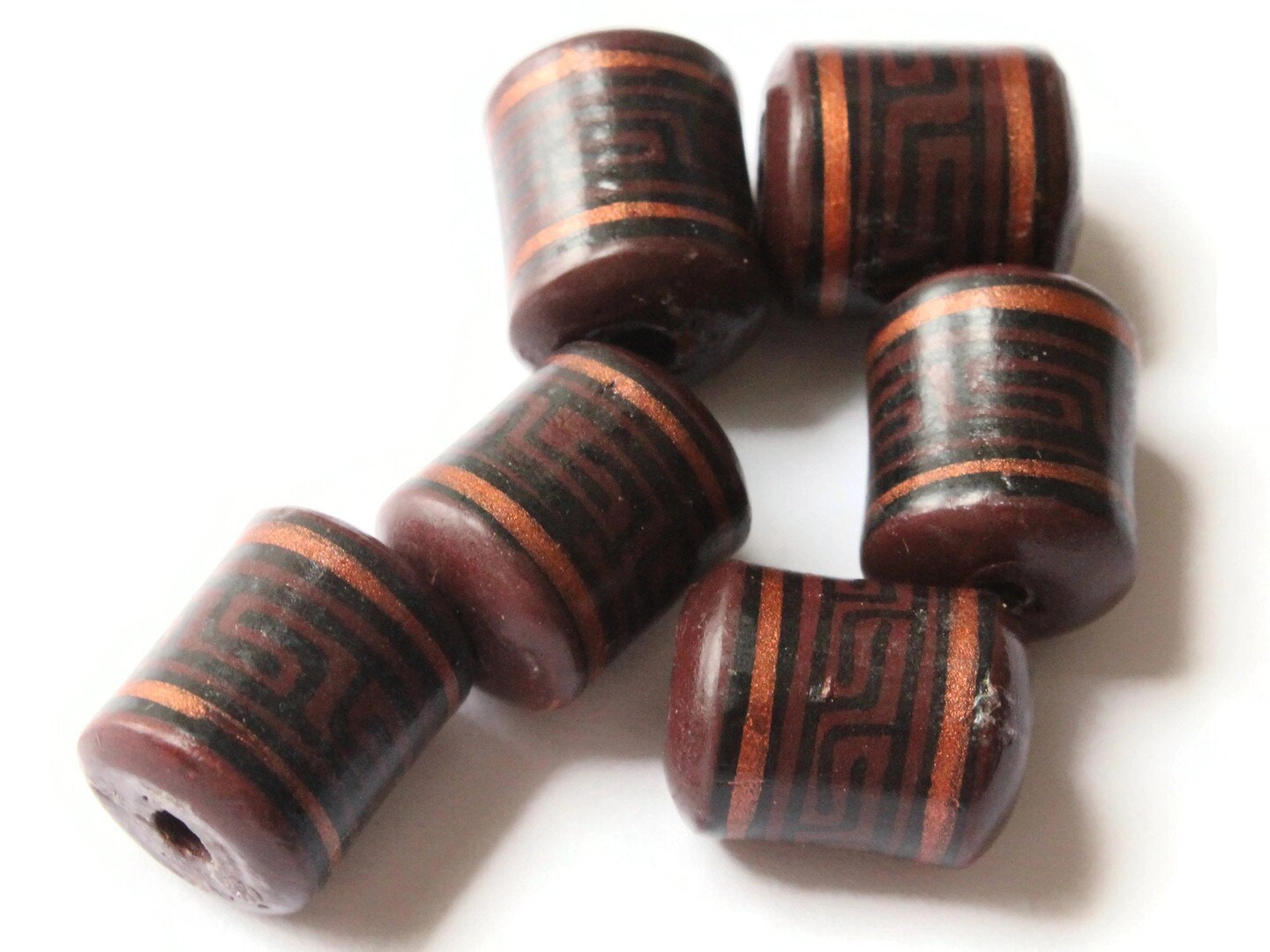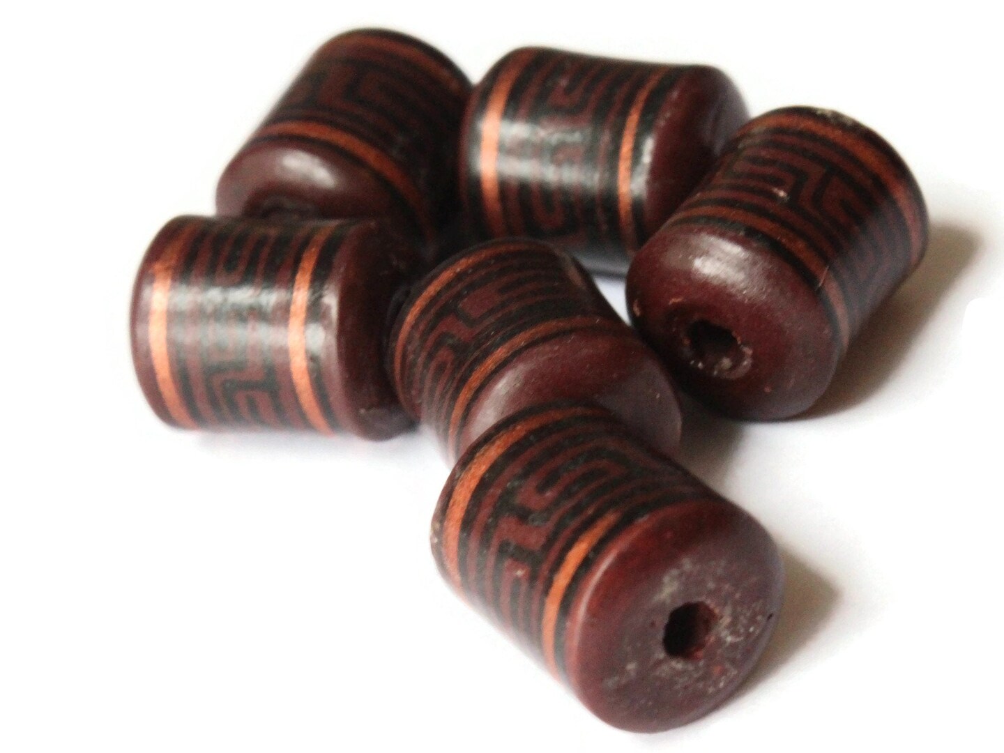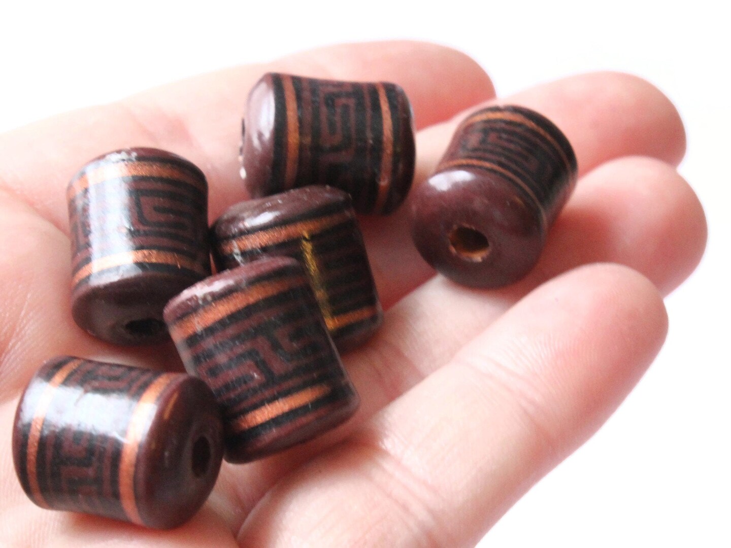 6 16mm Vintage Painted Peruvian Clay Beads - Brown, Copper, and Black Patterned Tube Beads
