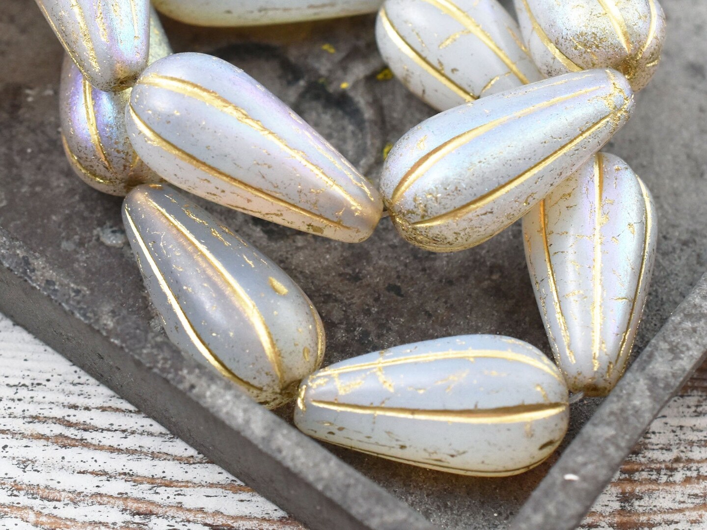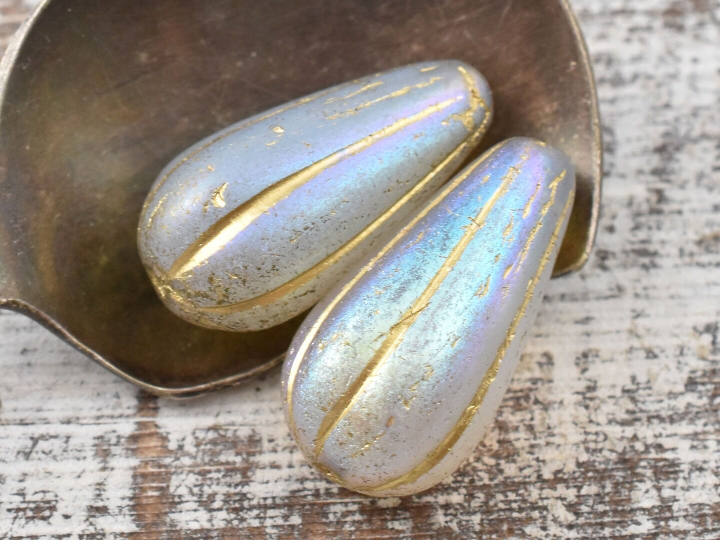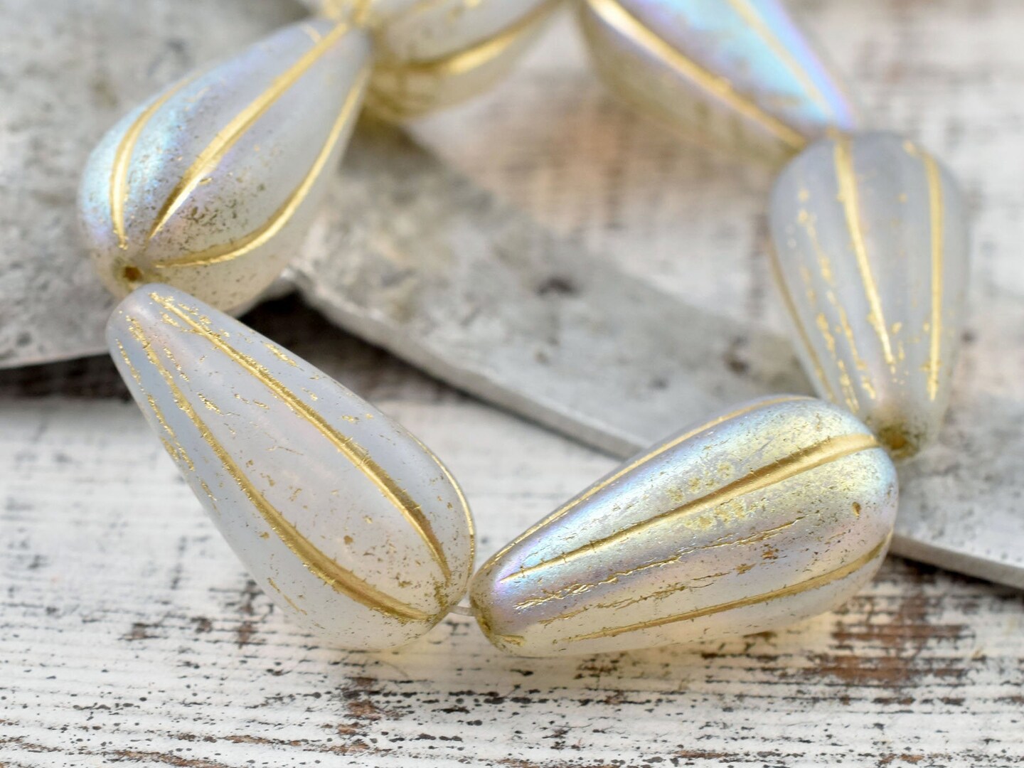 *6* 22x11mm Gold Washed Milky Crystal AB Melon Drop Beads