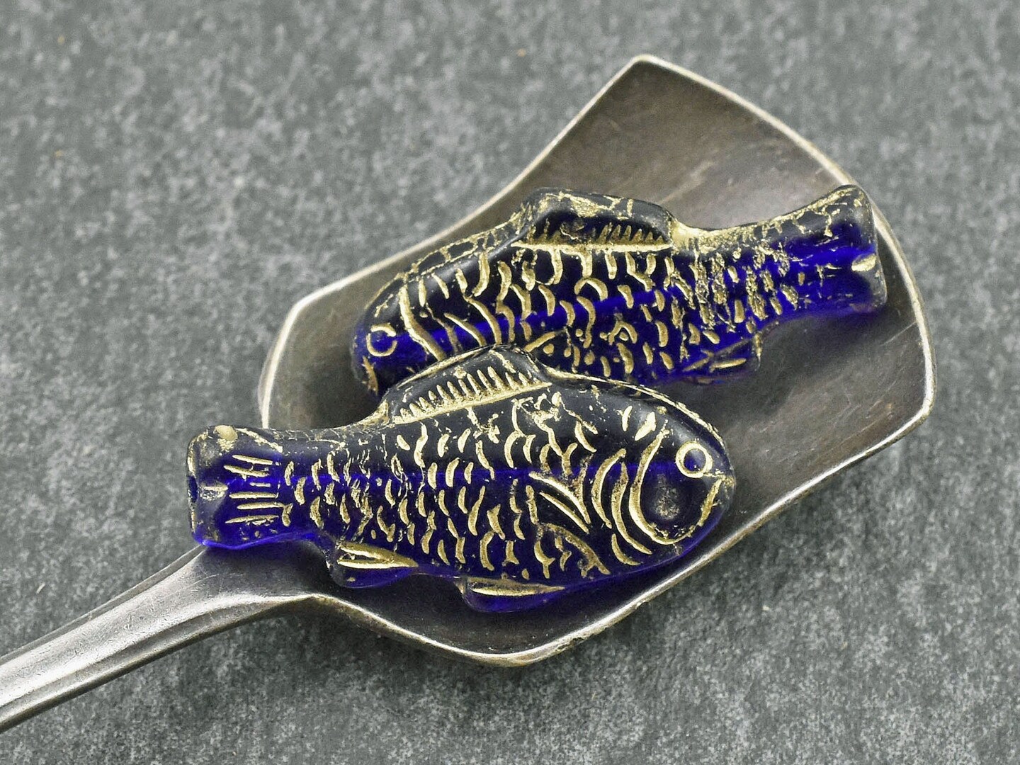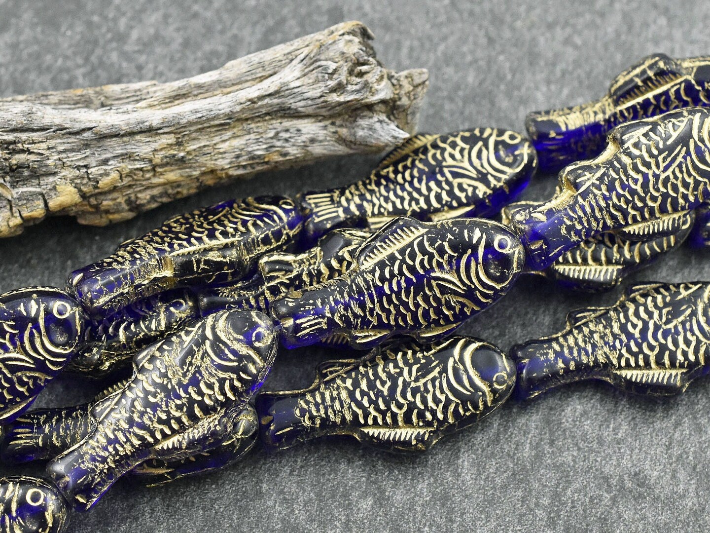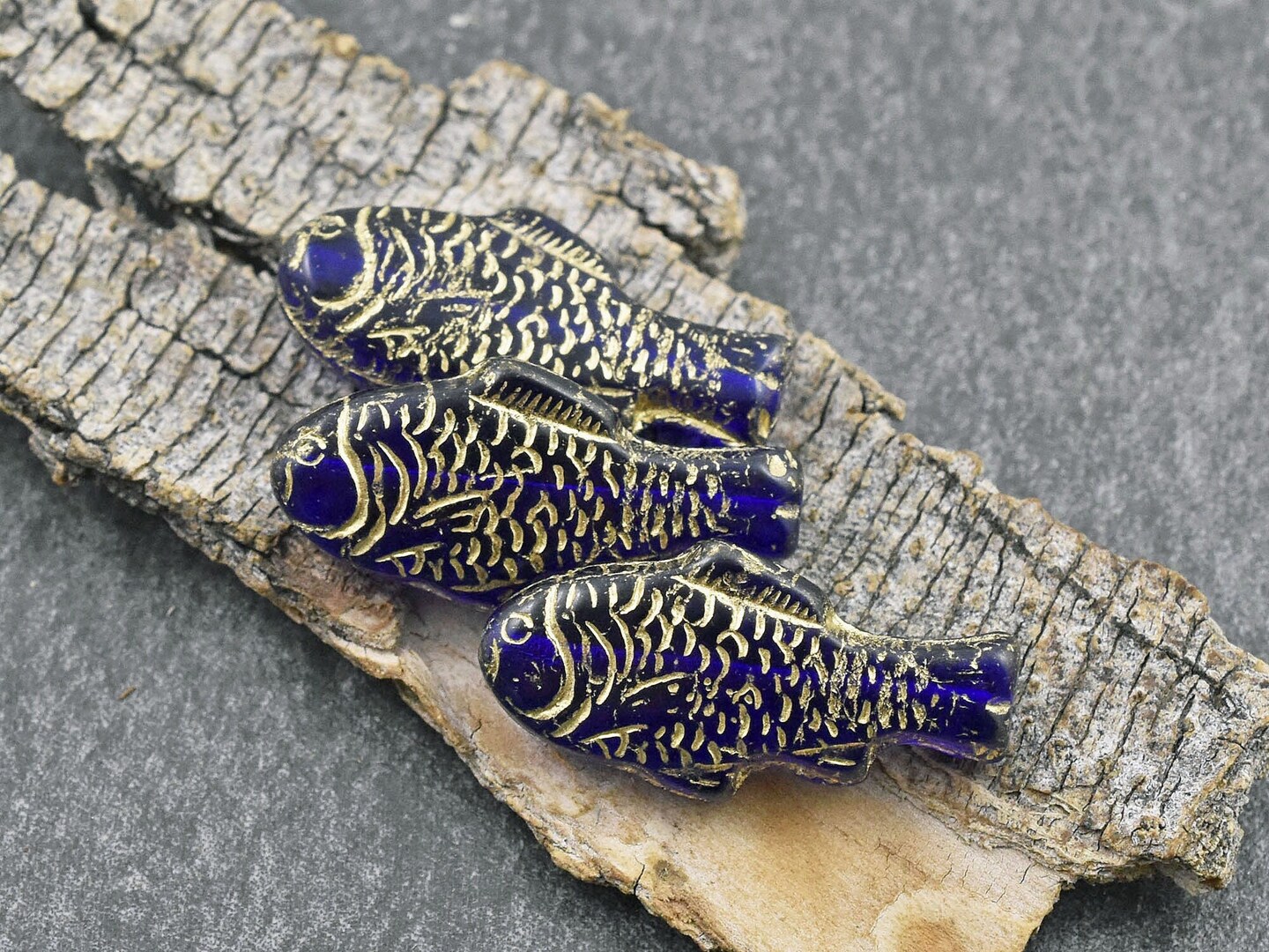*6* 28x13mm Gold Washed Cobalt Fish Beads