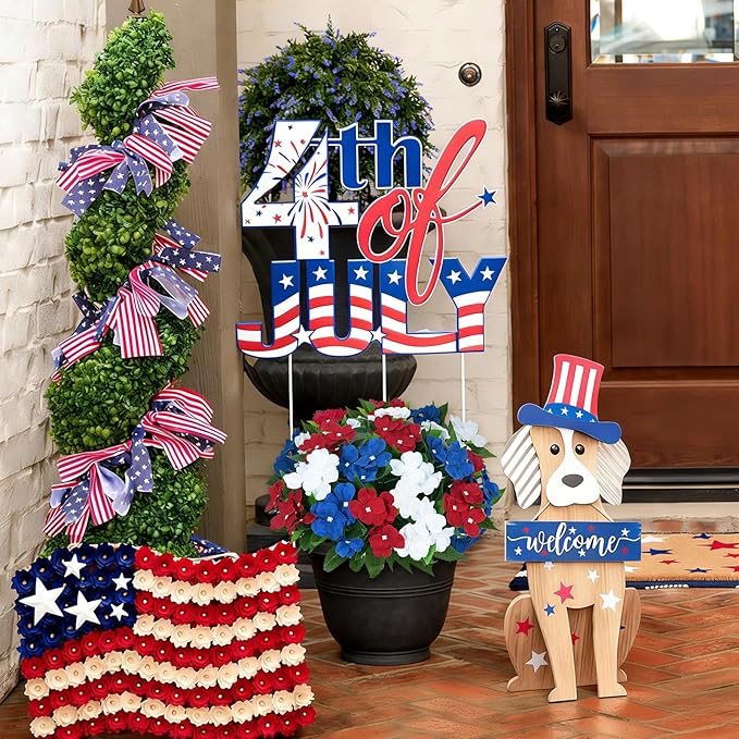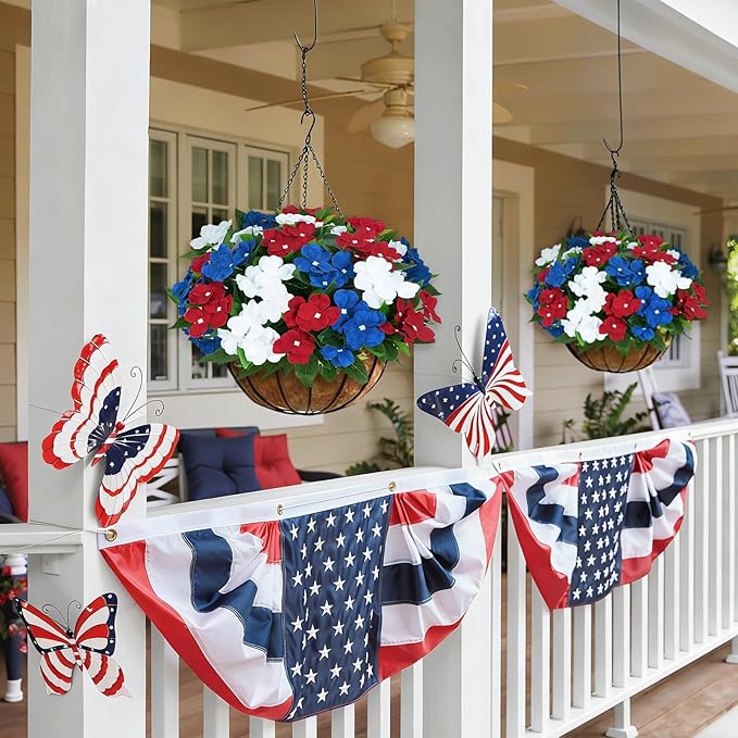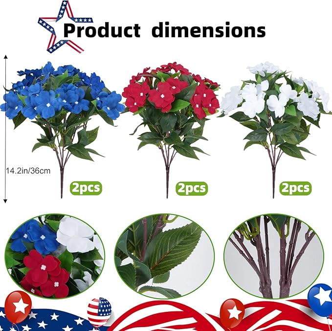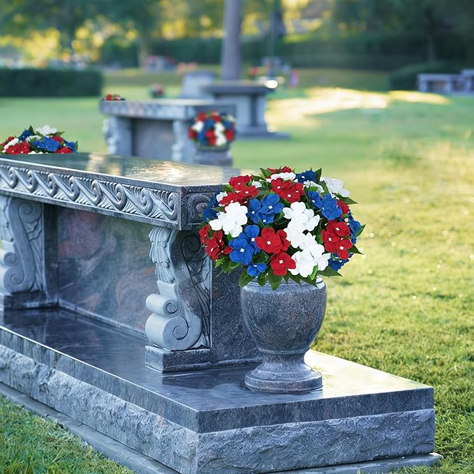 6 Bundles Red White Blue Artificial Outdoor Flowers, Silk Patriotic Floral UV Resistant Fake Geraniums Bouquets for Memorial, 4th of July Cemetery Decor Outdoor Porch Garden Decoration