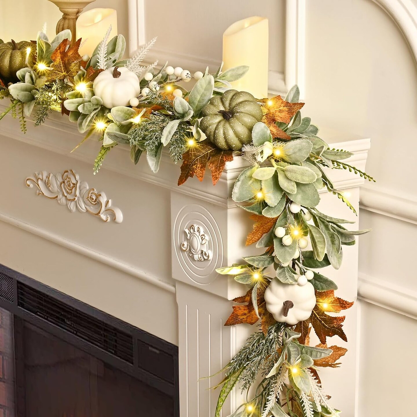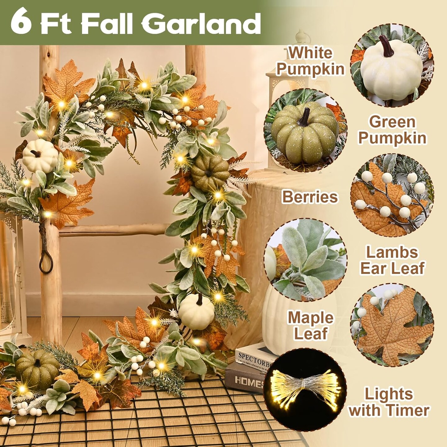 6 Ft Fall Autumn Garland with Lights - Green