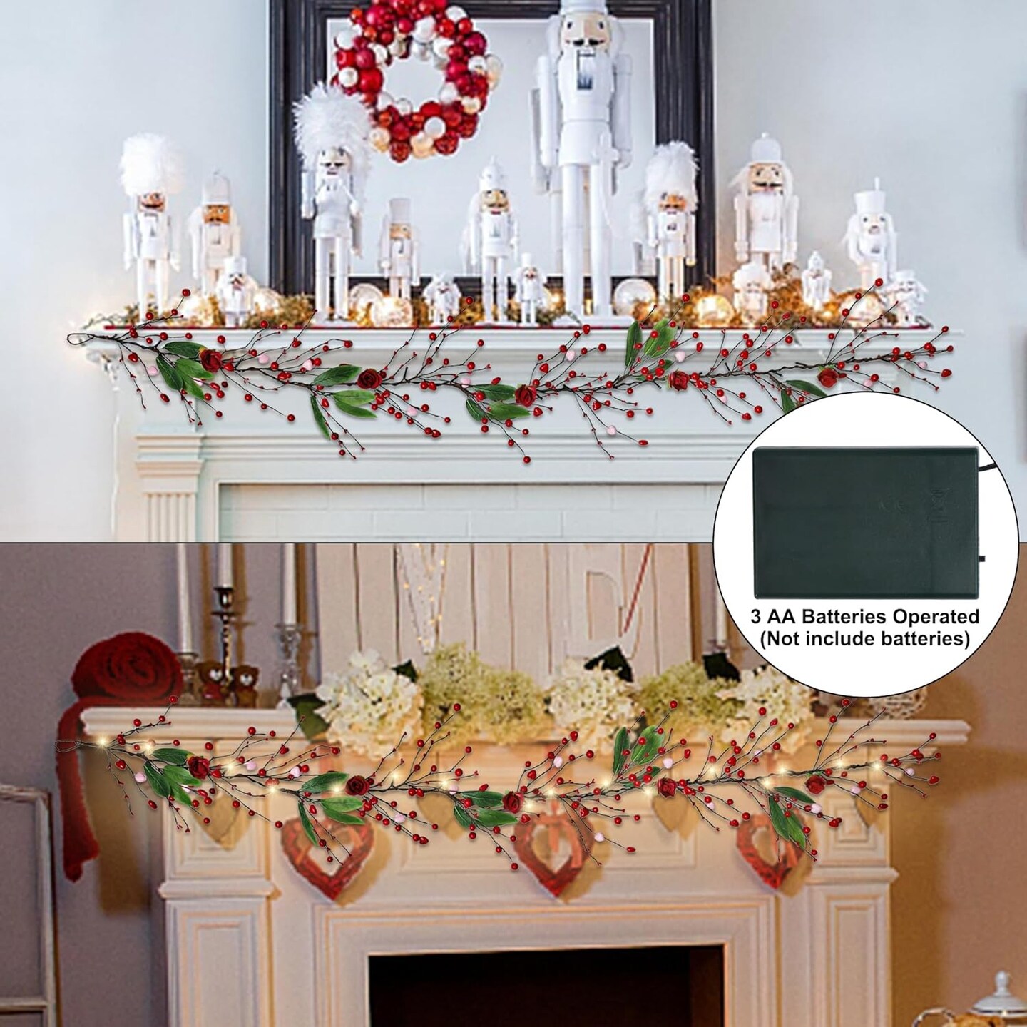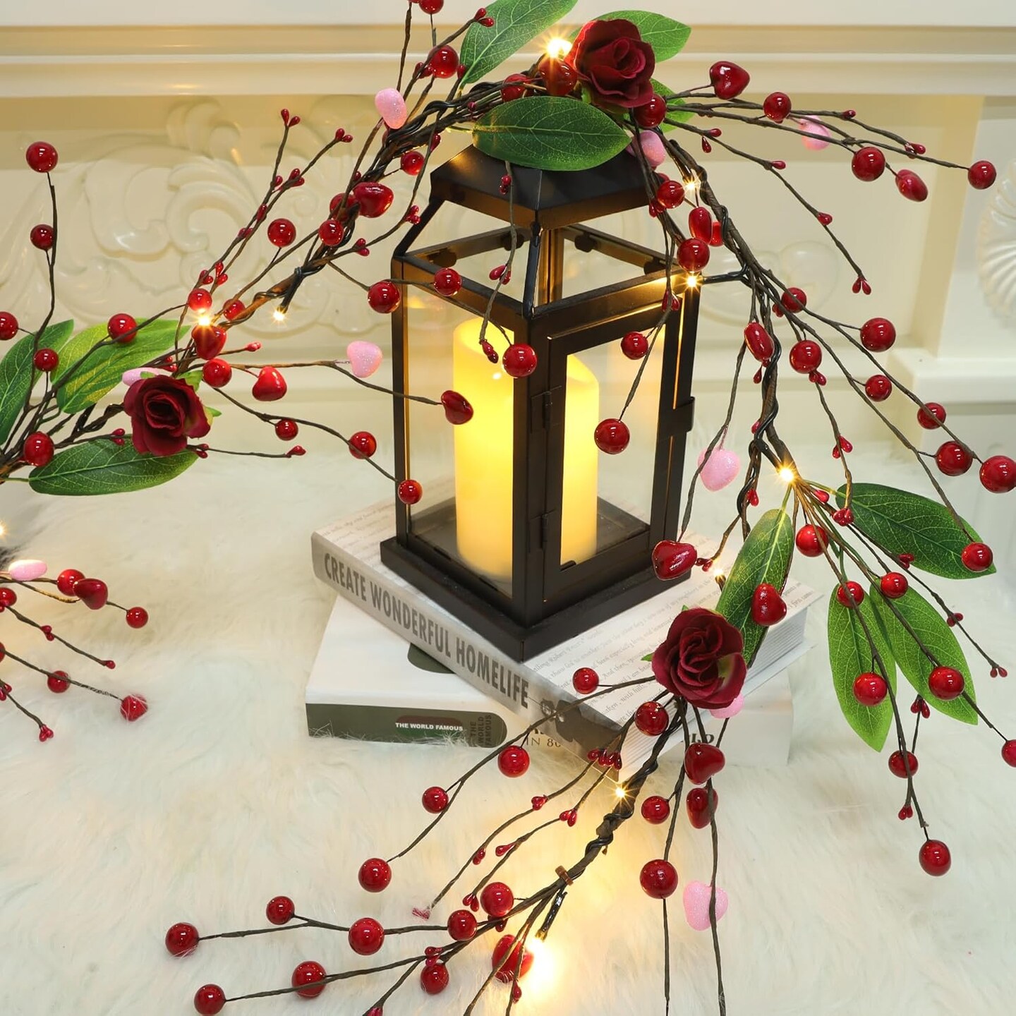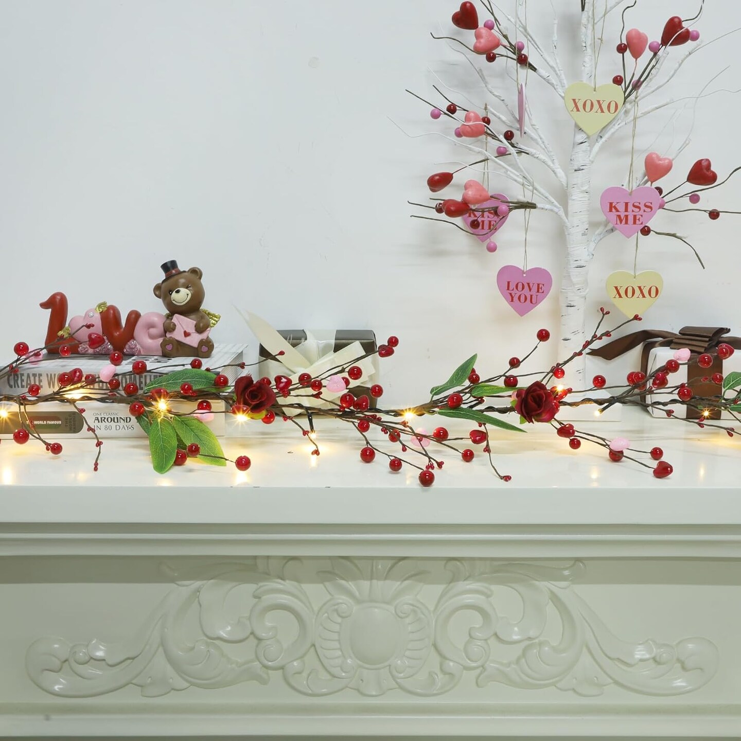 6 ft Valentine’s Day Garland with Lights – Twig Garland with Pink Heart Roses & Berries for Home, Mantel & Holiday Décor