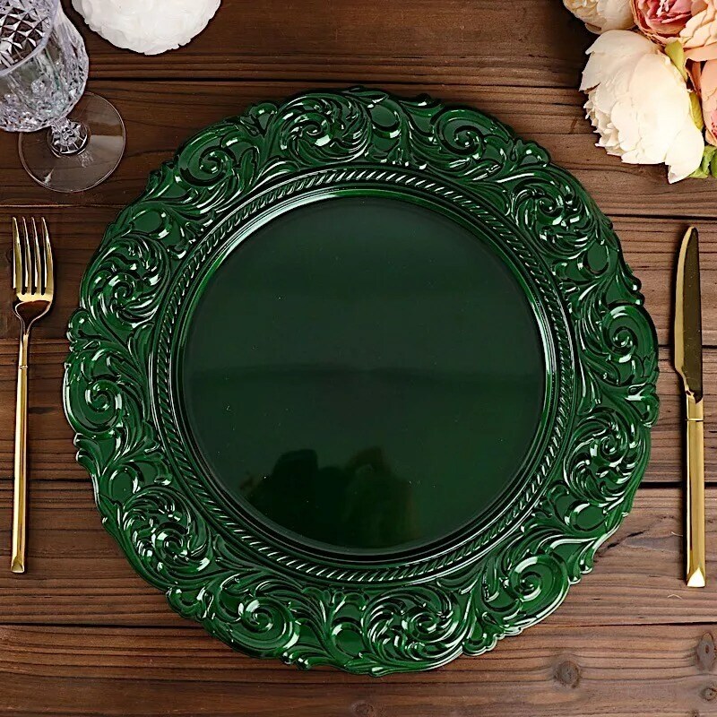 6 HUNTER GREEN 14" Round Baroque Metallic Charger Plates