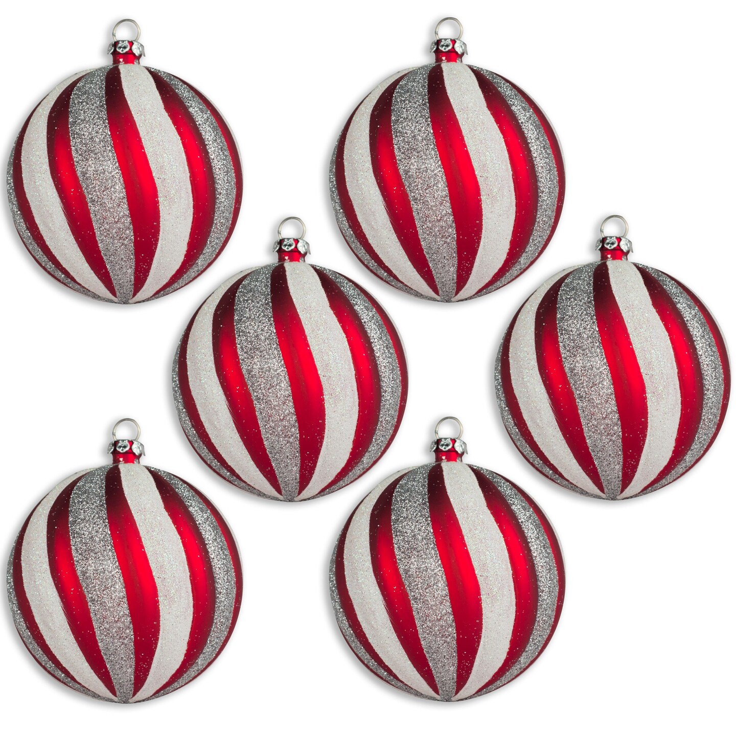 6 Pack of Red, Silver, and White Striped Ball Ornaments with Glitter Enhancement