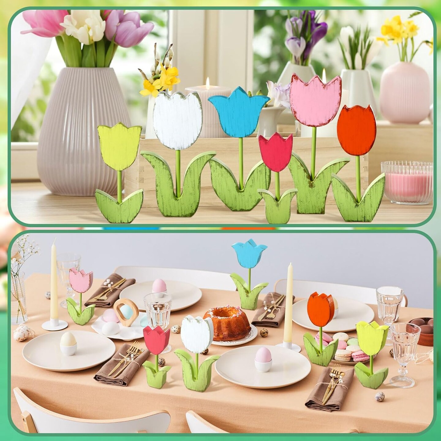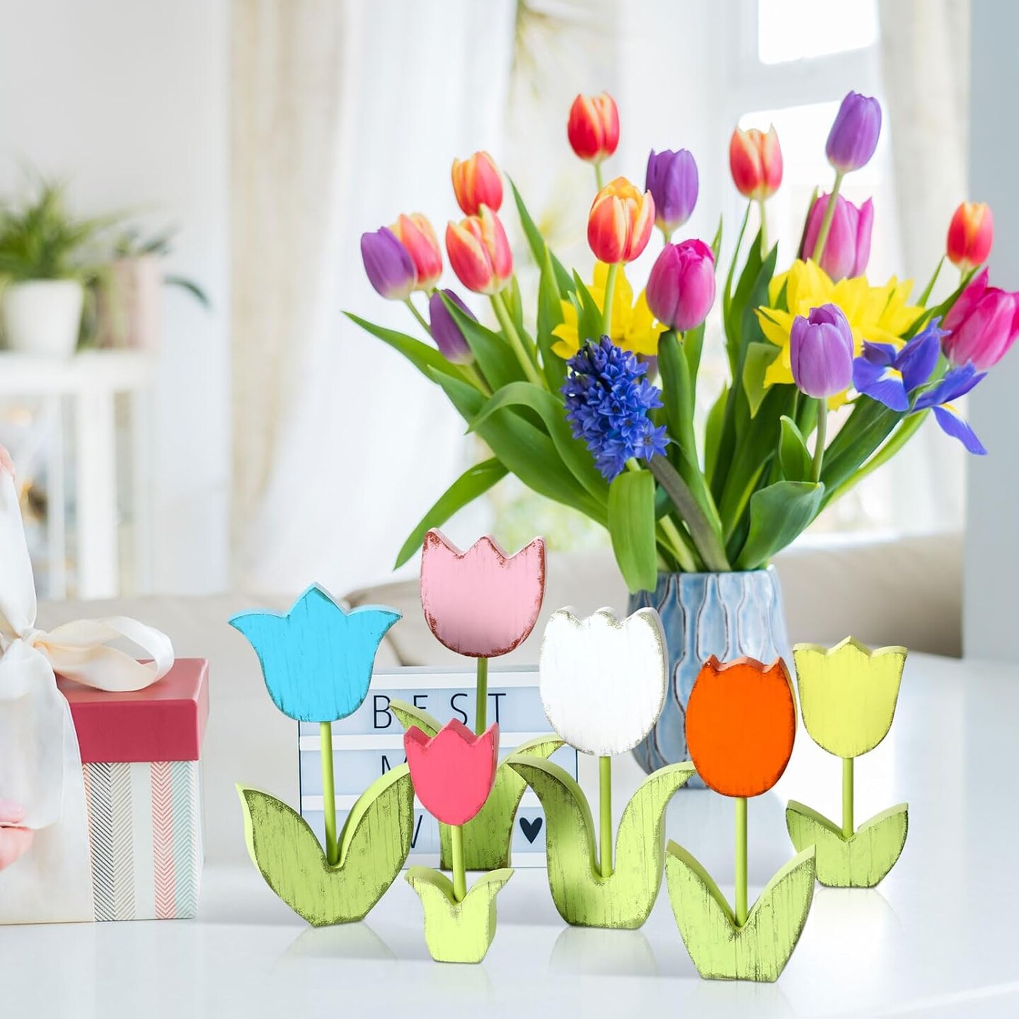 6 Pcs Retro Spring Tulips Wood Signs Rustic Farmhouse Tulip Table Centerpiece Multicolor Floral Block Tabletop Signs Spring Decoration