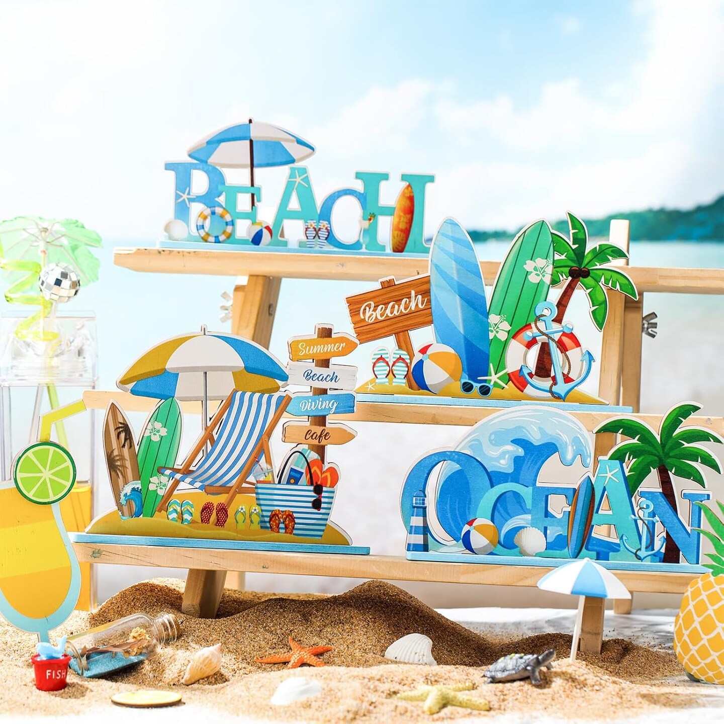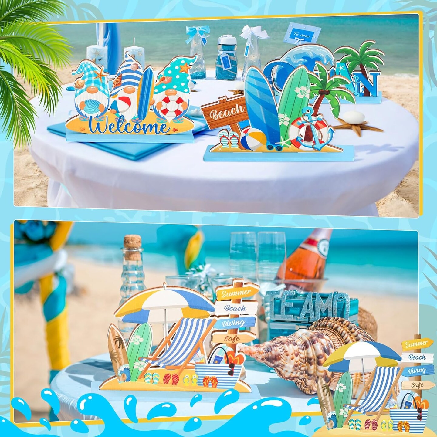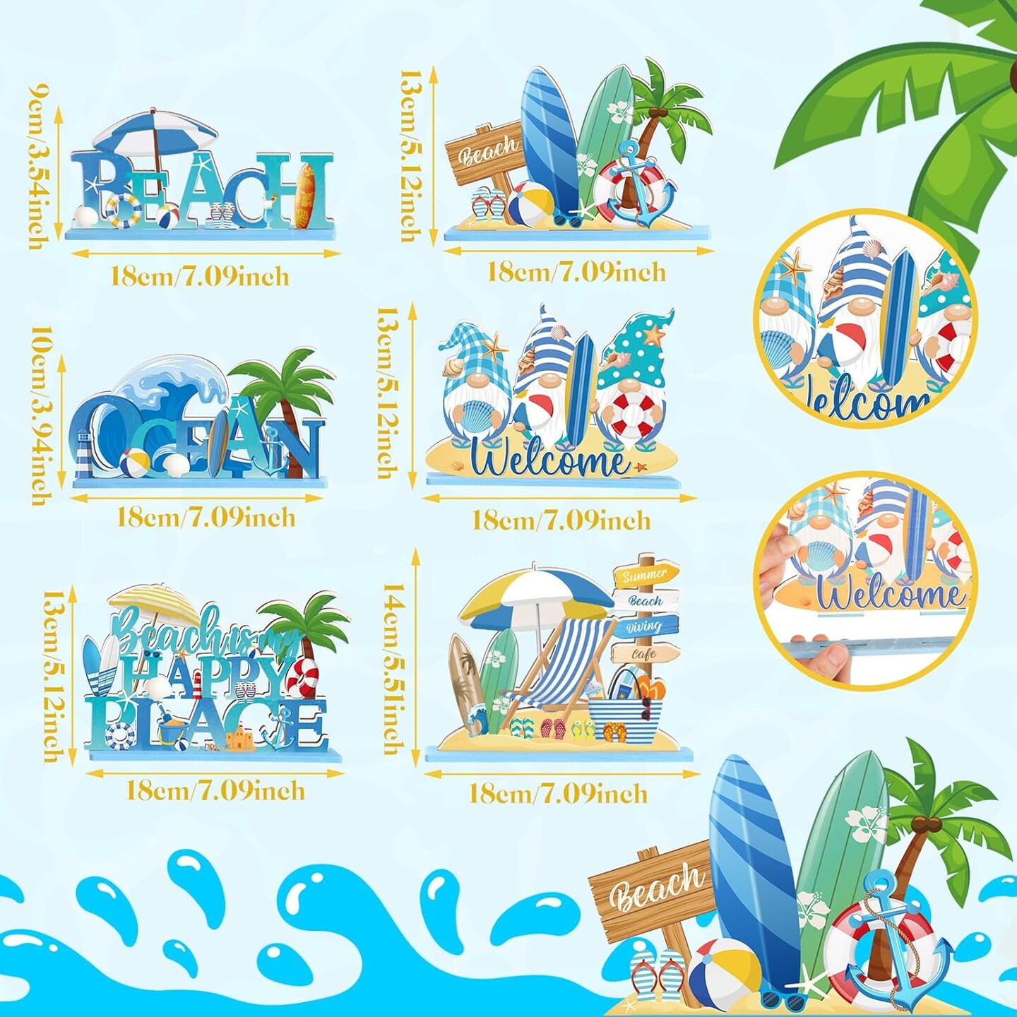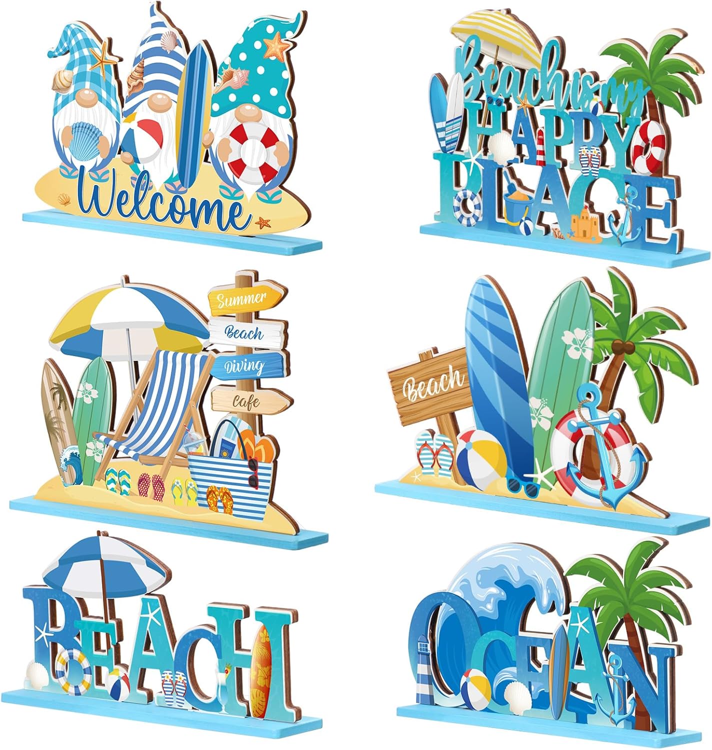 6 Pcs Summer Beach Table Decorations Signs Beach Gnomes Pool Wooden Table Signs Coastal Surfboard Table Centerpiece Beach Is My Happy Place Plaque Sign for Hawaiian Tropical Summer Luau Party Supplies