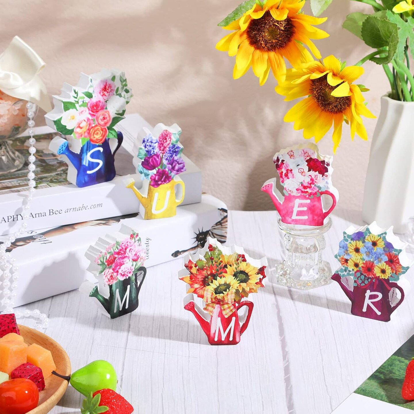 6 Pieces Summer Office Decorations Flower Farmhouse Wooden Summer Tiered Tabletop Set Watering Can Wood Block Signs for Home Indoor Kitchen Work Tabletop Shelf