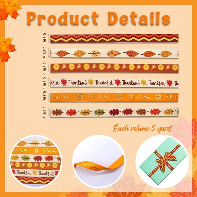 6 rolls 30 yards of fall ribbons, autumn harvest ribbons, wave polyester satin ribbon. Thanksgiving Pumpkin Maple Leaf Orange Ribbon 3/8" Wide for Gift Wrapping DIY Projects Fall Thanksgiving Decor