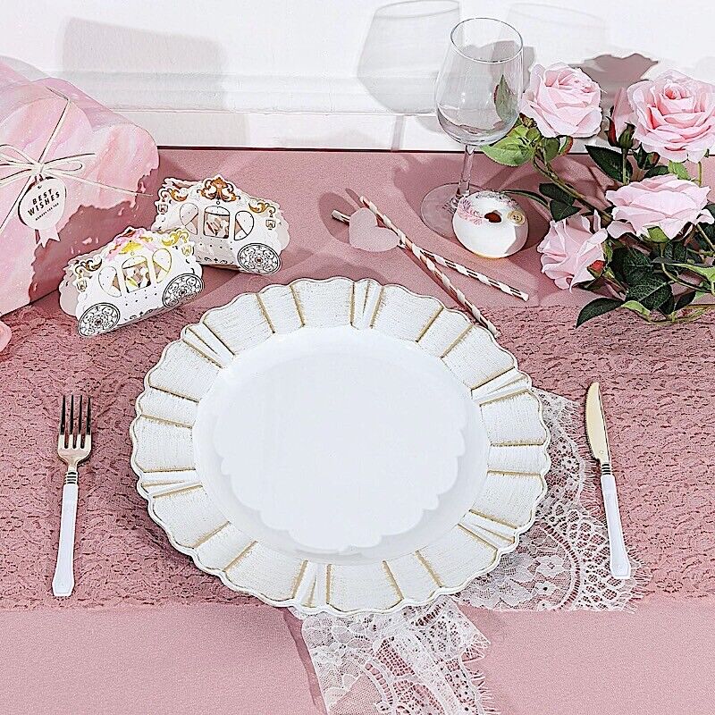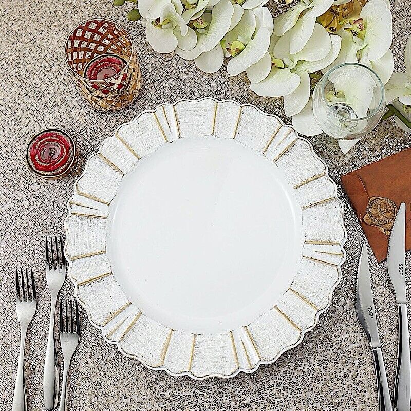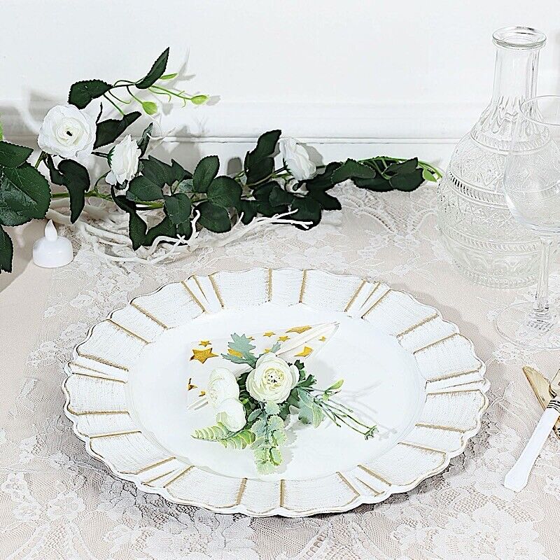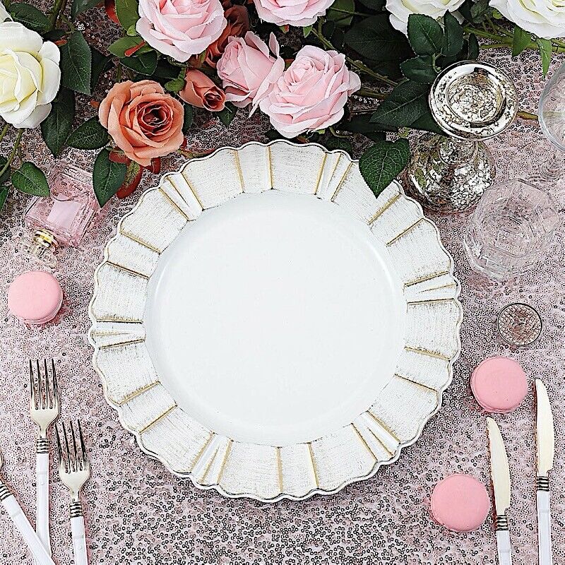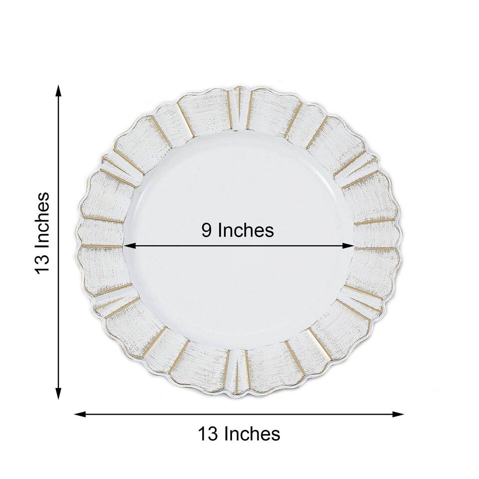6 WHITE GOLD 13" Round Scalloped Trim Charger Plates