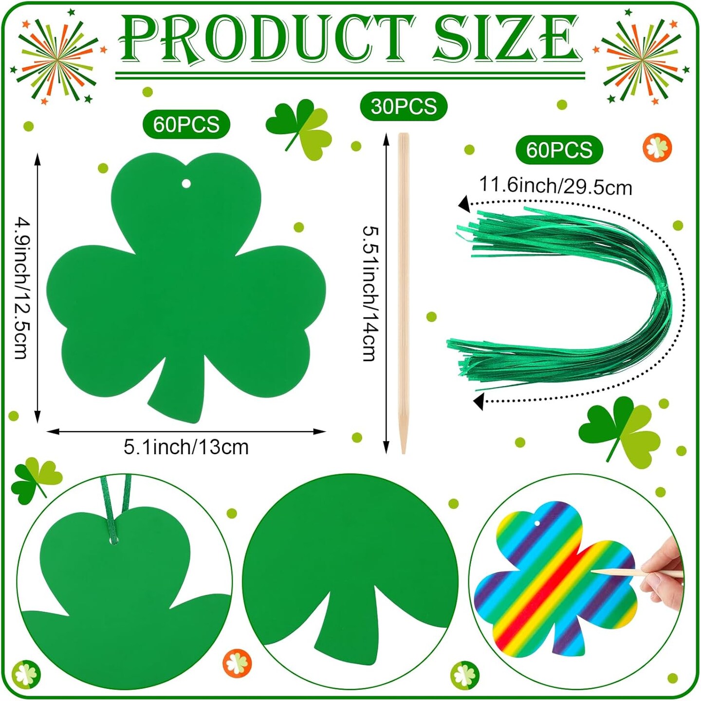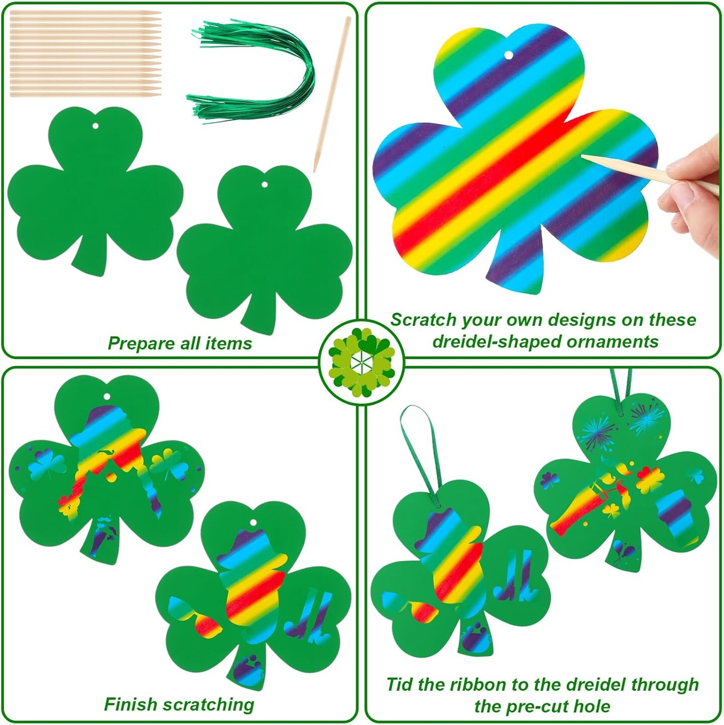 60 Set St. Patrick's Day Crafts for Kids Shamrocks Colorful Scratch with 30 Wooden Scratch Tools Green Shamrocks Hanging Craft Art Kit for Kids Gifts St. Patrick's Day Party School Favors