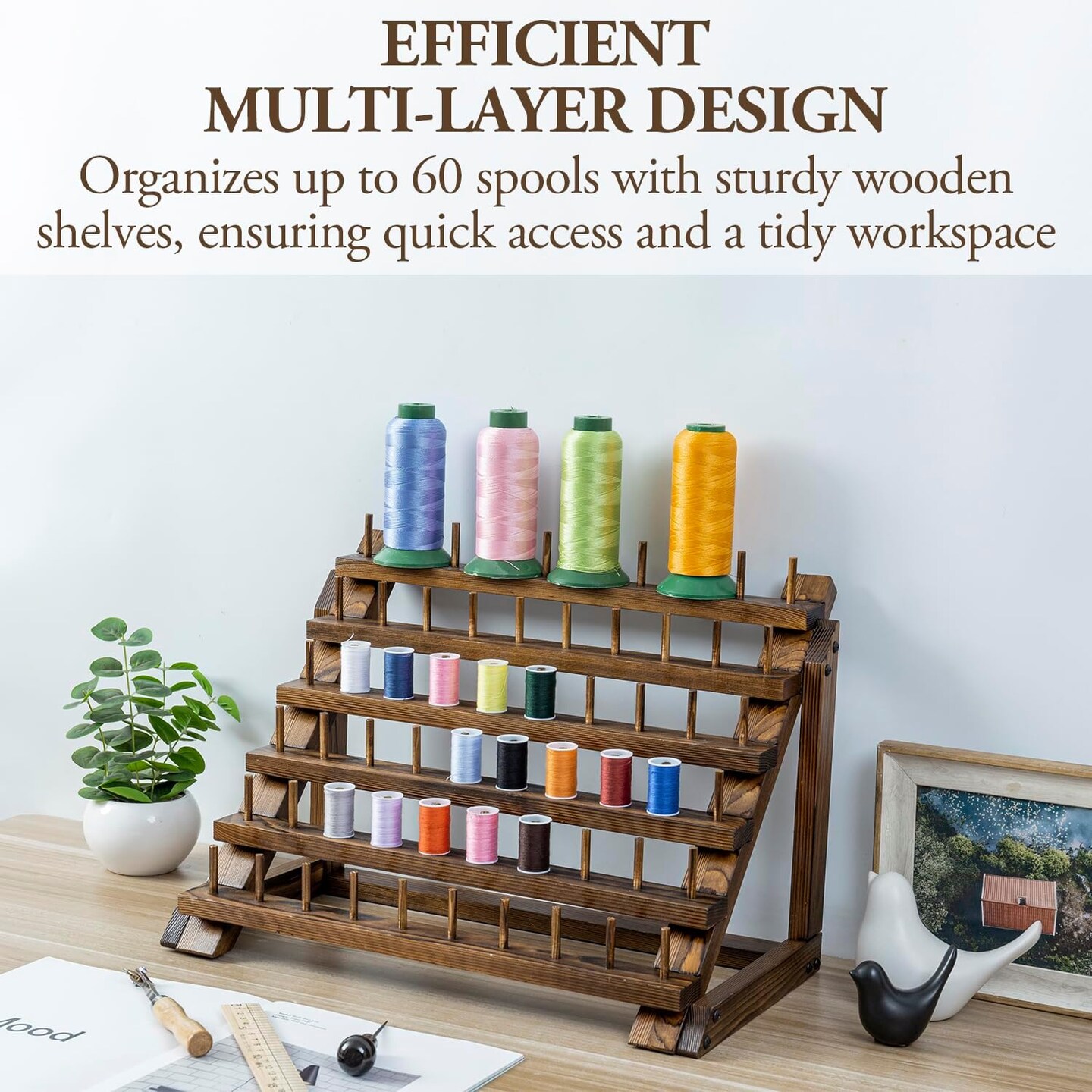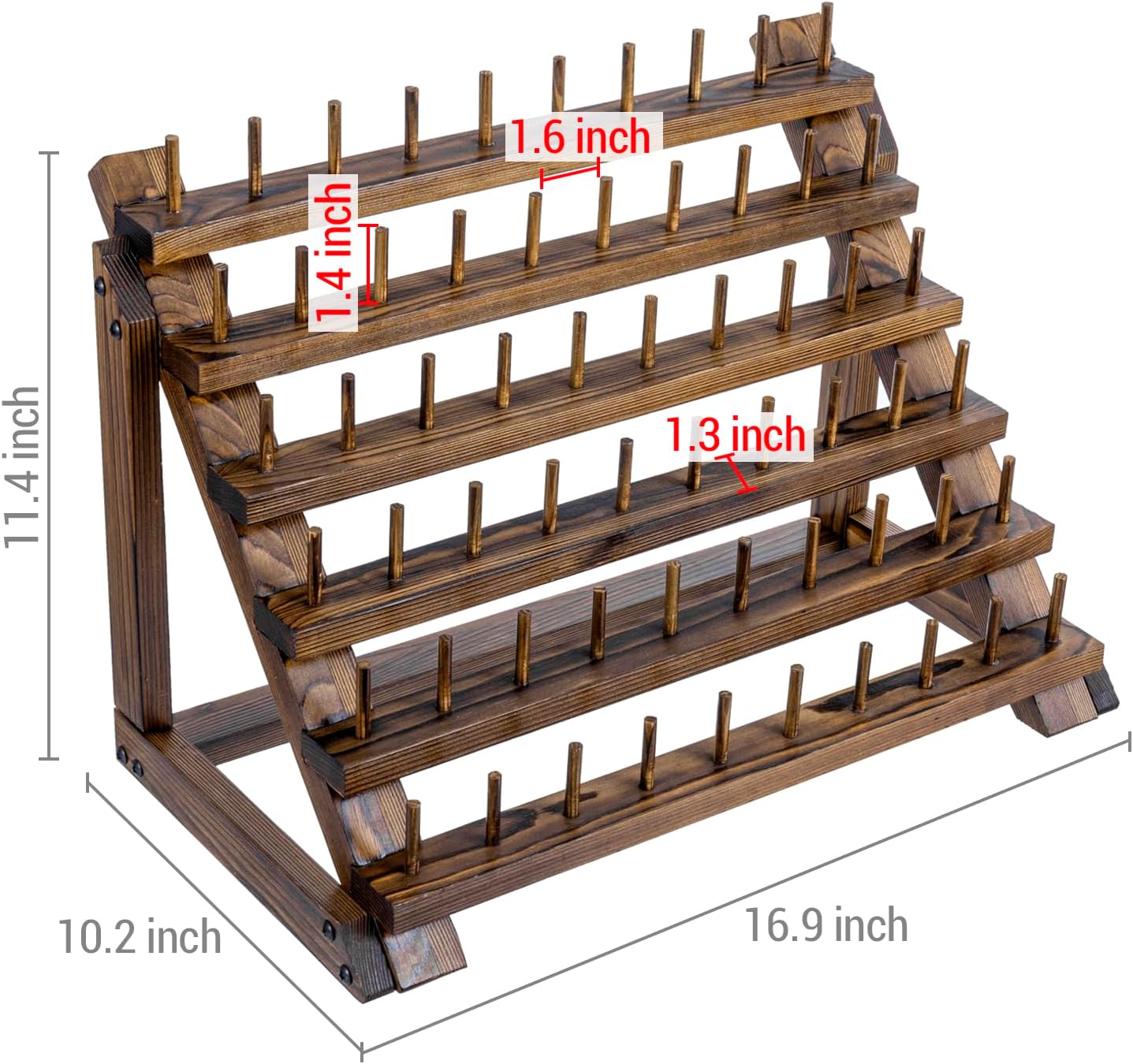60 Spools Rustic Burnt Solid Wood Tabletop Thread Storage Organizer Display Stand, Wooden Rack Spool Holder for Embroidery Quilting Craft Kit Threads