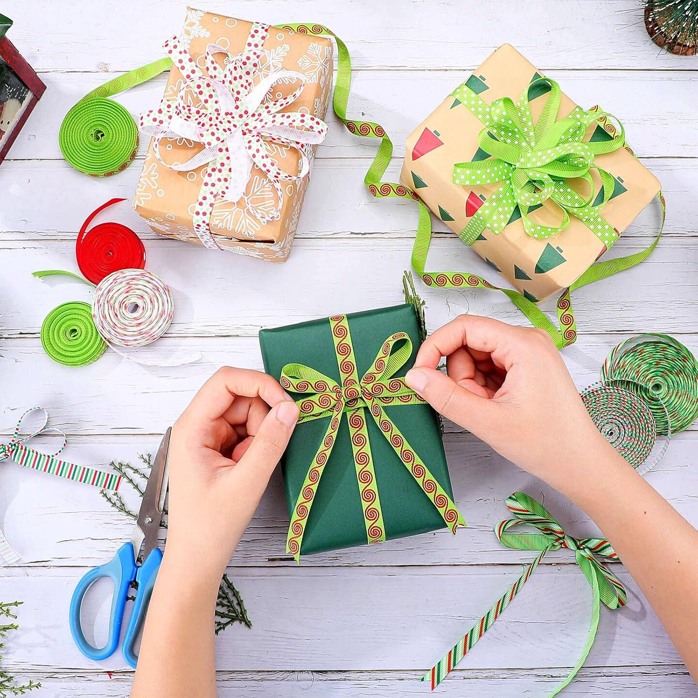 60 Yards 0.4 Inch Thin Christmas Ribbon Grosgrain Ribbon Red Green Dots Stripes Multi Rolled Xmas Gift Ribbon for Gift Wrapping Holiday Decoration DIY Crafts Christmas Ornaments