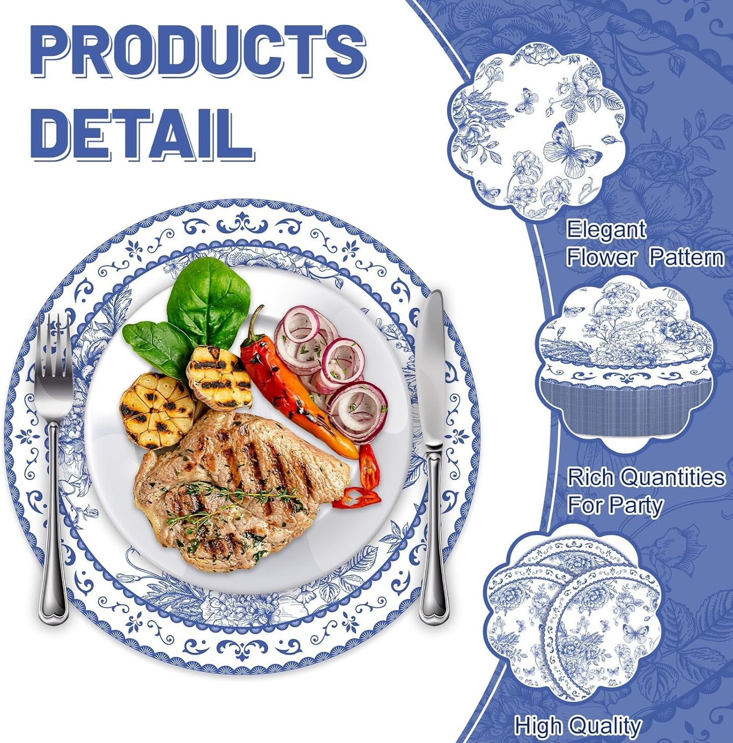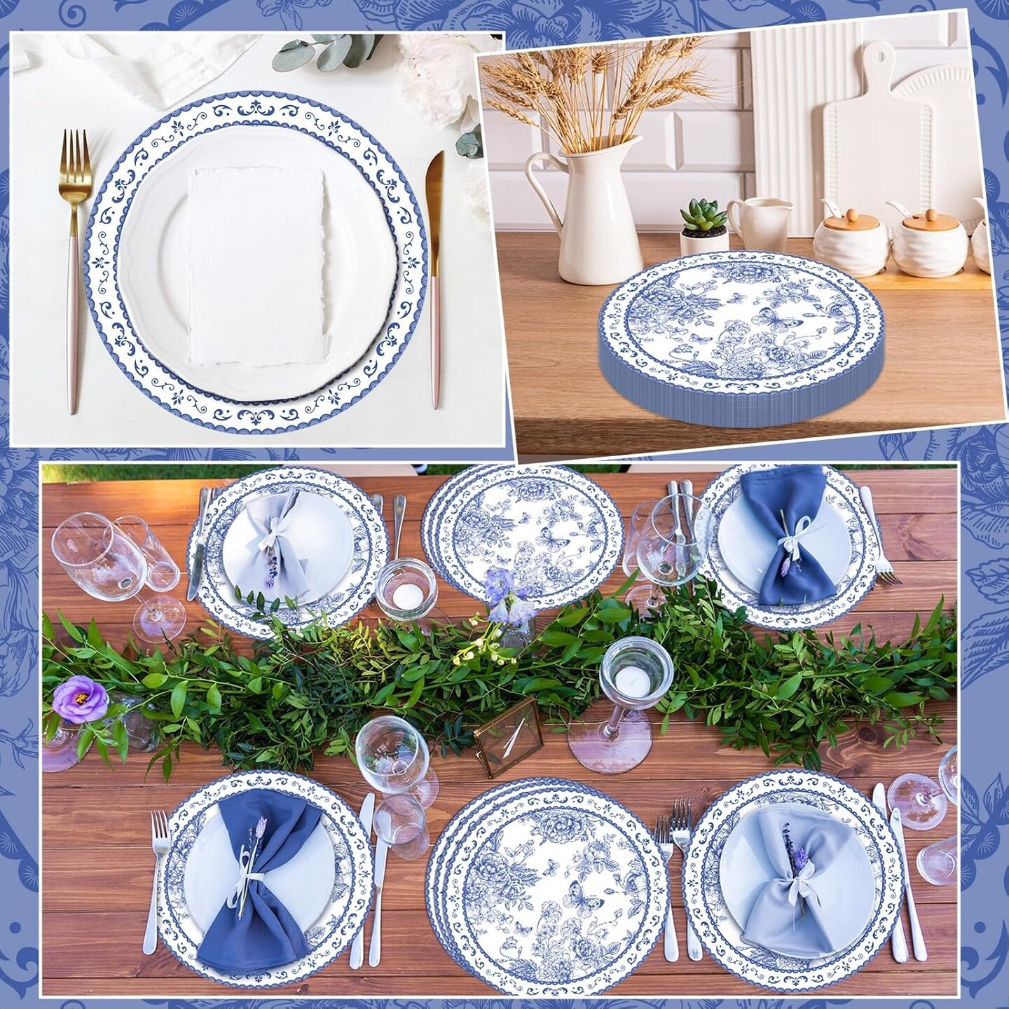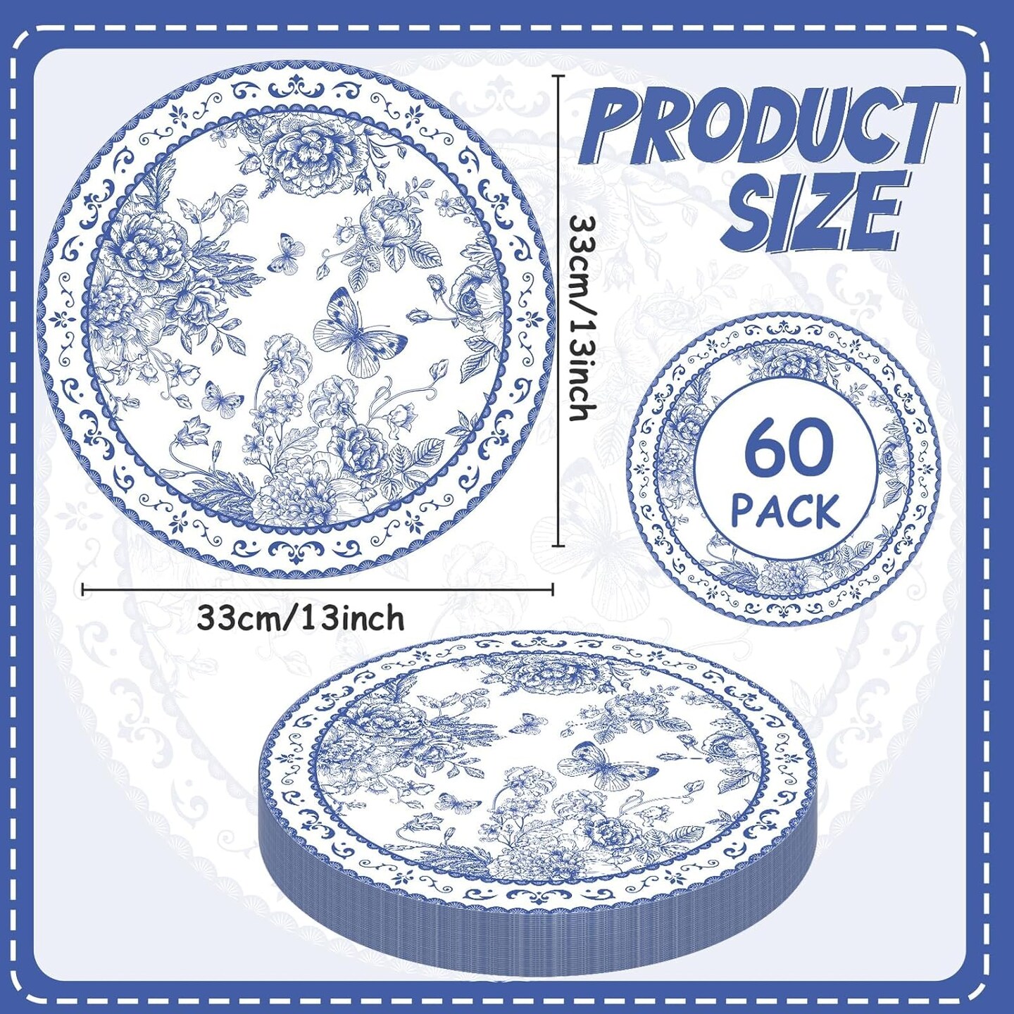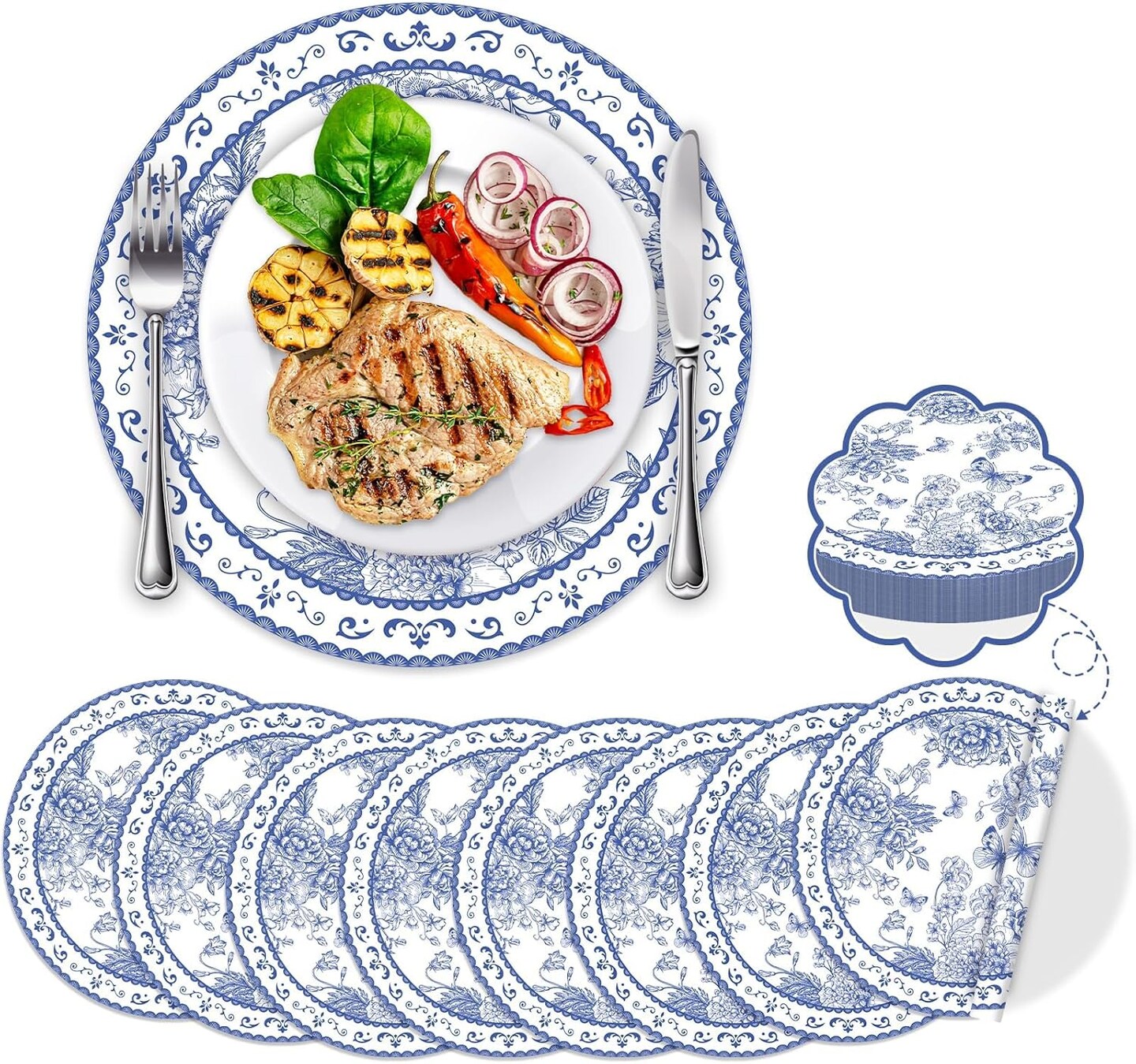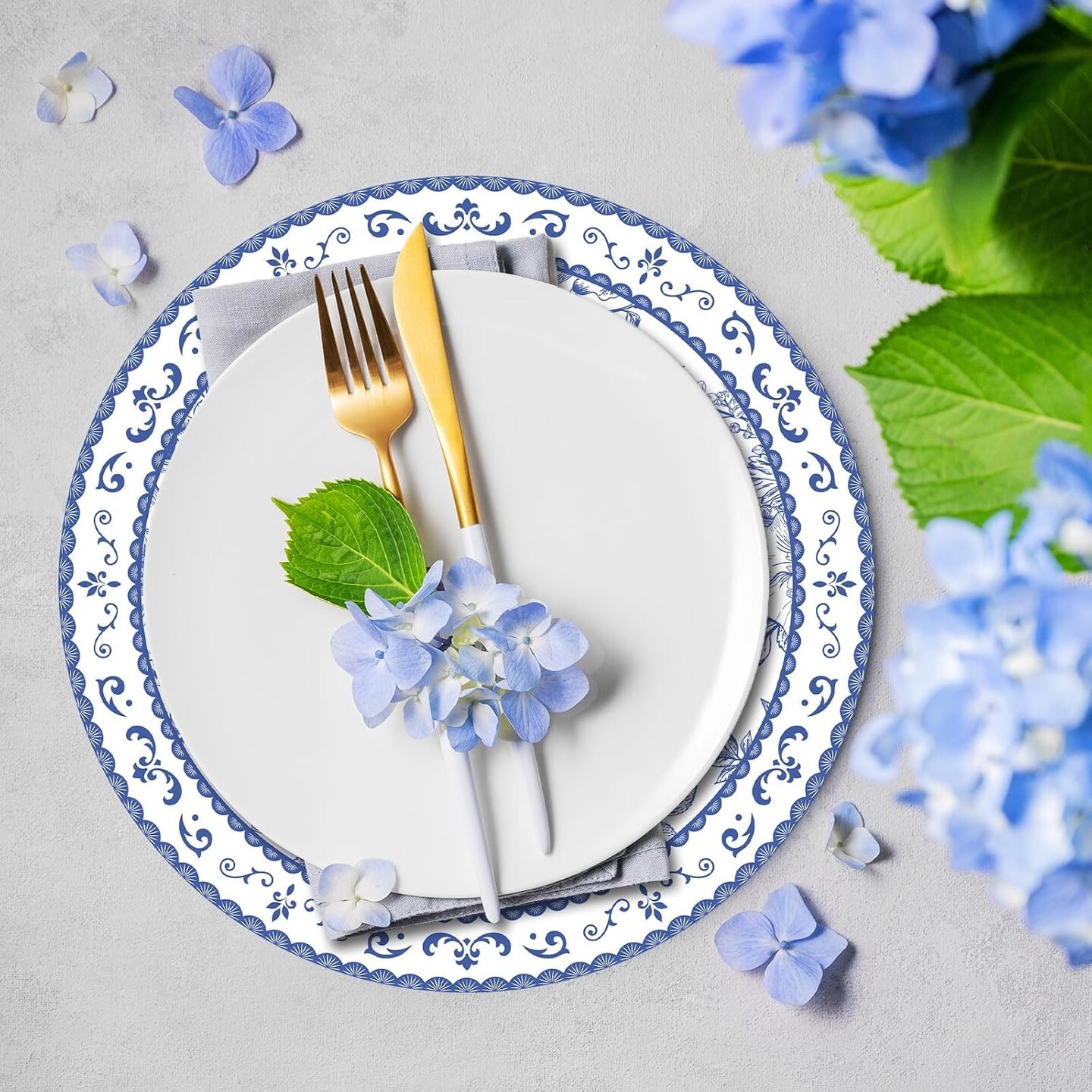 60PCS Blue Floral Paper Place Mats Disposable Vintage Blue Flower Placemats Chinoiserie Round Table Mat Spring Setting for Bridal Tea Wedding Birthday Party Supplies Dining Table Decor