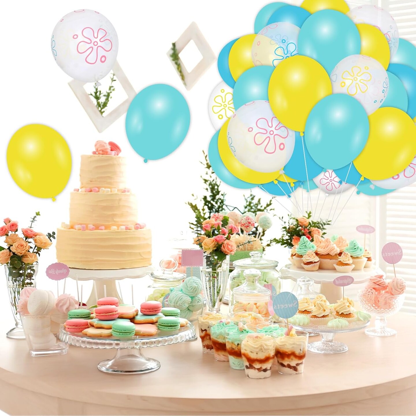 60Pcs Cartoon Sponge Party Balloon Bikini Flower Bubble Printed Latex Balloon Teal Blue Yellow Clear Balloon for Birthday Baby Shower Party Decor, 12 in