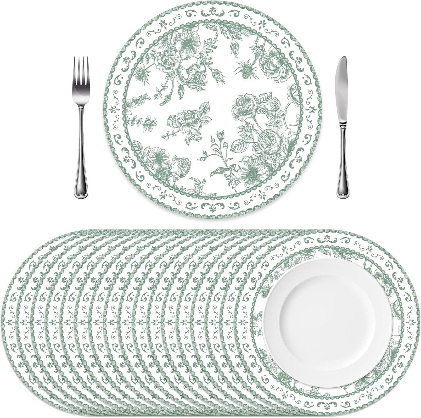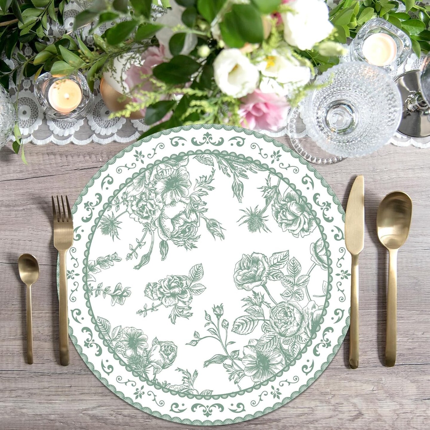 60PCS Sage Green Floral Paper Place Mats Disposable Vintage Green Flower Placemats Chinoiserie Round Table Mat Spring Setting for Bridal Tea Wedding Birthday Party Supplies Dining Table Decor