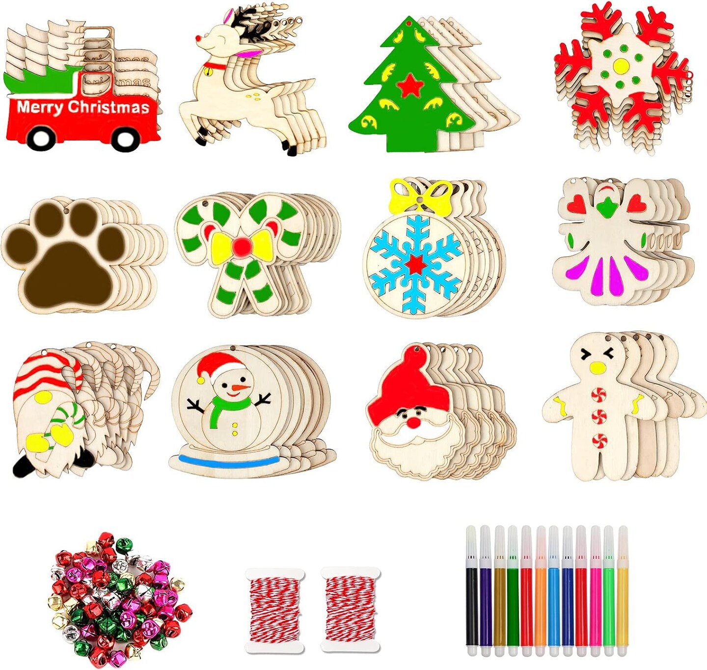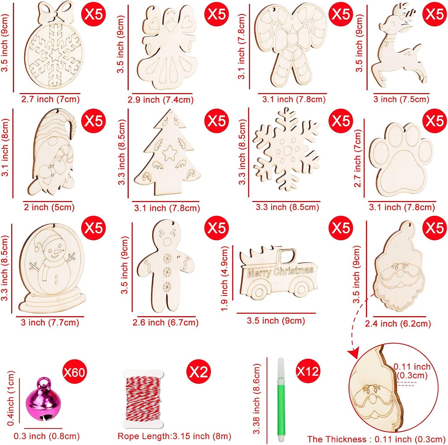 60pcs Wooden Christmas Ornaments, 12 Styles Unfinished Wood Slice Ornaments, DIY Christmas Ornaments Set with Bells, Colored Markers and Ropes, for DIY Craft Making and Christmas Tree Ornaments