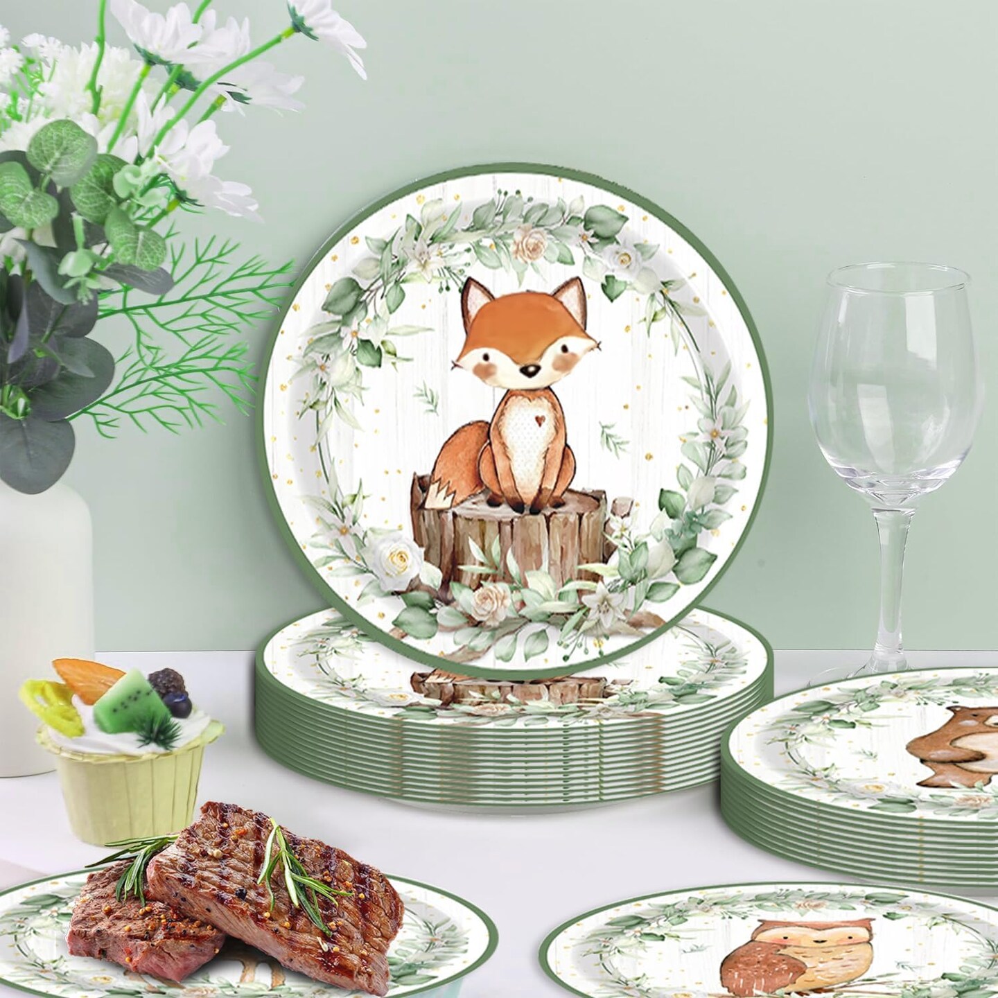 60Pcs Woodland Baby Shower Party Plates for 60 Guests (White and Green)