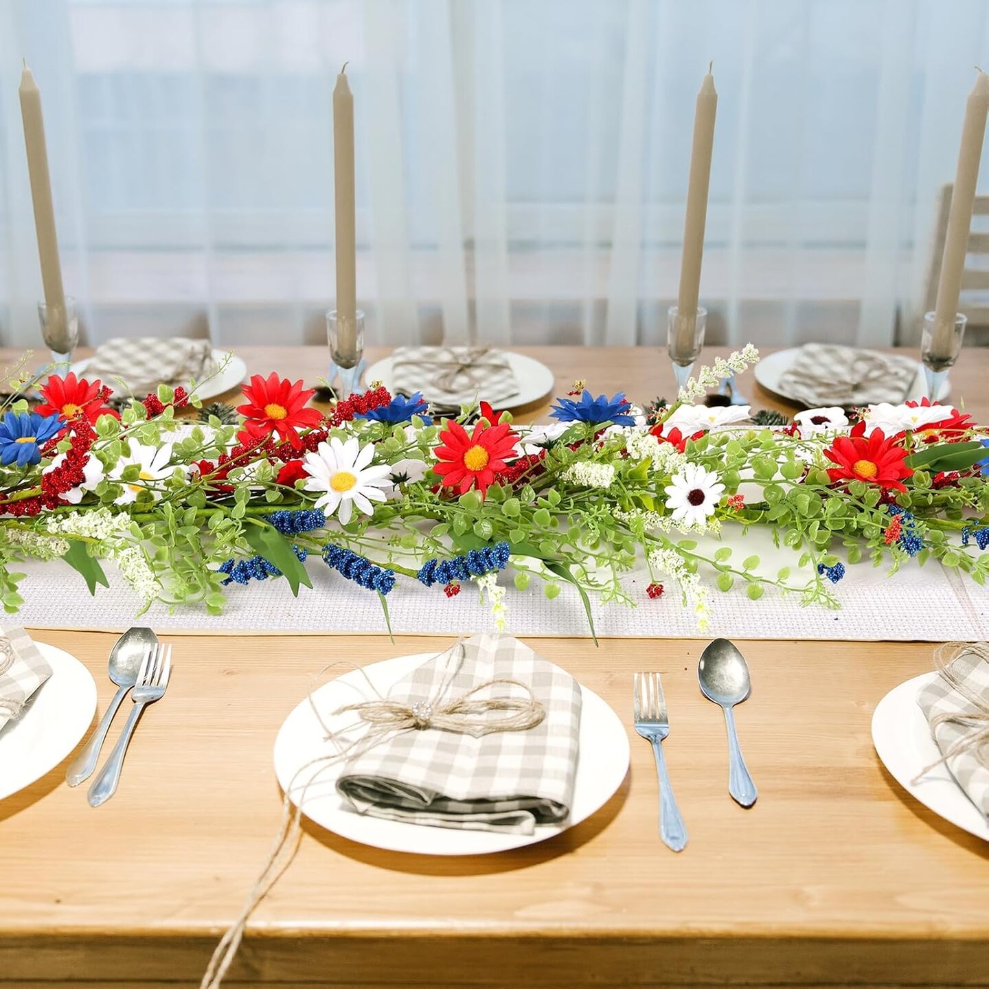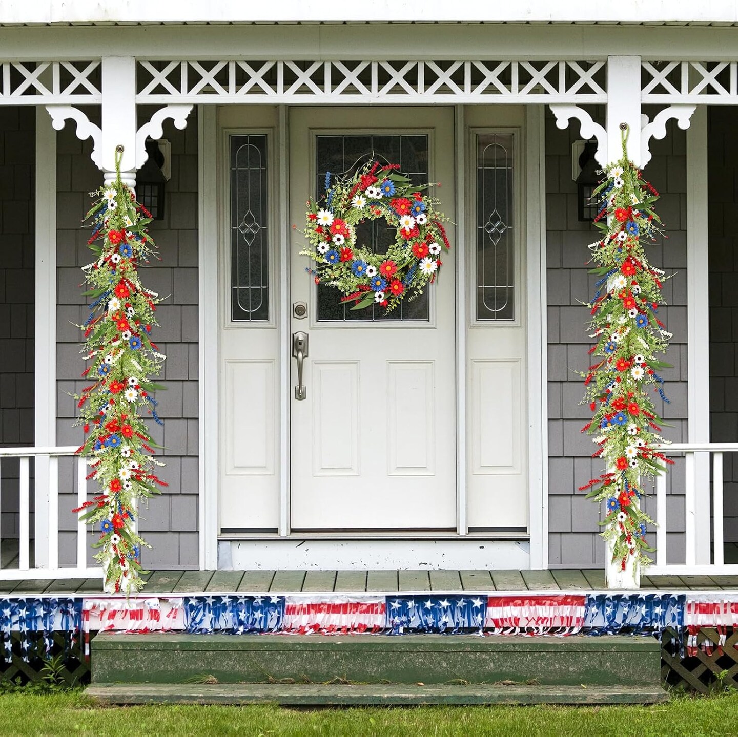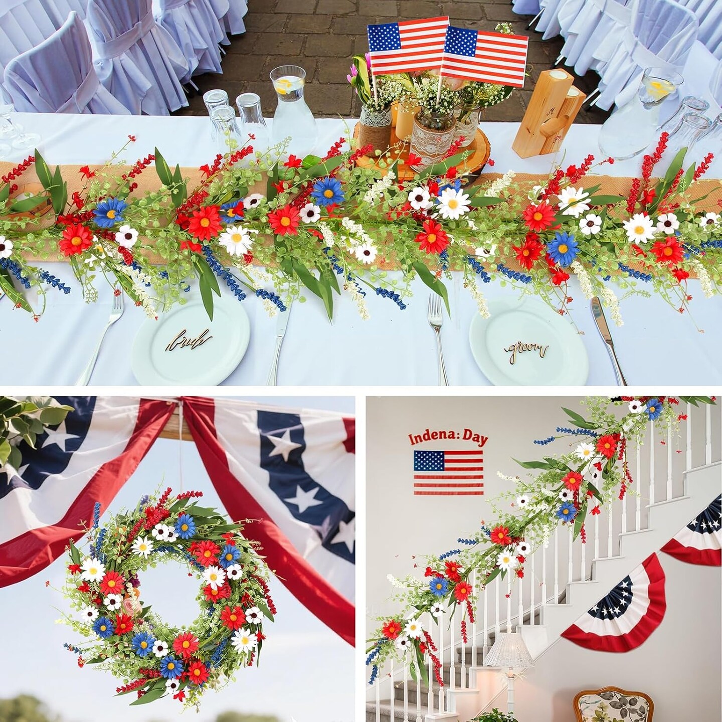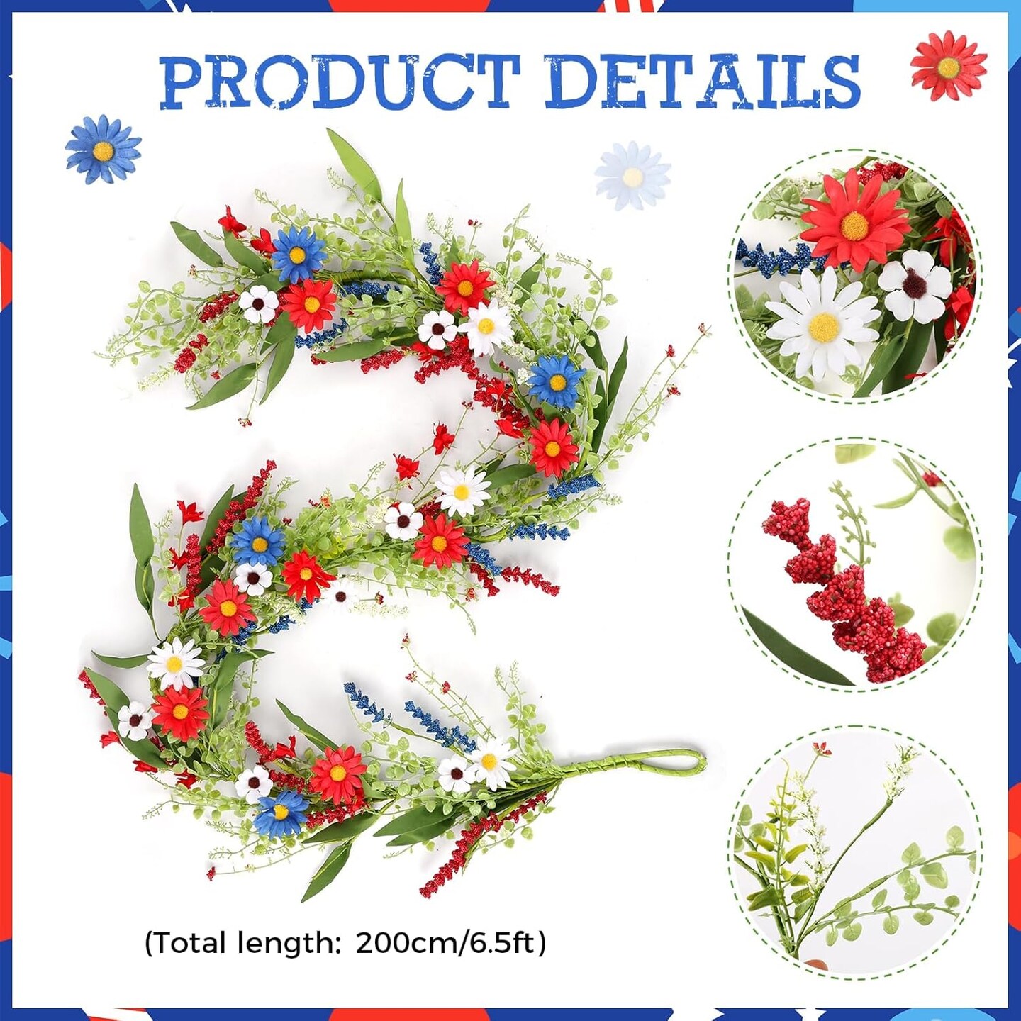6.56 Ft Patriotic Daisy Garland - Red, White, and Blue Floral Vine - Artificial Wildflower Garland for 4th of July Arches, Stairs, and Porch Decor - Americana Home Decor